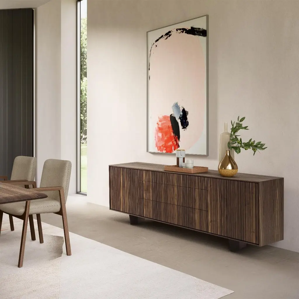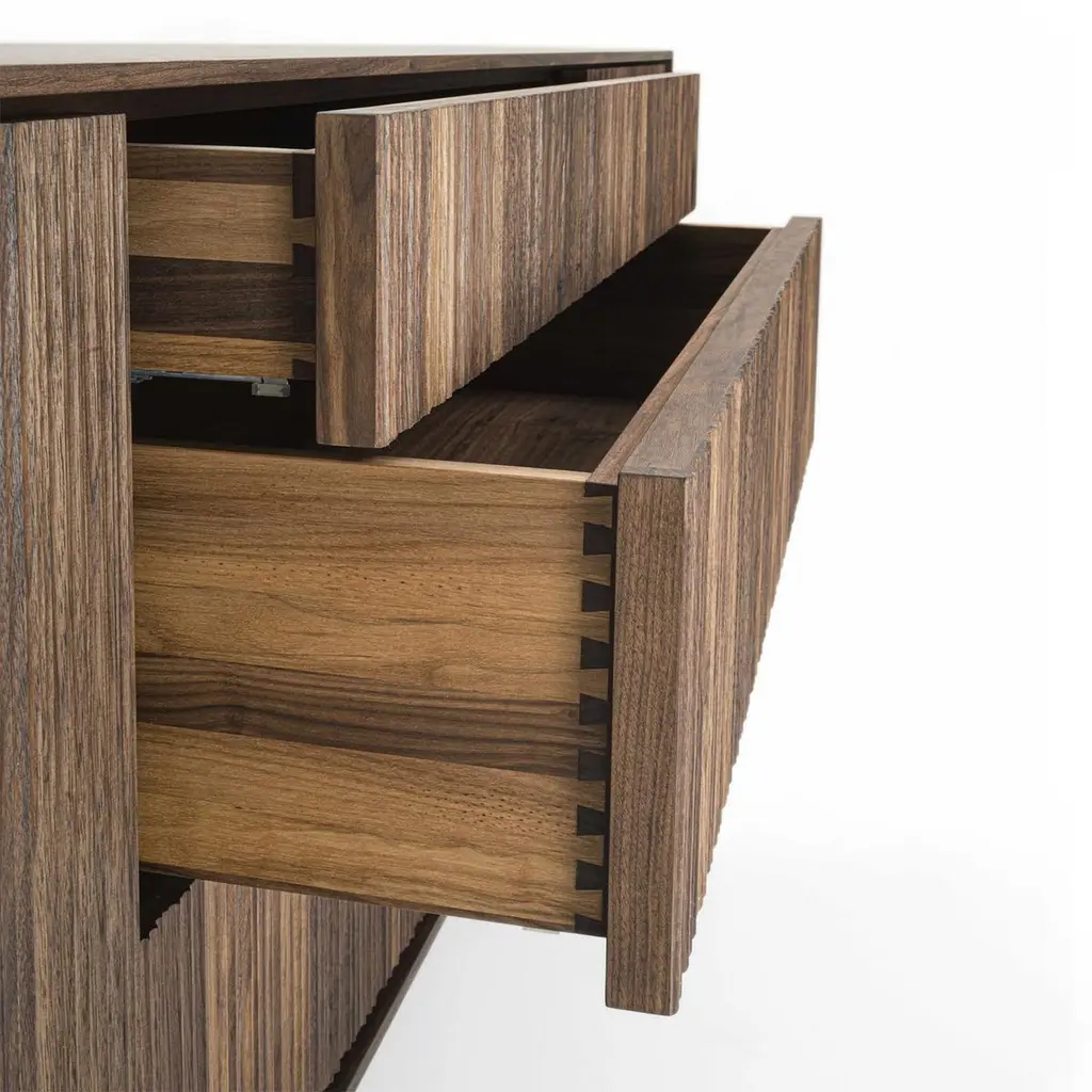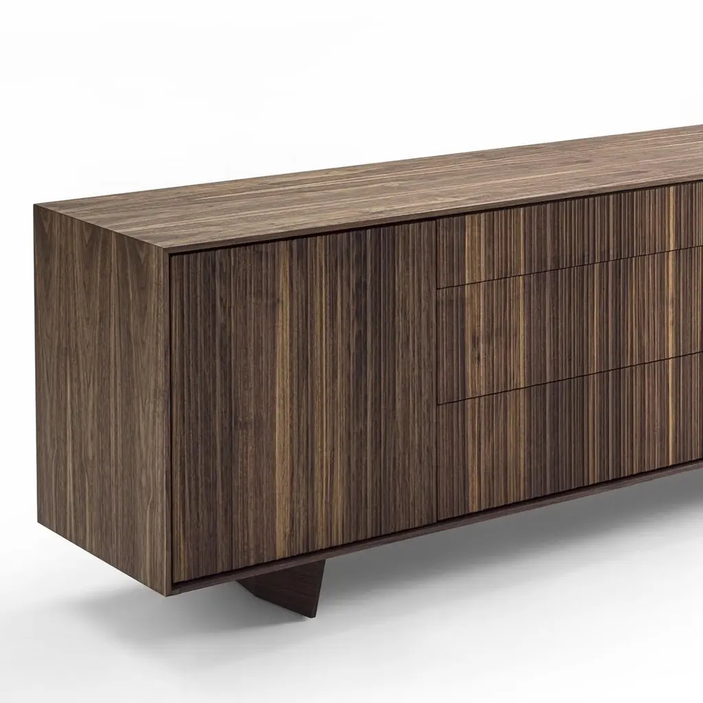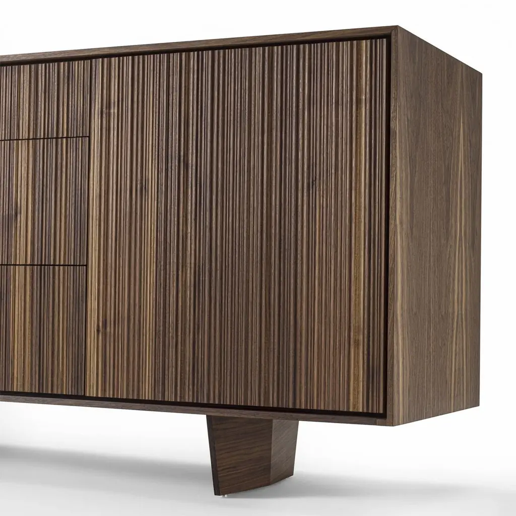 Sideboard Liama with solid walnut wood structure with vertical lines on front parts, with 2 doors and with 3 drawers with dovetail joints and with easy glide system.
