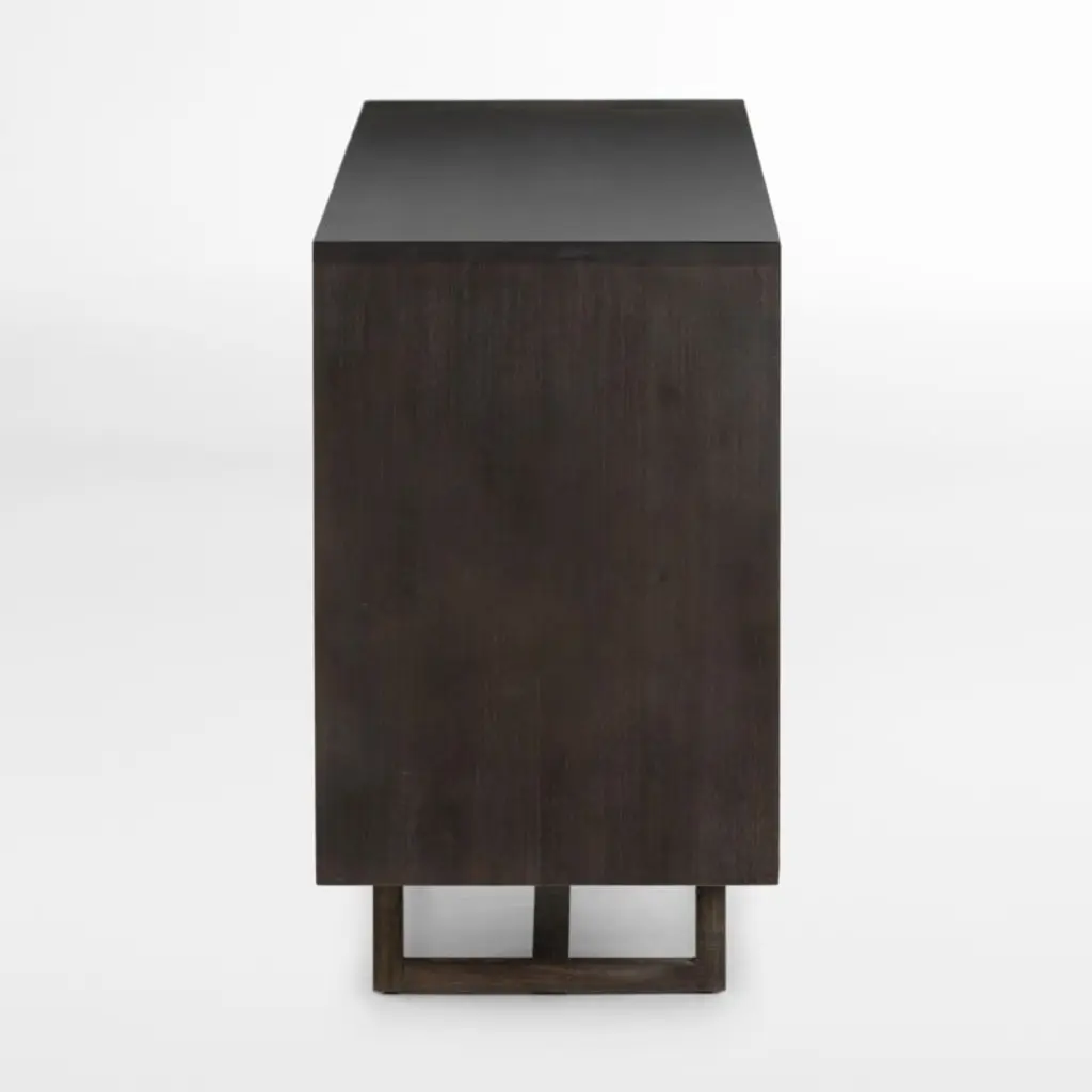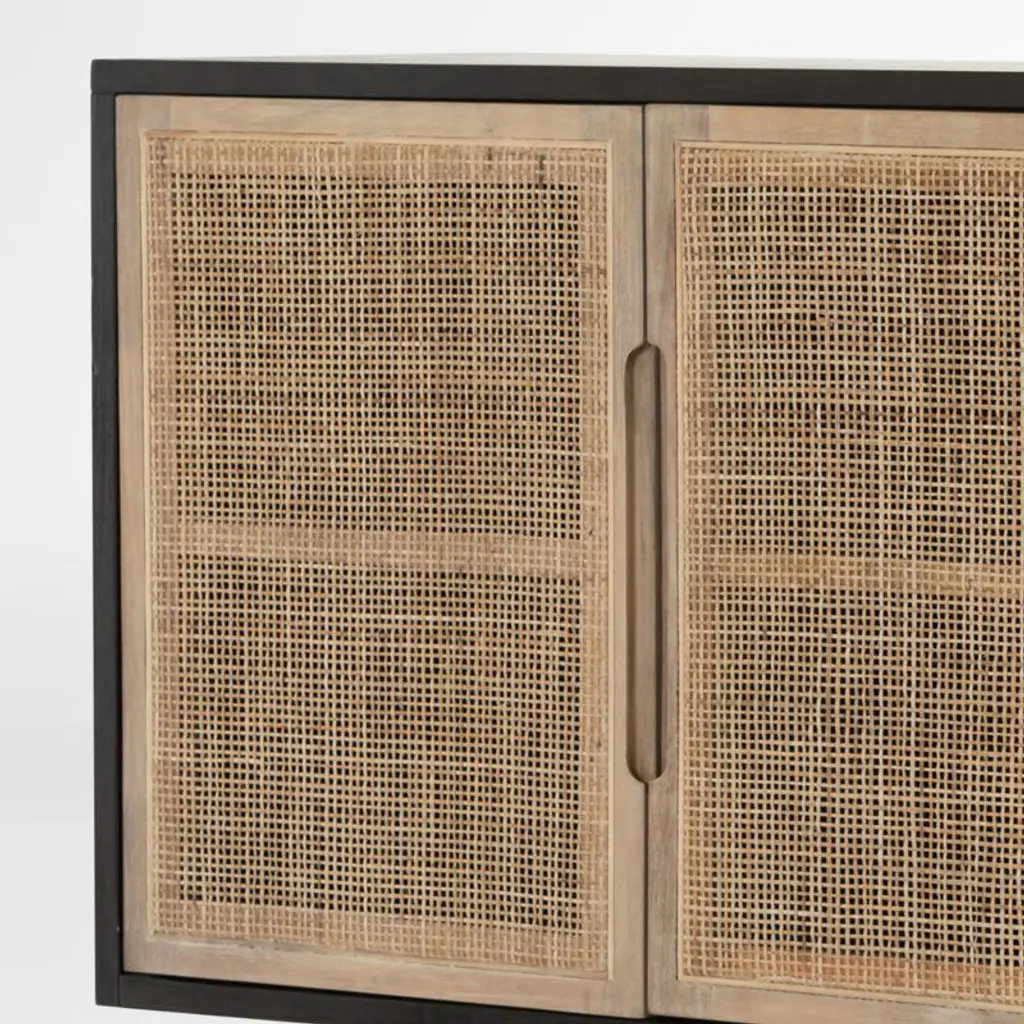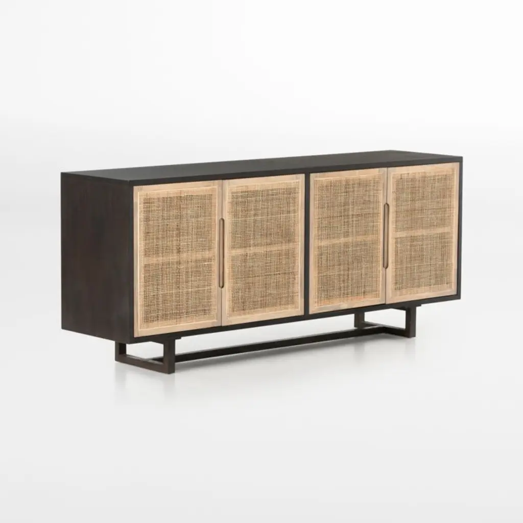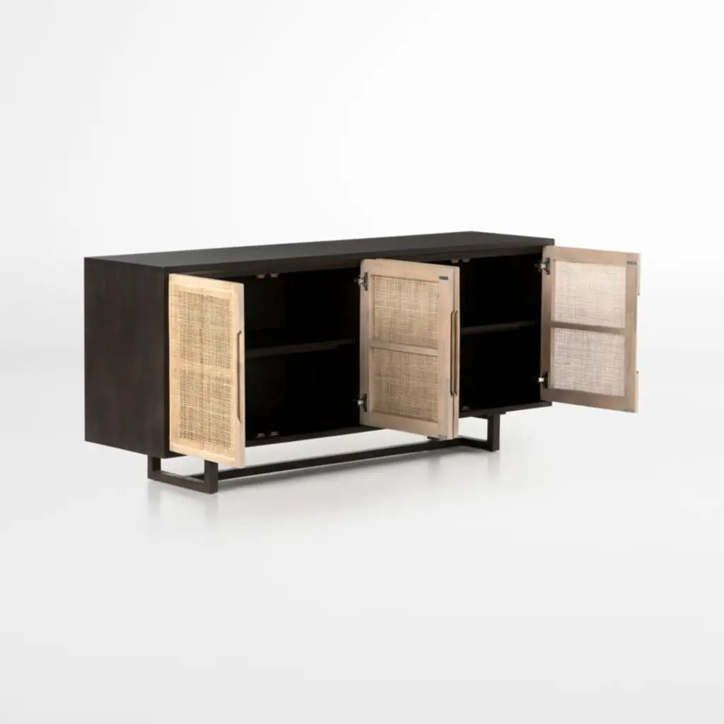 Linear meets coastal in Libby. Framed in black-finished mango wood, the credenza gets a breezy boost from woven cane door fronts. Long vertical pulls and an open trestle base enhance the geometric silhouette, while the cane's relaxed weave provides a veiled glimpse of what's stored inside. Each double-doored cabinet opens to a single adjustable shelf to house dinnerware, serving pieces or table linens. The Libby black credenza is a Crate & Barrel exclusive.