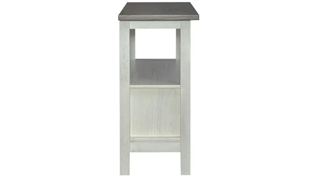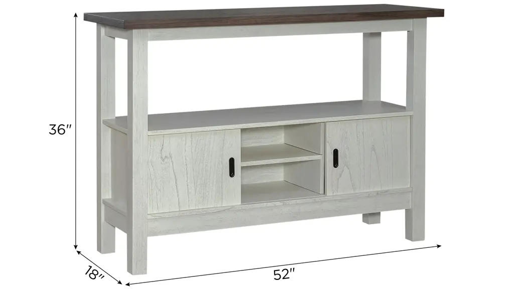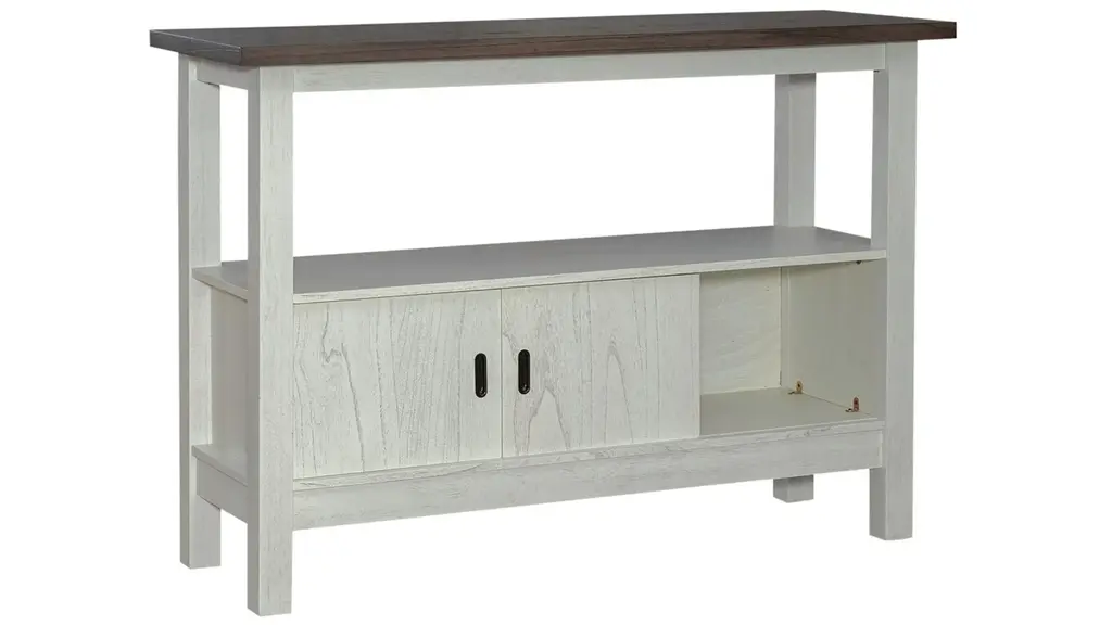 Liberty Sideboard features a two-tone Carbon Gray and Textured White finish. There are two sliding doors accented with Black Metal finger pull hardware sitting below a large open shelf that is ideal for extra storage or display items. Behind the sliding doors is an adjustable center shelf and two side storage compartments. The sideboard is anchored by square block legs. Feel comfortable and elegant at the same time with the Brook Bay sideboard.