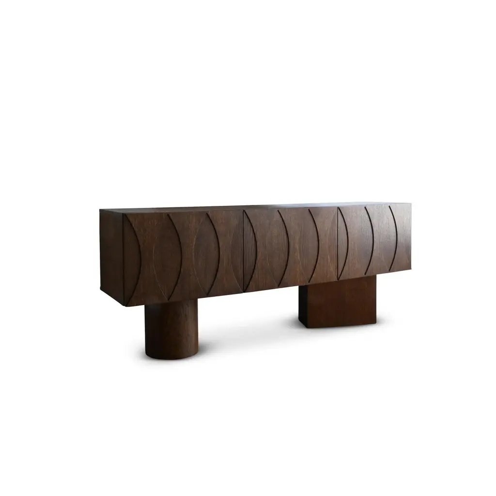 LIBRA Sideboard – Elegance with Distinctive Character The LIBRA Sideboard is functional sculpture—a powerful design anchored by two solid pillars and doors adorned with rhythmic, organic patterns. The warmth of wood and the subtle interplay of light on its carved surfaces add depth and tranquility to your interior. Intriguing at first glance, this piece commands attention effortlessly, without the need for additional adornment.