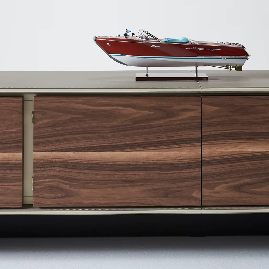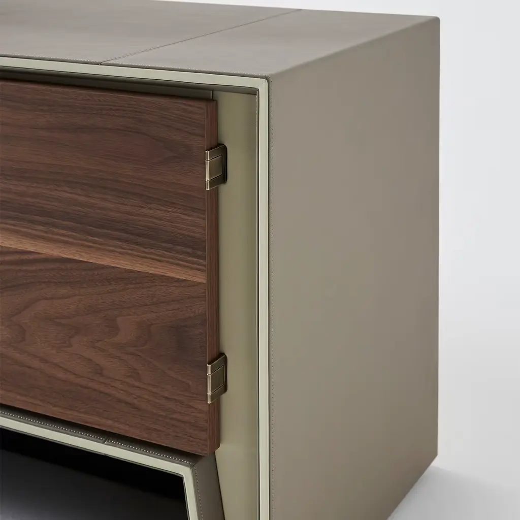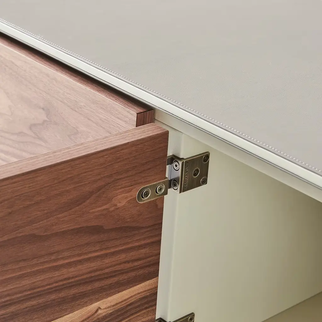 Prized color-contrasting upholsteries - combining authentic and faux leather - elegantly counterbalances the minimalist rigor characterizing this sideboard. Specially milled brass hinges equip the wooden doors, which showcase hypnotizing natural veins uninterrupted thanks to their J-groove handles. A luxurious addition to refined interiors of modern and contemporary inspiration.