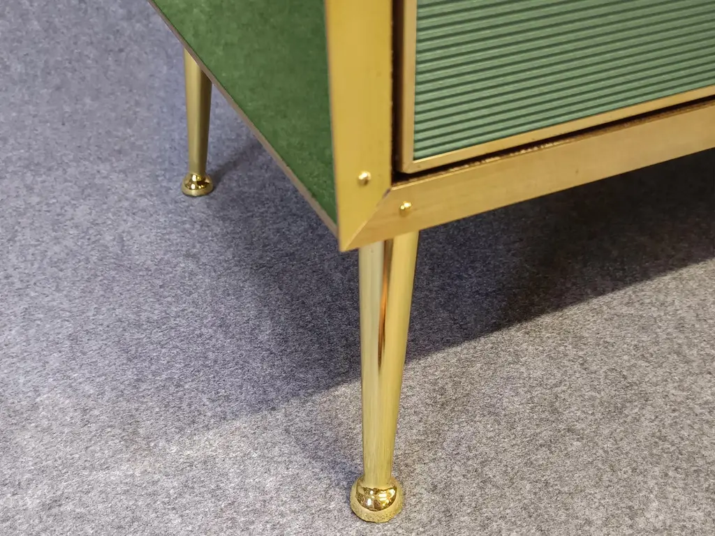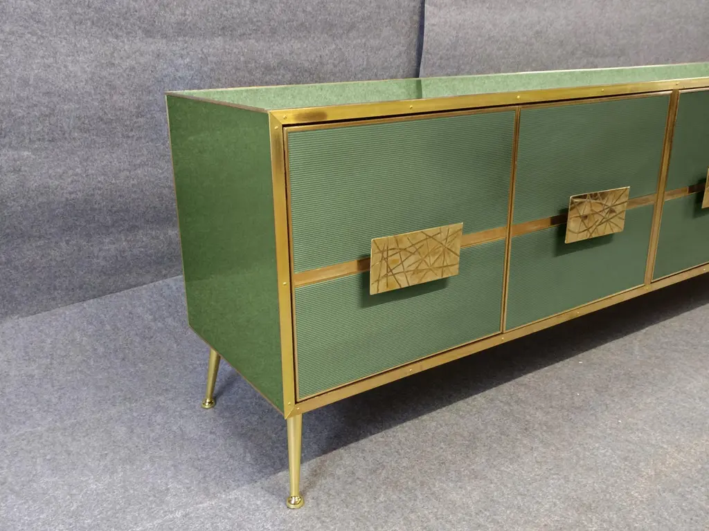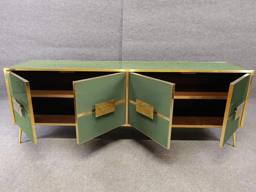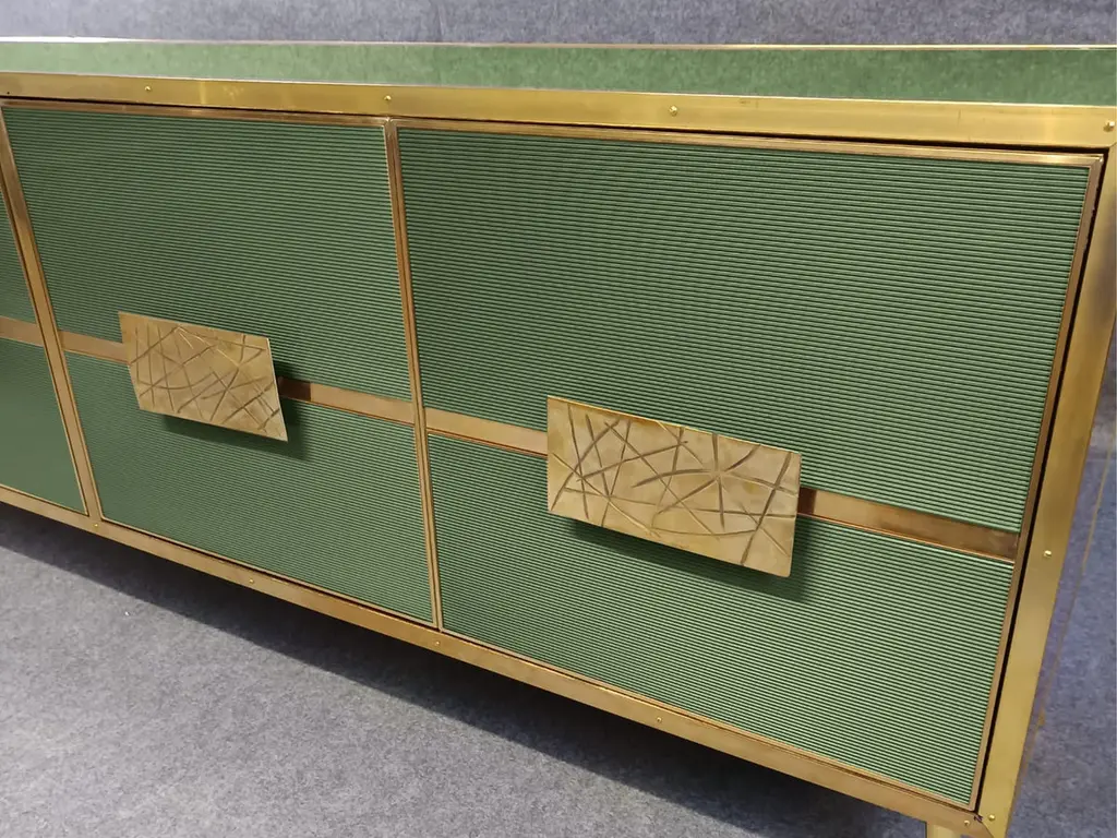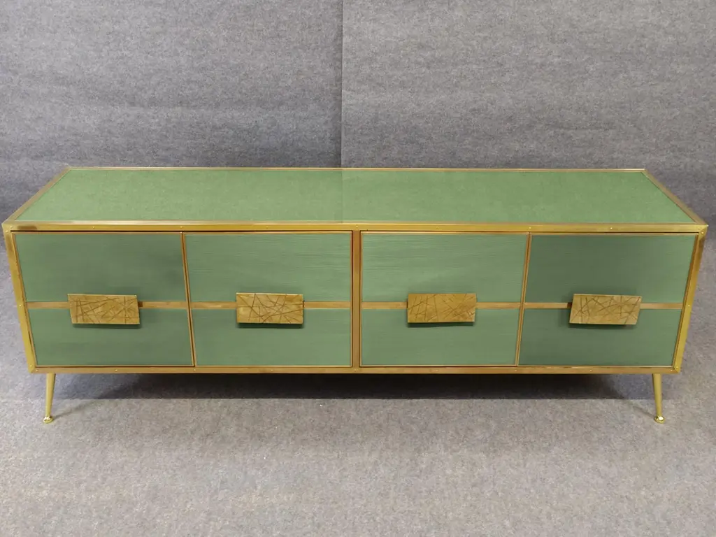This exquisite Italian sideboard in light green birch is a masterpiece of mid-century modern design. Handcrafted with meticulous attention to detail, it features four beautiful 'Grisinato' Murano glass doors with intricate patterns. The combination of birch wood, brass inlays and opaline glass creates a luxurious aesthetic that elevates any interior space.The sideboard's brass handles and polished trim add a touch of elegance, while the vintage-style feet nod to classic design. Crafted using techniques such as hand carving, engraving and welding, this sideboard represents the best of Italian craftsmanship. With a production time of 7-8 weeks, this sideboard is a testament to the craftsmanship and dedication required to create truly exceptional furniture.