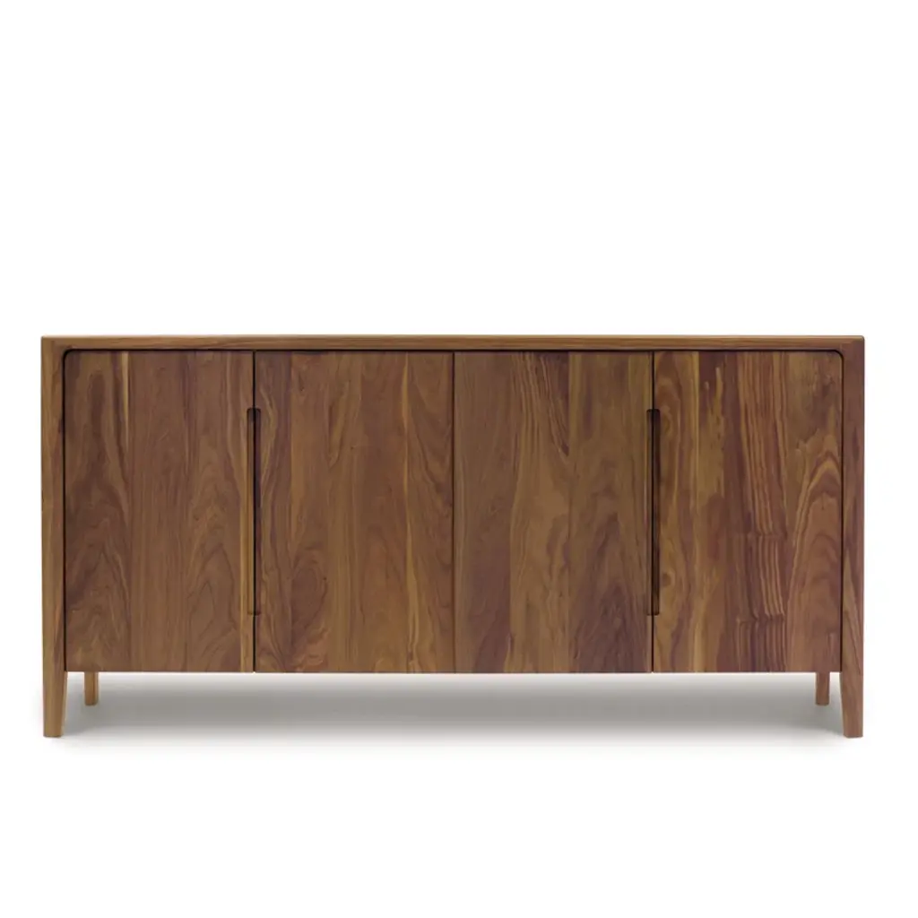 Subtle urban references adorn this stunning modern-style sideboard by David Knott. Raised on legs marked by convex profiles, the bold structure in oil-finished knotted walnut seduces with the intricate and unrepeatable traces of its grain, extending uninterrupted also thanks to the groove design of the four front doors' handles. A top frame finished in brushed steel accents the piece.