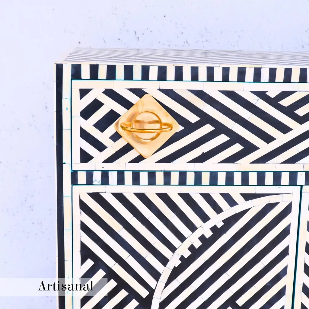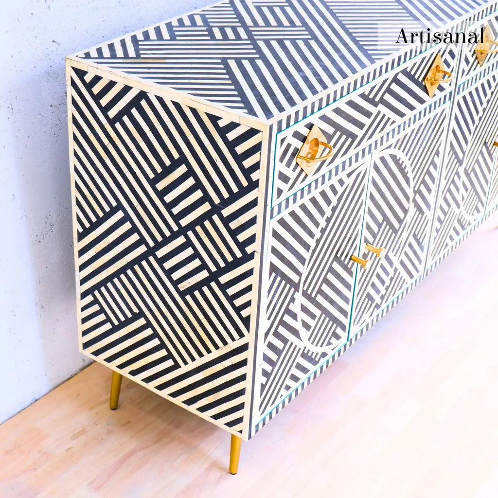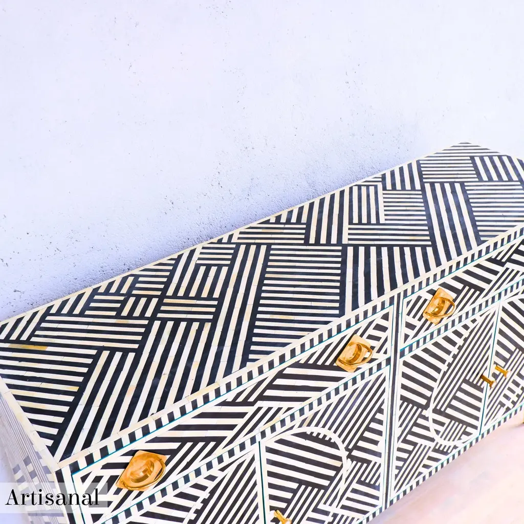 Elevate your home with Artisanal's exquisite black-and-white inlay sideboard —a stunning addition that seamlessly blends timeless craftsmanship with modern sophistication.Adorned with intricate geometric-stripe patterns, this sideboard showcases the artistry of traditional bone inlay, honoring the ancient craft of decorated furniture. Finished with sleek brass-finished metal legs and knobs, it exudes a contemporary charm while retaining its classic allure.How It’s Made:Handcrafted with meticulous care, each piece is a true masterpiece, created through a traditional inlay process. It features over 2,000 small pieces of bone, carefully shaped into leaf or custom patterns. Each piece is precisely glued onto the surface to form the intricate design, followed by the application of color to enhance its beauty.Handcrafted in India by the artisans of Artisanal.For added safety during transit, we pack the legs and knobs separately, ensuring your chest arrives in pristine condition.Indulge in luxury and elevate your space with our bone inlay chest—a masterpiece that exudes elegance and sophistication, making it the perfect centerpiece for any dining or living room.At Artisanal, our mission is to revive and preserve India’s traditional arts by blending age-old techniques with contemporary design. Every piece we create is a testament to this philosophy, merging the beauty of the past with today’s functionality and aesthetics.For the past six years, with a team of skilled artisans and innovative designers, we’ve crafted every item in-house to ensure the highest quality and attention to detail. Our timeless pieces are designed not only for today but to be cherished for generations.