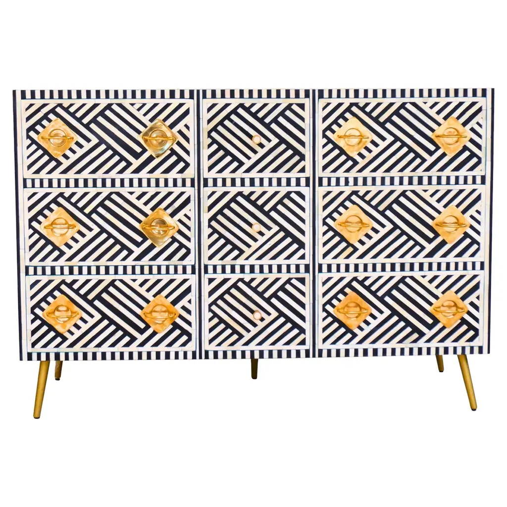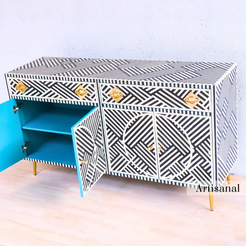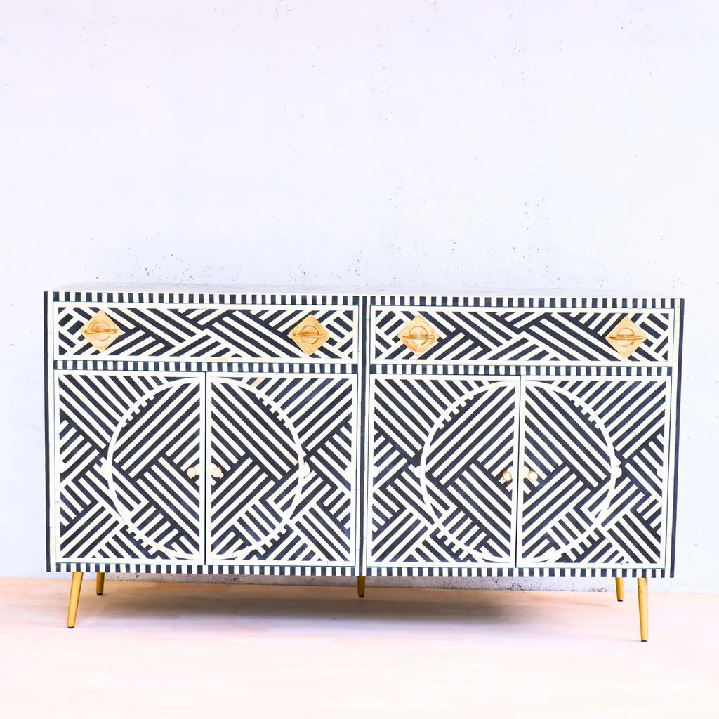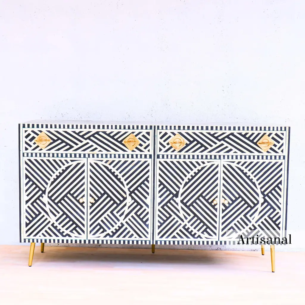 Elevate your home with Artisanal's exquisite black-and-white inlay sideboard —a stunning addition that seamlessly blends timeless craftsmanship with modern sophistication.Adorned with intricate geometric-stripe patterns, this sideboard showcases the artistry of traditional bone inlay, honoring the ancient craft of decorated furniture. Finished with sleek brass-finished metal legs and knobs, it exudes a contemporary charm while retaining its classic allure.How It’s Made:Handcrafted with meticulous care, each piece is a true masterpiece, created through a traditional inlay process. It features over 2,000 small pieces of bone, carefully shaped into leaf or custom patterns. Each piece is precisely glued onto the surface to form the intricate design, followed by the application of color to enhance its beauty.Handcrafted in India by the artisans of Artisanal.For added safety during transit, we pack the legs and knobs separately, ensuring your chest arrives in pristine condition.Indulge in luxury and elevate your space with our bone inlay chest—a masterpiece that exudes elegance and sophistication, making it the perfect centerpiece for any dining or living room.At Artisanal, our mission is to revive and preserve India’s traditional arts by blending age-old techniques with contemporary design. Every piece we create is a testament to this philosophy, merging the beauty of the past with today’s functionality and aesthetics.For the past six years, with a team of skilled artisans and innovative designers, we’ve crafted every item in-house to ensure the highest quality and attention to detail. Our timeless pieces are designed not only for today but to be cherished for generations.