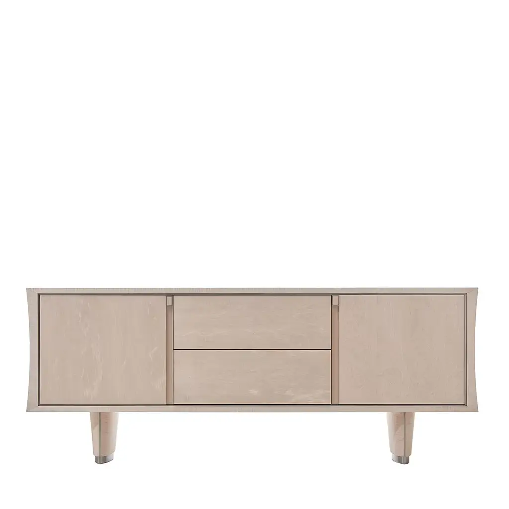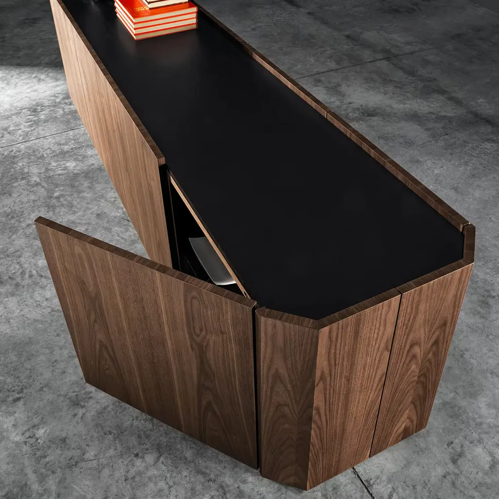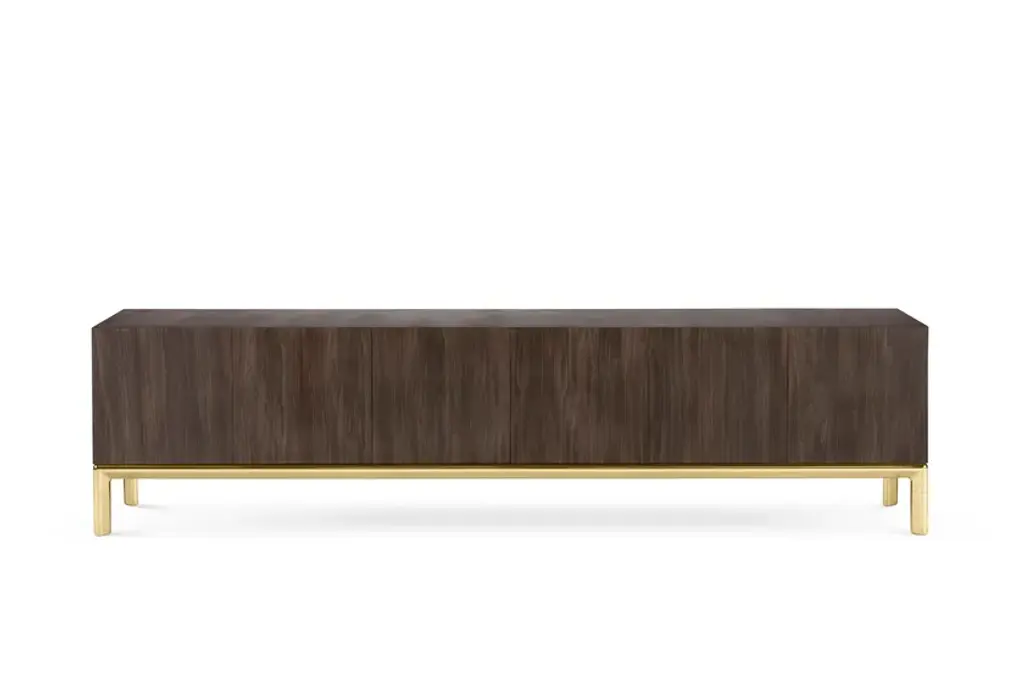 This stunning sideboard is more than a storage space. Its sleek allure combines geometric lines and exquisite materials that boast their natural flair. The cut corners of the silhouette create a jewel-like, octagonal shape in Canaletto walnut with a matte black top and plinth base in satin light brass. This piece is also available with two or three doors and in different materials and finishes, please ask the Concierge for details.