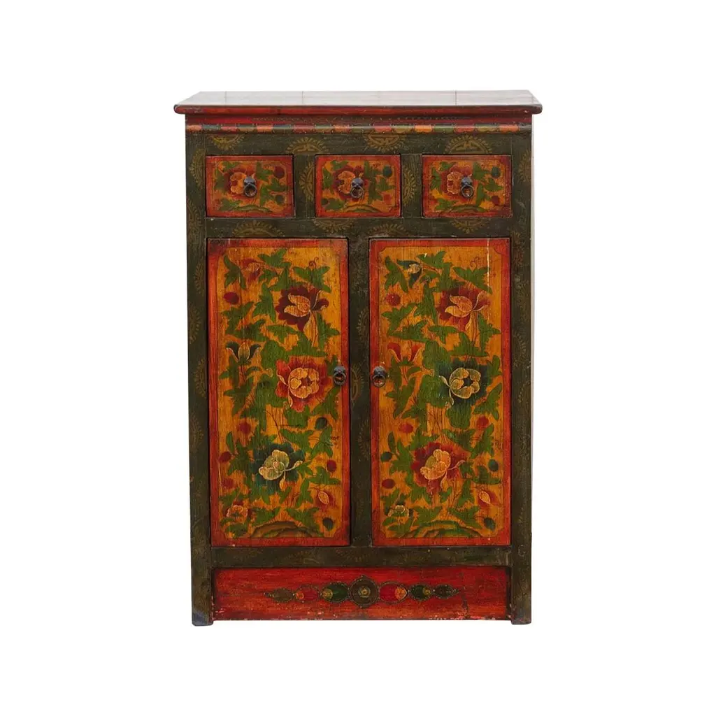 Dive into coastal charm with this captivating high-gloss turquoise blue painted cabinet. Clean lines and aged wood construction whisper tales of sun-bleached cottages and salty breezes. Open the double doors to reveal ample storage for beach trinkets, seashells, or your favorite novels. But the real magic lies in the charming floral scene, painted in delicate hues against the bright blue background.