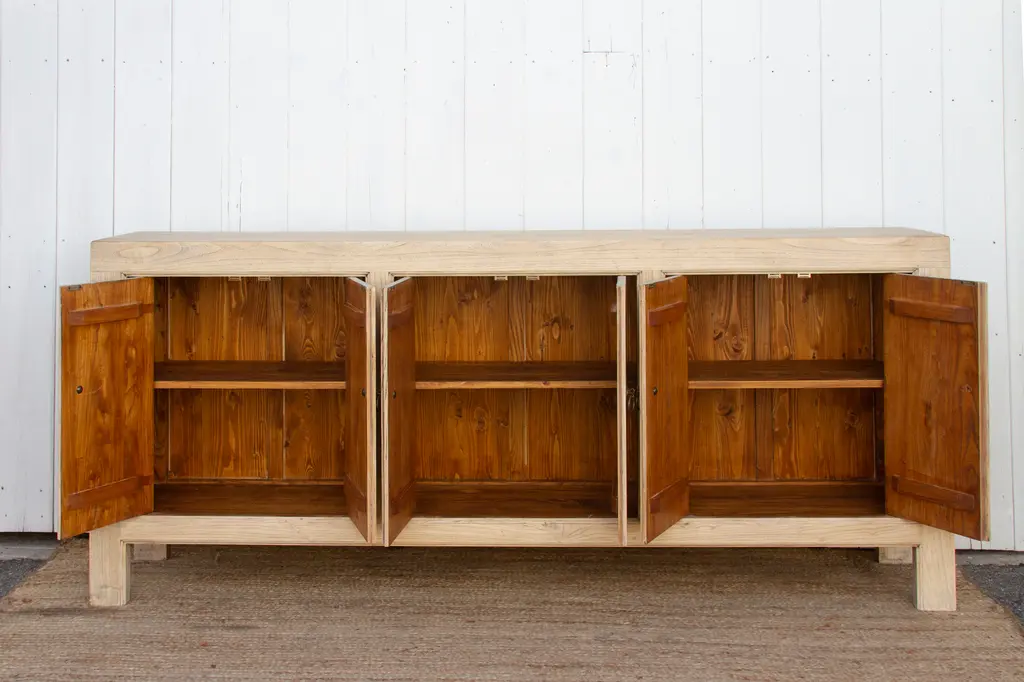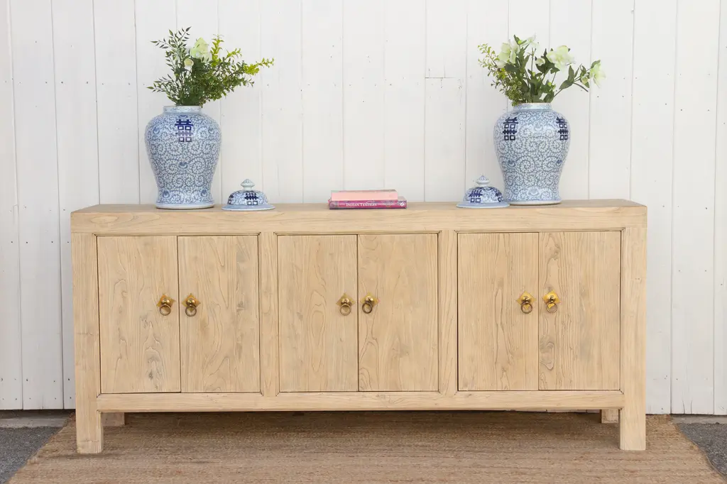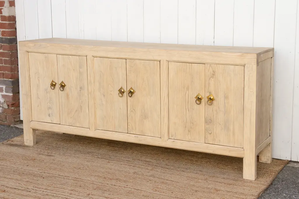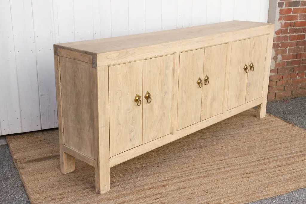 Old-world Asian sideboard, meticulously crafted from reclaimed elm and adorned with hand-cut bronze hardware. This long farmhouse-style sideboard seamlessly marries clean lines with a rustic smoky distressed finish. Handmade with tenon and mortise construction, this Asian sideboard cabinet not only exudes craftsmanship but also offers ample storage with six cabinet doors and interior shelves. The rustic modern farmhouse design adds character, showcasing the beautiful grain.