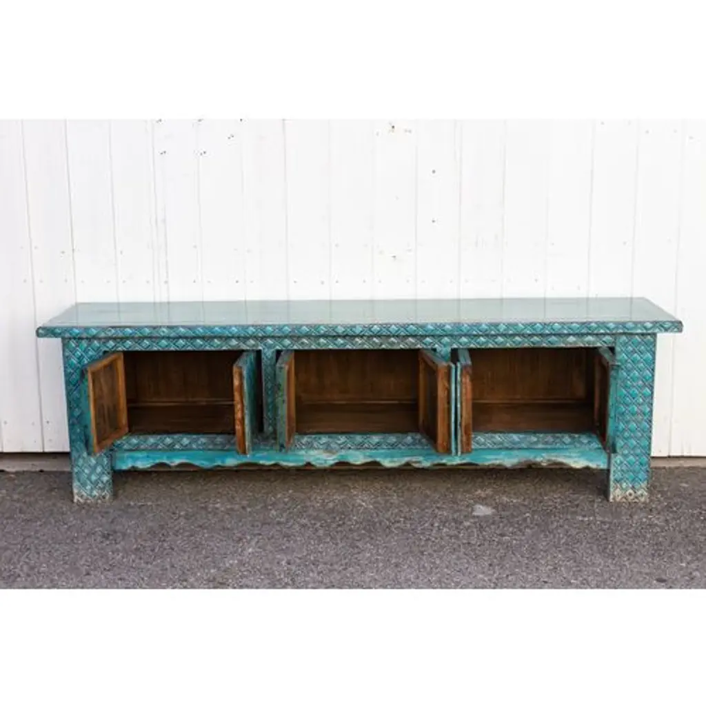 A long beautifully carved sideboard with six doors. This long cabinet is made from reclaimed wood and features a vivid blue painted finish. A long and low rustic sideboard credenza with a diamond motif carving and shaped apron across the front.