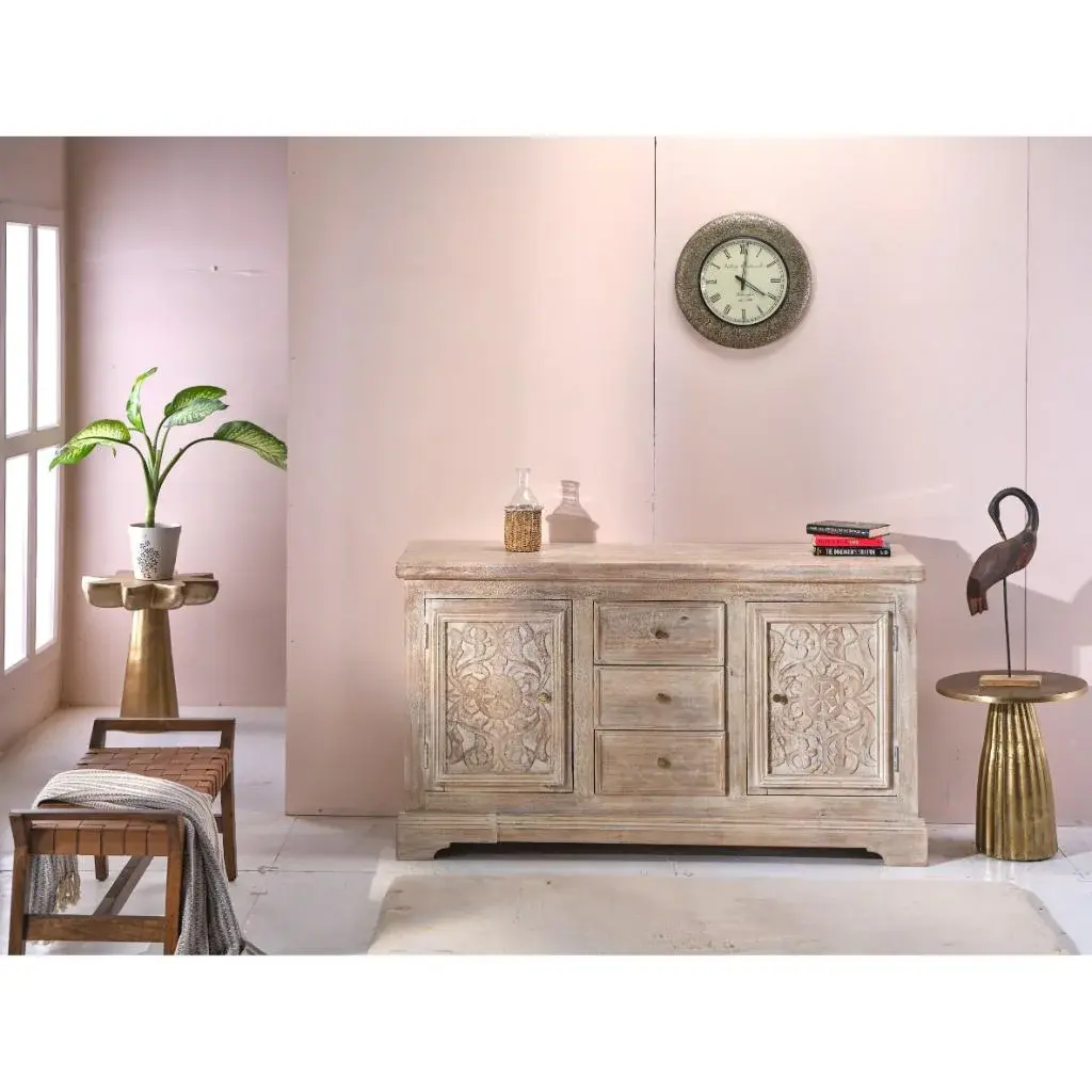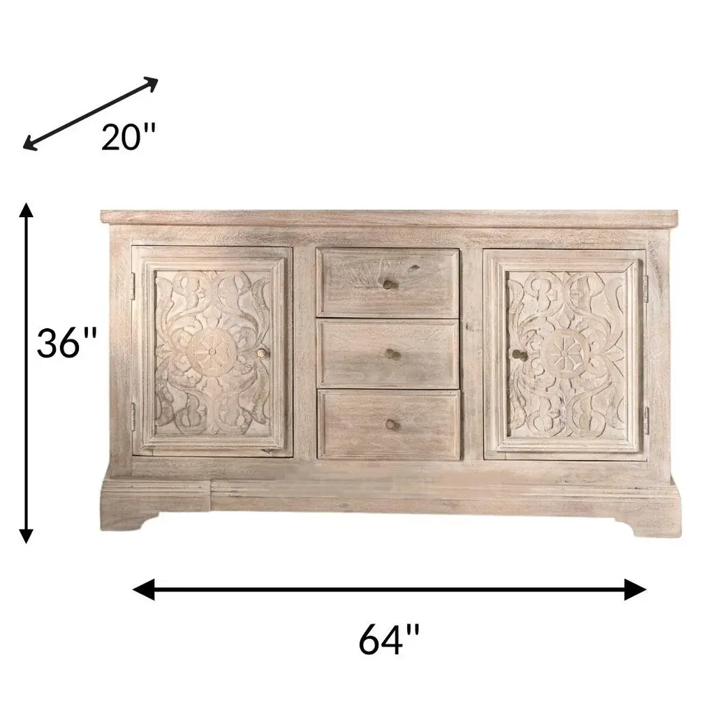 The Olyndra Two Door Wood Sideboard by LOOMLAN brings both function and style to any space. Crafted from quality wood, this sideboard stands out with its classic brown finish, fitting seamlessly into various decor themes. Its design includes two doors and drawers, offering ample storage options for organizing your dining essentials, linens, or even office supplies. The robust construction assures durability, making it a lasting addition to your home. This sideboard is not just about storage; it also serves as an elegant piece of furniture that enhances the aesthetic of any room. The spacious top is perfect for displaying your favorite decor items, from vases to family photos. Olyndra Two Door Wood Sideboard With Three Drawers Features: Overall Dimensions (WxDxH): 64 x 20 x 36 Color: Natural Material: Wood Features: Two doors and three drawers Includes: Drawers for added storage Style: Classic design Usage: Suitable for dining, living room, or hallway Functionality: Ample storage space Top Surface: Ideal for decor display