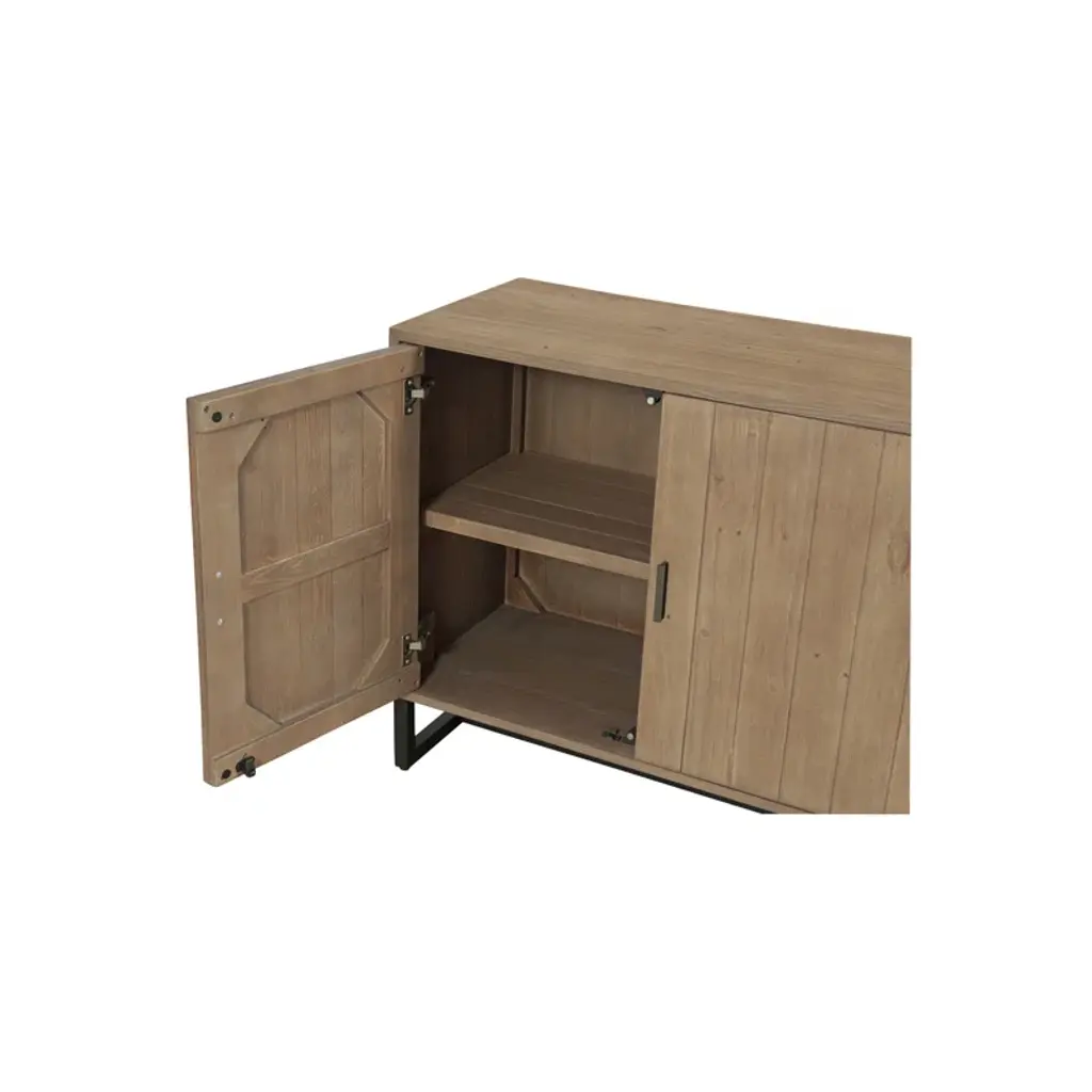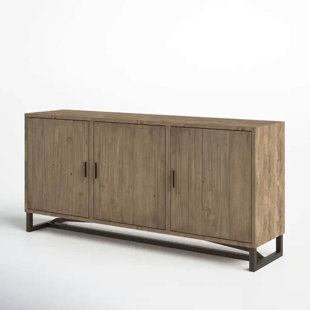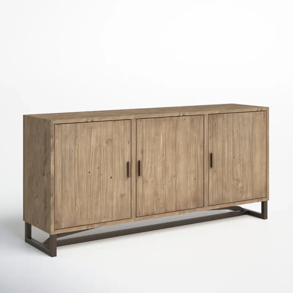 This clean-lined sideboard has bold proportions and a mix of materials for a modern, approachable look we love. It is made from wood and metal and it sits on two U-shaped legs with a center support. The cabinets are made from solid wood with a neutral finish that shows off the wood's grain color variation and knots. This sideboard has three drawers accented with slim bar pulls for a sleek touch. Inside each door, there are two shelves that are perfect for dinner party essentials. Plus? It arrives fully assembled.