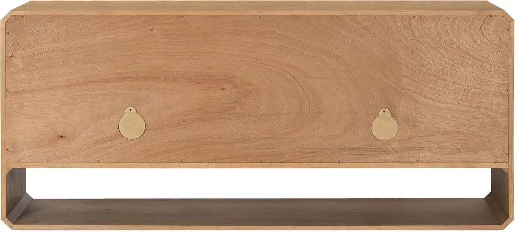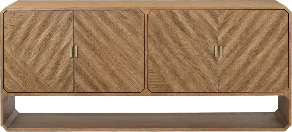 Pieces of ash veneer with narrow reeding are arranged to create a geometric motif spanning this sideboard's four doors. Adding to the '70s-inspired panache are chamfered edging and an open base that can be used as display space or for additional storage. Behind each pair of doors is an adjustable shelf and a rear cutout for cord management.