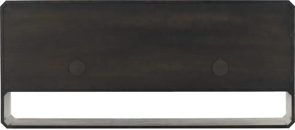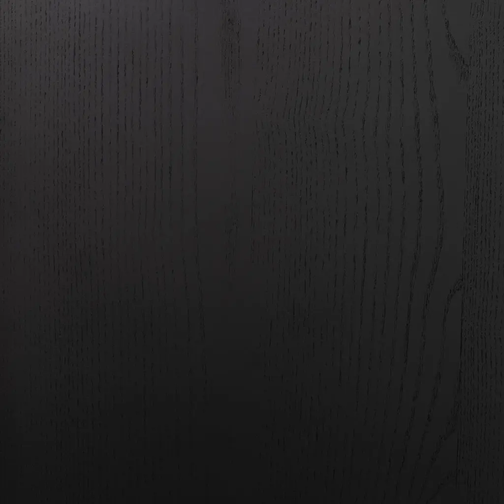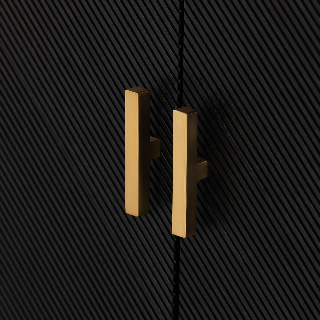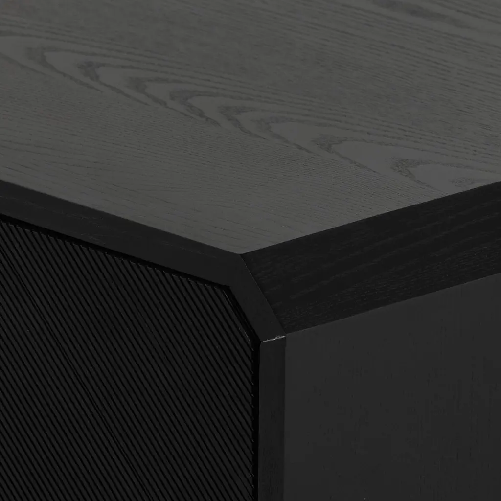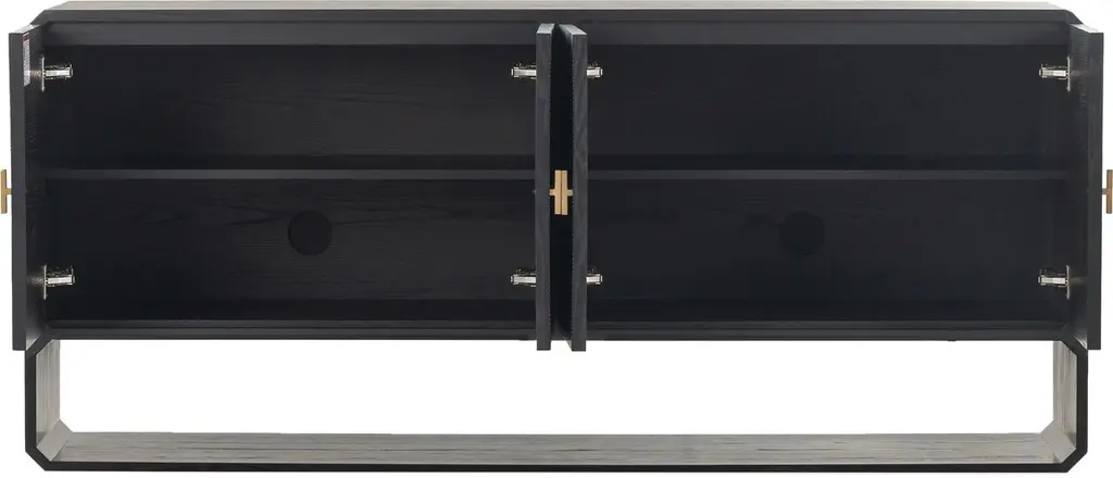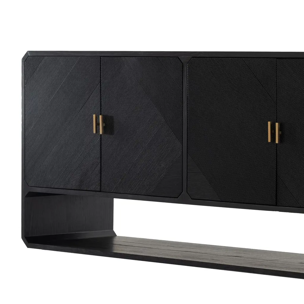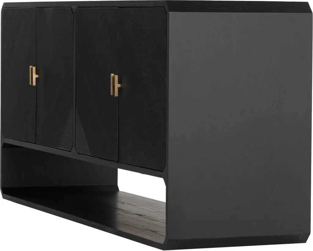 Pieces of ash veneer with narrow reeding are arranged to create a geometric motif spanning this sideboard's four doors. Adding to the '70s-inspired panache are chamfered edging and an open base that can be used as display space or for additional storage. Behind each pair of doors is an adjustable shelf and a rear cutout for cord management.