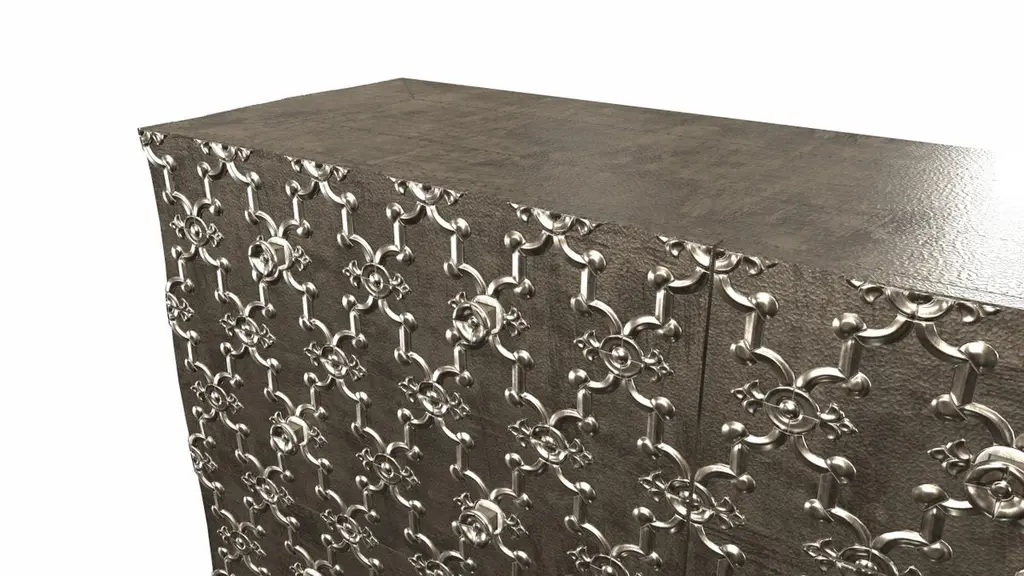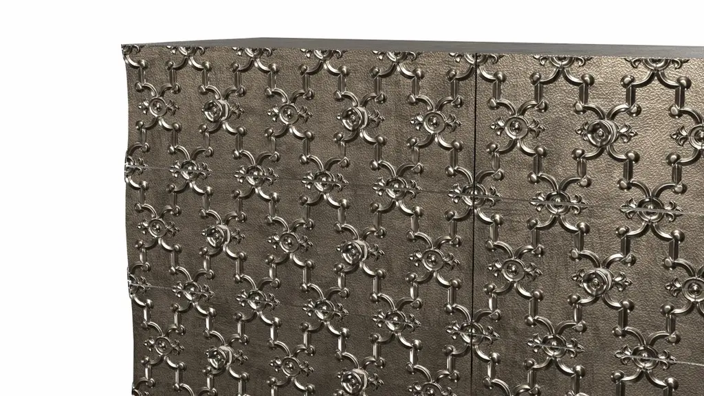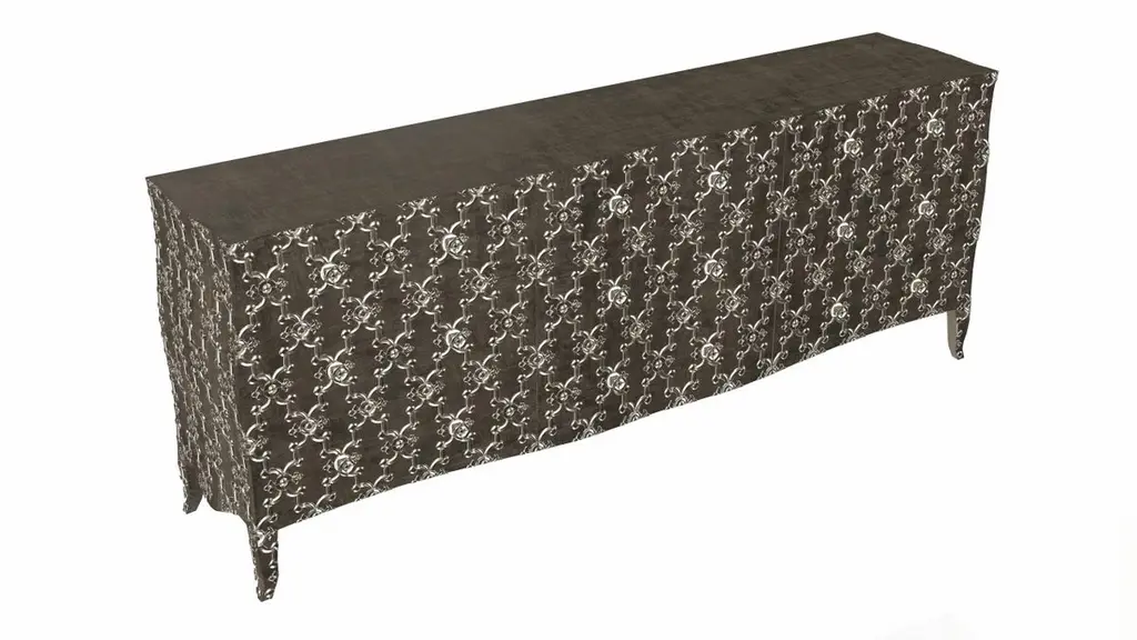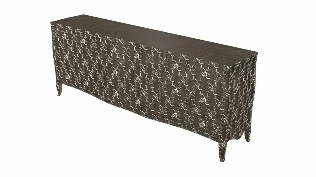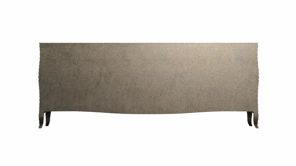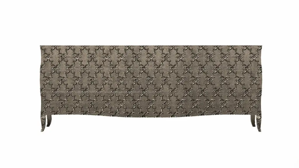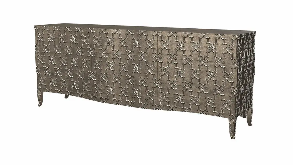 Renowned designer Paul Mathieu created this large dresser with 9 drawers with his interpretation of Fleur de Lis motif carved all over the piece just like the other two designs namely the Louise Semainier and Demi Louise Semainier which are part of the Louise Collection he created for Stephanie OdegardCrafted with utmost care and attention to detail, these Louis XVI Fleur De Lis are made to order and are available in twelve metal clad finishes, ensuring that you can choose the perfect one to match your individual style and taste. The use of high-quality materials and expert craftsmanship ensure that each Art Deco Louis XVI Fleur De Lis is not only beautiful but also a true piece of art.The curved legs and side arms of this Art Deco Louis XVI Fleur De Lis are hand carved from solid pieces of teak. Pattern makers trace and cut complex forms that will cover the chair in a skin of copper, white bronze, brass or antiqued white bronze The metal finishes will tarnish over time. Regular non-abrasive household metal polishes can be used to restore the original luster.Overall, if you're looking for a piece of furniture that combines luxury, comfort, and style, then the Art Deco Louis XVI Fleur De Lis is an excellent choice. With its distinctive curved profile and multiple finish options, this Chair set is sure to elevate the look of any room it is placed in, and be a beloved addition to your home for years to come.The images shown in this listing are shot in different lighting conditions and/or are 3D illustrations. We encourage our customers to please request a sample or a full sample set of 12 finishes so that they can experience the finish first hand. Louise Art Deco Buffet Sideboard Fine Hammered Antique Bronze by Paul MathieuSize- 84"x 18"x 33"HMaterials - Antique Bronze, Metal sheet, Teak, Wood, MetalTechniques: Hand-Crafted, Hand-Carved, Metal Work, Wood Work, Metal Wrapping, PolishedPlease note that moisture in air, sudden change in temperature and natural movement of wood over time causes the metal to wrinkle or bubble up. We use well seasoned, reclaimed teak and high quality marine grade MDF (wherever technically possible) to avoid and delay the mentioned changes. However a perfect stability of metal cannot be guaranteed. Please note that our smooth finish metal clad pieces will have some unavoidable tool marks. This is proof that everything is done by hand. The smooth finish will not come out like a machine made perfect surface and the master artisan will do their best to make it look as good/clean/stable/perfect as he possibly can.The antique white bronze finish is hand done by using an acidic chemical over the white bronze finish to recreate a natural patination. Like with the natural patination of silver, copper, or brass, the final result and color uniformity of the patina cannot be guaranteed. The goal of this finish is to achieve rainbow-like shades with dull, shiny, cloudy, and streaky patches to give an illusion of antiquing. Please note:None of our metal clad pieces are treated with a protective “finish” thus enabling the items to age naturally over time. We will of course polish them well before we pack them. a) Copper oxidizes faster than the other metals. In six to twelve months it will most likely lose its shine and will gradually turn to different shades of brown and/or green/blue. This aging process and its effect is referred to as verdigris. After a year the piece should not change much more. Copper does not rust, but does require periodic cleaning in order to retain its original shine if that the preferred option. ('BRASSO' or any known copper polish can be used to polish copper).b) Brass retains its shine for far longer than others, but will tarnish if not cleaned on occasion. ('BRASSO' is made to polish brass).c) White bronze, has the least tendency to show age or tarnish. If kept in a controlled climate, this metal will hold its shine for years. It can be cleaned with a cleanser and polished with a cloth. d) The antiqued white bronze finish will react with the natural elements the fastest in the beginning but it too will stop reacting and will settle down in a stable state like copper after 6-12 months. Since it is already antiqued and looked like it is tarnished, as described in an earlier message, this fast reaction will not change the over all look. In that way this surface is most forgiving. The images shown in this listing are shot in different lighting conditions and/or are 3D illustrations. We encourage our customers to please request a sample or a full sample set of 12 finishes so that they can experience the finish first hand.