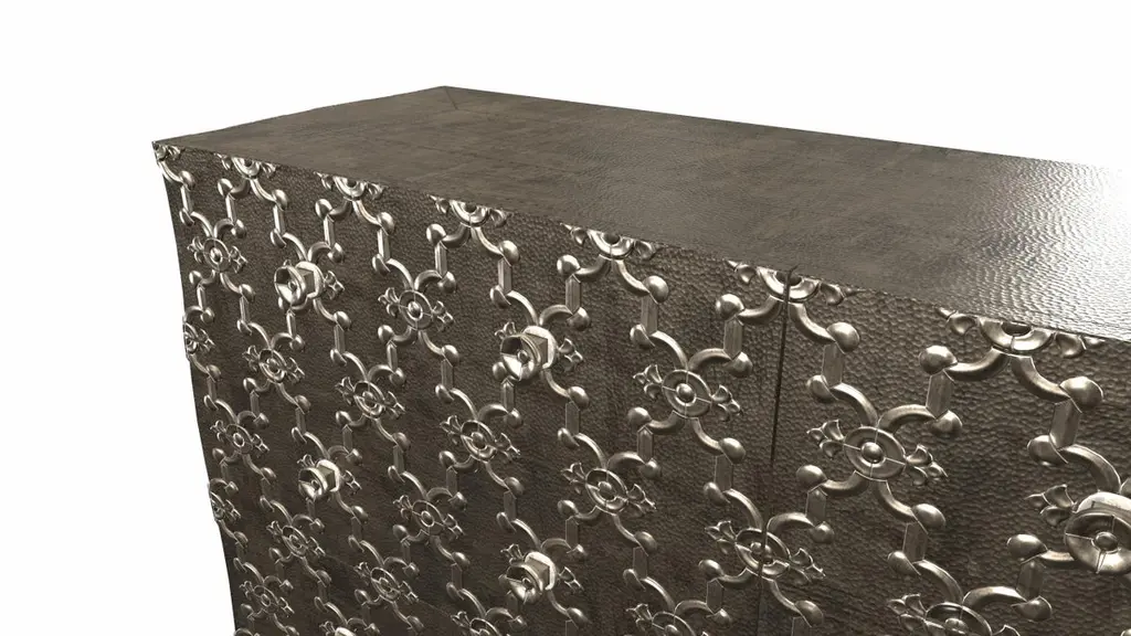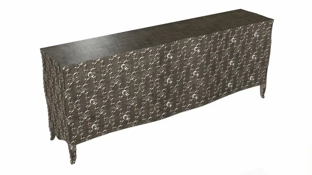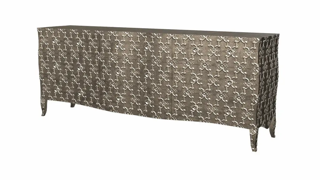 Renowned designer Paul Mathieu created this large dresser with 9 drawers with his interpretation of Fleur de Lis motif carved all over the piece just like the other two designs namely the Louise Semainier and Demi Louise Semainier which are part of the Louise Collection he created for Stephanie OdegardCrafted with utmost care and attention to detail, these Louis XVI Fleur De Lis are made to order and are available in twelve metal clad finishes, ensuring that you can choose the perfect one to match your individual style and taste. The use of high-quality materials and expert craftsmanship ensure that each Art Deco Louis XVI Fleur De Lis is not only beautiful but also a true piece of art.The curved legs and side arms of this Art Deco Louis XVI Fleur De Lis are hand carved from solid pieces of teak. Pattern makers trace and cut complex forms that will cover the chair in a skin of copper, white bronze, brass or antiqued white bronze The metal finishes will tarnish over time. Regular non-abrasive household metal polishes can be used to restore the original luster.Overall, if you're looking for a piece of furniture that combines luxury, comfort, and style, then the Art Deco Louis XVI Fleur De Lis is an excellent choice. With its distinctive curved profile and multiple finish options, this Chair set is sure to elevate the look of any room it is placed in, and be a beloved addition to your home for years to come.The images shown in this listing are shot in different lighting conditions and/or are 3D illustrations. We encourage our customers to please request a sample or a full sample set of 12 finishes so that they can experience the finish first hand. Louise Art Deco Buffet Sideboard Fleu r De Lis Mid. Hammered Antique Bronze Size- 84"x 18"x 33"HMaterials - Antique Bronze, Metal sheet, Teak, Wood, MetalTechniques: Hand-Crafted, Hand-Carved, Metal Work, Wood Work, Metal Wrapping, PolishedPlease note that moisture in air, sudden change in temperature and natural movement of wood over time causes the metal to wrinkle or bubble up. We use well seasoned, reclaimed teak and high quality marine grade MDF (wherever technically possible) to avoid and delay the mentioned changes. However a perfect stability of metal cannot be guaranteed. Please note that our smooth finish metal clad pieces will have some unavoidable tool marks. This is proof that everything is done by hand. The smooth finish will not come out like a machine made perfect surface and the master artisan will do their best to make it look as good/clean/stable/perfect as he possibly can.The antique white bronze finish is hand done by using an acidic chemical over the white bronze finish to recreate a natural patination. Like with the natural patination of silver, copper, or brass, the final result and color uniformity of the patina cannot be guaranteed. The goal of this finish is to achieve rainbow-like shades with dull, shiny, cloudy, and streaky patches to give an illusion of antiquing. Please note:None of our metal clad pieces are treated with a protective “finish” thus enabling the items to age naturally over time. We will of course polish them well before we pack them. a) Copper oxidizes faster than the other metals. In six to twelve months it will most likely lose its shine and will gradually turn to different shades of brown and/or green/blue. This aging process and its effect is referred to as verdigris. After a year the piece should not change much more. Copper does not rust, but does require periodic cleaning in order to retain its original shine if that the preferred option. ('BRASSO' or any known copper polish can be used to polish copper).b) Brass retains its shine for far longer than others, but will tarnish if not cleaned on occasion. ('BRASSO' is made to polish brass).c) White bronze, has the least tendency to show age or tarnish. If kept in a controlled climate, this metal will hold its shine for years. It can be cleaned with a cleanser and polished with a cloth. d) The antiqued white bronze finish will react with the natural elements the fastest in the beginning but it too will stop reacting and will settle down in a stable state like copper after 6-12 months. Since it is already antiqued and looked like it is tarnished, as described in an earlier message, this fast reaction will not change the over all look. In that way this surface is most forgiving. The images shown in this listing are shot in different lighting conditions and/or are 3D illustrations. We encourage our customers to please request a sample or a full sample set of 12 finishes so that they can experience the finish first hand.