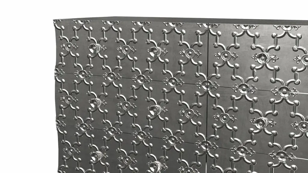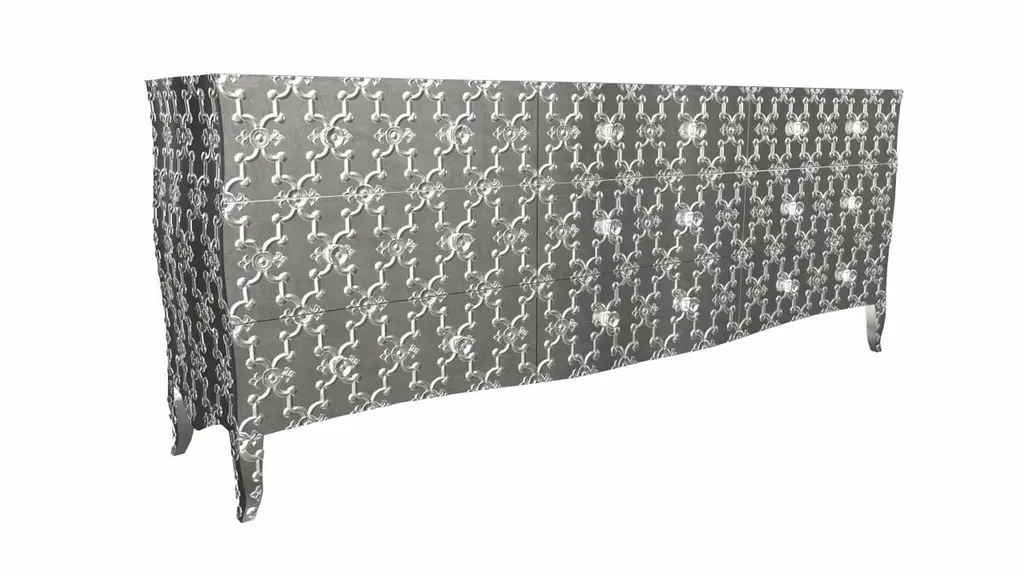 Renowned designer Paul Mathieu created this large dresser with 9 drawers with his interpretation of Fleur de Lis motif carved all over the piece just like the other two designs namely the Louise Semainier and Demi Louise Semainier which are part of the Louise Collection he created for Stephanie OdegardCrafted with utmost care and attention to detail, these Louis XVI Fleur De Lis are made to order and are available in twelve metal clad finishes, ensuring that you can choose the perfect one to match your individual style and taste. The use of high-quality materials and expert craftsmanship ensure that each Art Deco Louis XVI Fleur De Lis is not only beautiful but also a true piece of art.The curved legs and side arms of this Art Deco Louis XVI Fleur De Lis are hand carved from solid pieces of teak. Pattern makers trace and cut complex forms that will cover the chair in a skin of copper, white bronze, brass or antiqued white bronze The metal finishes will tarnish over time. Regular non-abrasive household metal polishes can be used to restore the original luster.Overall, if you're looking for a piece of furniture that combines luxury, comfort, and style, then the Art Deco Louis XVI Fleur De Lis is an excellent choice. With its distinctive curved profile and multiple finish options, this Chair set is sure to elevate the look of any room it is placed in, and be a beloved addition to your home for years to come.The images shown in this listing are shot in different lighting conditions and/or are 3D illustrations. We encourage our customers to please request a sample or a full sample set of 12 finishes so that they can experience the finish first hand. Louise Art Deco Buffet Sideboard Fleur De Lis Smooth White Bronze by Paul MathieuSize- 84"x 18"x 33"HMaterials - White Bronze, Metal sheet, Teak, Wood, MetalTechniques: Hand-Crafted, Hand-Carved, Metal Work, Wood Work, Metal Wrapping, PolishedPlease note that moisture in air, sudden change in temperature and natural movement of wood over time causes the metal to wrinkle or bubble up. We use well seasoned, reclaimed teak and high quality marine grade MDF (wherever technically possible) to avoid and delay the mentioned changes. However a perfect stability of metal cannot be guaranteed. Please note that our smooth finish metal clad pieces will have some unavoidable tool marks. This is proof that everything is done by hand. The smooth finish will not come out like a machine made perfect surface and the master artisan will do their best to make it look as good/clean/stable/perfect as he possibly can.The antique white bronze finish is hand done by using an acidic chemical over the white bronze finish to recreate a natural patination. Like with the natural patination of silver, copper, or brass, the final result and color uniformity of the patina cannot be guaranteed. The goal of this finish is to achieve rainbow-like shades with dull, shiny, cloudy, and streaky patches to give an illusion of antiquing. Please note:None of our metal clad pieces are treated with a protective “finish” thus enabling the items to age naturally over time. We will of course polish them well before we pack them. a) Copper oxidizes faster than the other metals. In six to twelve months it will most likely lose its shine and will gradually turn to different shades of brown and/or green/blue. This aging process and its effect is referred to as verdigris. After a year the piece should not change much more. Copper does not rust, but does require periodic cleaning in order to retain its original shine if that the preferred option. ('BRASSO' or any known copper polish can be used to polish copper).b) Brass retains its shine for far longer than others, but will tarnish if not cleaned on occasion. ('BRASSO' is made to polish brass).c) White bronze, has the least tendency to show age or tarnish. If kept in a controlled climate, this metal will hold its shine for years. It can be cleaned with a cleanser and polished with a cloth. d) The antiqued white bronze finish will react with the natural elements the fastest in the beginning but it too will stop reacting and will settle down in a stable state like copper after 6-12 months. Since it is already antiqued and looked like it is tarnished, as described in an earlier message, this fast reaction will not change the over all look. In that way this surface is most forgiving. The images shown in this listing are shot in different lighting conditions and/or are 3D illustrations. We encourage our customers to please request a sample or a full sample set of 12 finishes so that they can experience the finish first hand.