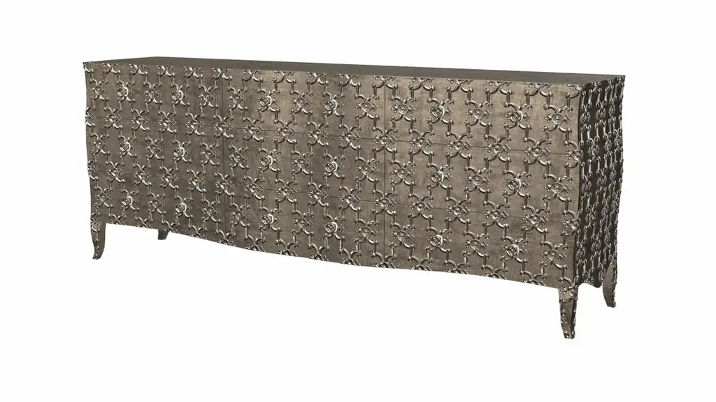 Renowned designer Paul Mathieu created this large dresser with 9 drawers with his interpretation of Fleur de Lis motif carved all over the piece just like the other two designs namely the Louise Semainier and Demi Louise Semainier which are part of the Louise Collection he created for Stephanie OdegardCrafted with utmost care and attention to detail, these Louis XVI Fleur De Lis are made to order and are available in twelve metal clad finishes, ensuring that you can choose the perfect one to match your individual style and taste. The use of high-quality materials and expert craftsmanship ensure that each Art Deco Louis XVI Fleur De Lis is not only beautiful but also a true piece of art.The curved legs and side arms of this Art Deco Louis XVI Fleur De Lis are hand carved from solid pieces of teak. Pattern makers trace and cut complex forms that will cover the chair in a skin of copper, white bronze, brass or antiqued white bronze The metal finishes will tarnish over time. Regular non-abrasive household metal polishes can be used to restore the original luster.Overall, if you're looking for a piece of furniture that combines luxury, comfort, and style, then the Art Deco Louis XVI Fleur De Lis is an excellent choice. With its distinctive curved profile and multiple finish options, this Chair set is sure to elevate the look of any room it is placed in, and be a beloved addition to your home for years to come.The images shown in this listing are shot in different lighting conditions and/or are 3D illustrations. We encourage our customers to please request a sample or a full sample set of 12 finishes so that they can experience the finish first hand. Louise Art Deco Buffet Sideboard Smooth Antique Bronze by Paul MathieuSize- 84"x 18"x 33"HMaterials - Antique Bronze, Metal sheet, Teak, Wood, MetalTechniques: Hand-Crafted, Hand-Carved, Metal Work, Wood Work, Metal Wrapping, PolishedPlease note that moisture in air, sudden change in temperature and natural movement of wood over time causes the metal to wrinkle or bubble up. We use well seasoned, reclaimed teak and high quality marine grade MDF (wherever technically possible) to avoid and delay the mentioned changes. However a perfect stability of metal cannot be guaranteed. Please note that our smooth finish metal clad pieces will have some unavoidable tool marks. This is proof that everything is done by hand. The smooth finish will not come out like a machine made perfect surface and the master artisan will do their best to make it look as good/clean/stable/perfect as he possibly can.The antique white bronze finish is hand done by using an acidic chemical over the white bronze finish to recreate a natural patination. Like with the natural patination of silver, copper, or brass, the final result and color uniformity of the patina cannot be guaranteed. The goal of this finish is to achieve rainbow-like shades with dull, shiny, cloudy, and streaky patches to give an illusion of antiquing. Please note:None of our metal clad pieces are treated with a protective “finish” thus enabling the items to age naturally over time. We will of course polish them well before we pack them. a) Copper oxidizes faster than the other metals. In six to twelve months it will most likely lose its shine and will gradually turn to different shades of brown and/or green/blue. This aging process and its effect is referred to as verdigris. After a year the piece should not change much more. Copper does not rust, but does require periodic cleaning in order to retain its original shine if that the preferred option. ('BRASSO' or any known copper polish can be used to polish copper).b) Brass retains its shine for far longer than others, but will tarnish if not cleaned on occasion. ('BRASSO' is made to polish brass).c) White bronze, has the least tendency to show age or tarnish. If kept in a controlled climate, this metal will hold its shine for years. It can be cleaned with a cleanser and polished with a cloth. d) The antiqued white bronze finish will react with the natural elements the fastest in the beginning but it too will stop reacting and will settle down in a stable state like copper after 6-12 months. Since it is already antiqued and looked like it is tarnished, as described in an earlier message, this fast reaction will not change the over all look. In that way this surface is most forgiving. The images shown in this listing are shot in different lighting conditions and/or are 3D illustrations. We encourage our customers to please request a sample or a full sample set of 12 finishes so that they can experience the finish first hand.