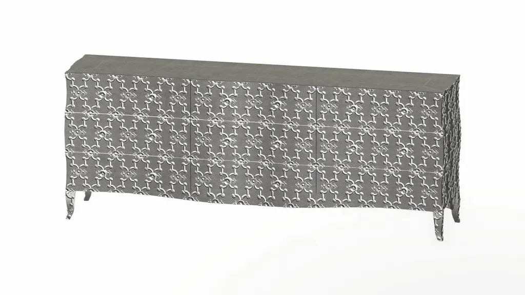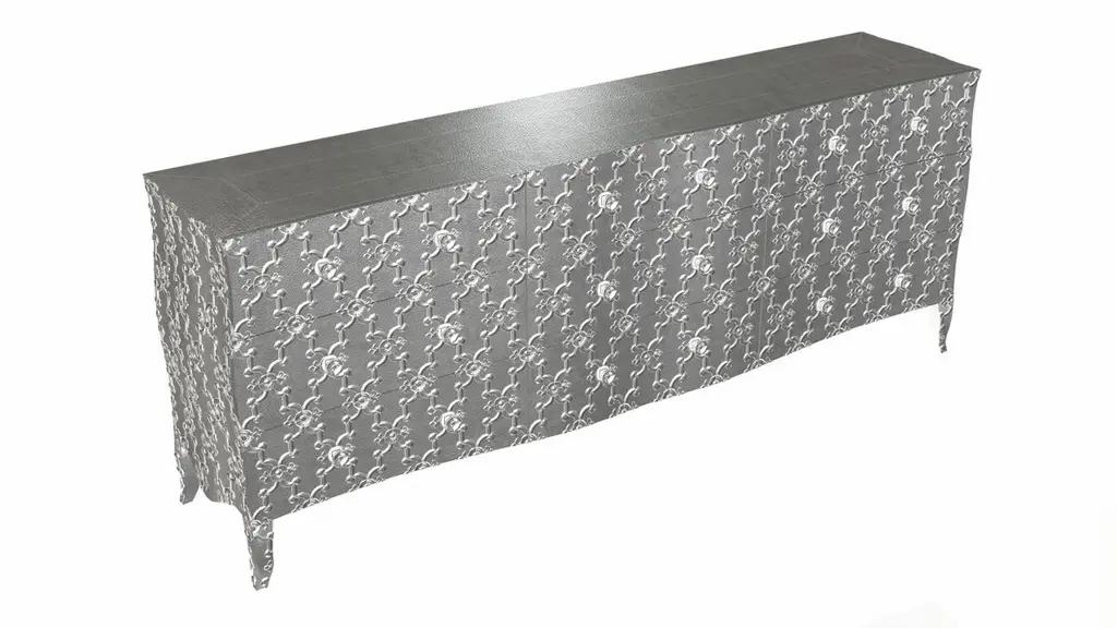 Renowned designer Paul Mathieu created this large dresser with 9 drawers with his interpretation of Fleur de Lis motif carved all over the piece just like the other two designs namely the Louise Semainier and Demi Louise Semainier which are part of the Louise Collection he created for Stephanie OdegardCrafted with utmost care and attention to detail, these Louis XVI Fleur De Lis are made to order and are available in twelve metal clad finishes, ensuring that you can choose the perfect one to match your individual style and taste. The use of high-quality materials and expert craftsmanship ensure that each Art Deco Louis XVI Fleur De Lis is not only beautiful but also a true piece of art.The curved legs and side arms of this Art Deco Louis XVI Fleur De Lis are hand carved from solid pieces of teak. Pattern makers trace and cut complex forms that will cover the chair in a skin of copper, white bronze, brass or antiqued white bronze The metal finishes will tarnish over time. Regular non-abrasive household metal polishes can be used to restore the original luster.Overall, if you're looking for a piece of furniture that combines luxury, comfort, and style, then the Art Deco Louis XVI Fleur De Lis is an excellent choice. With its distinctive curved profile and multiple finish options, this Chair set is sure to elevate the look of any room it is placed in, and be a beloved addition to your home for years to come.The images shown in this listing are shot in different lighting conditions and/or are 3D illustrations. We encourage our customers to please request a sample or a full sample set of 12 finishes so that they can experience the finish first hand. Louise Art Deco Sideboard Fleur De Lis Fine Hammered White Bronze by Paul MSize- 84"x 18"x 33"HMaterials - White Bronze, Metal sheet, Teak, Wood, MetalTechniques: Hand-Crafted, Hand-Carved, Metal Work, Wood Work, Metal Wrapping, PolishedPlease note that moisture in air, sudden change in temperature and natural movement of wood over time causes the metal to wrinkle or bubble up. We use well seasoned, reclaimed teak and high quality marine grade MDF (wherever technically possible) to avoid and delay the mentioned changes. However a perfect stability of metal cannot be guaranteed. Please note that our smooth finish metal clad pieces will have some unavoidable tool marks. This is proof that everything is done by hand. The smooth finish will not come out like a machine made perfect surface and the master artisan will do their best to make it look as good/clean/stable/perfect as he possibly can.The antique white bronze finish is hand done by using an acidic chemical over the white bronze finish to recreate a natural patination. Like with the natural patination of silver, copper, or brass, the final result and color uniformity of the patina cannot be guaranteed. The goal of this finish is to achieve rainbow-like shades with dull, shiny, cloudy, and streaky patches to give an illusion of antiquing. Please note:None of our metal clad pieces are treated with a protective “finish” thus enabling the items to age naturally over time. We will of course polish them well before we pack them. a) Copper oxidizes faster than the other metals. In six to twelve months it will most likely lose its shine and will gradually turn to different shades of brown and/or green/blue. This aging process and its effect is referred to as verdigris. After a year the piece should not change much more. Copper does not rust, but does require periodic cleaning in order to retain its original shine if that the preferred option. ('BRASSO' or any known copper polish can be used to polish copper).b) Brass retains its shine for far longer than others, but will tarnish if not cleaned on occasion. ('BRASSO' is made to polish brass).c) White bronze, has the least tendency to show age or tarnish. If kept in a controlled climate, this metal will hold its shine for years. It can be cleaned with a cleanser and polished with a cloth. d) The antiqued white bronze finish will react with the natural elements the fastest in the beginning but it too will stop reacting and will settle down in a stable state like copper after 6-12 months. Since it is already antiqued and looked like it is tarnished, as described in an earlier message, this fast reaction will not change the over all look. In that way this surface is most forgiving. The images shown in this listing are shot in different lighting conditions and/or are 3D illustrations. We encourage our customers to please request a sample or a full sample set of 12 finishes so that they can experience the finish first hand.