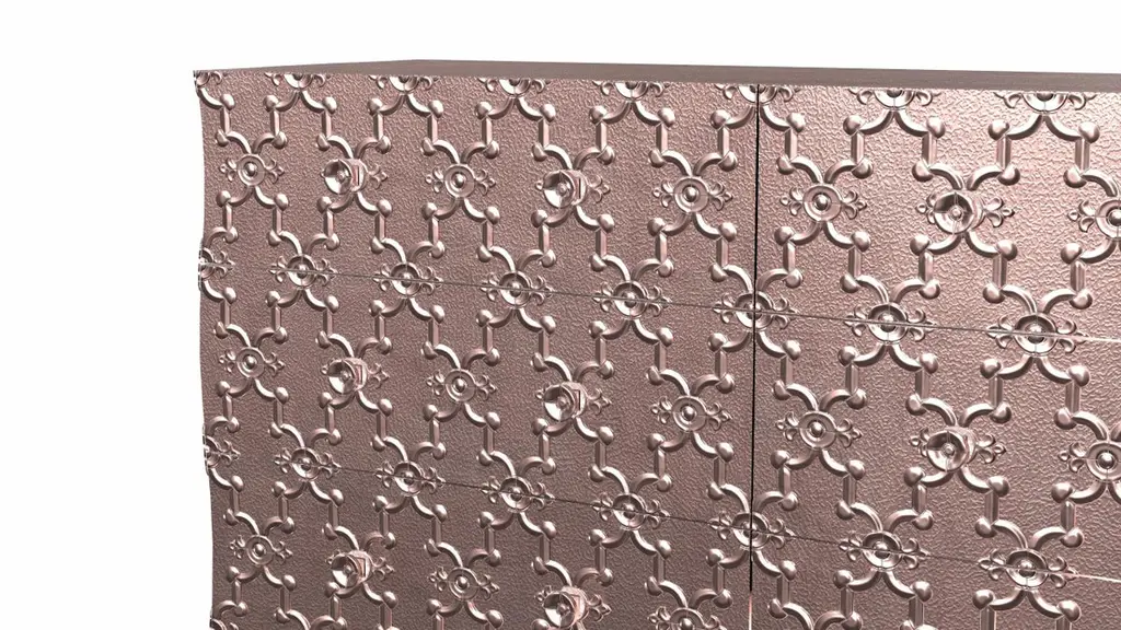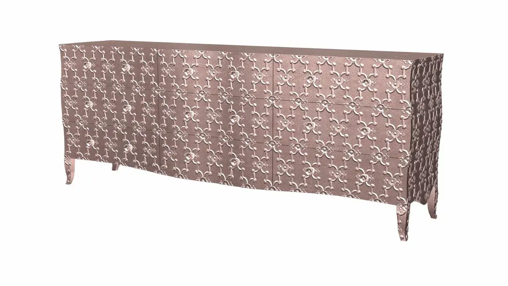 Renowned designer Paul Mathieu created this large dresser with 9 drawers with his interpretation of Fleur de Lis motif carved all over the piece just like the other two designs namely the Louise Semainier and Demi Louise Semainier which are part of the Louise Collection he created for Stephanie OdegardCrafted with utmost care and attention to detail, these Louis XVI Fleur De Lis are made to order and are available in twelve metal clad finishes, ensuring that you can choose the perfect one to match your individual style and taste. The use of high-quality materials and expert craftsmanship ensure that each Art Deco Louis XVI Fleur De Lis is not only beautiful but also a true piece of art.The curved legs and side arms of this Art Deco Louis XVI Fleur De Lis are hand carved from solid pieces of teak. Pattern makers trace and cut complex forms that will cover the chair in a skin of copper, white bronze, brass or antiqued white bronze The metal finishes will tarnish over time. Regular non-abrasive household metal polishes can be used to restore the original luster.Overall, if you're looking for a piece of furniture that combines luxury, comfort, and style, then the Art Deco Louis XVI Fleur De Lis is an excellent choice. With its distinctive curved profile and multiple finish options, this Chair set is sure to elevate the look of any room it is placed in, and be a beloved addition to your home for years to come.The images shown in this listing are shot in different lighting conditions and/or are 3D illustrations. We encourage our customers to please request a sample or a full sample set of 12 finishes so that they can experience the finish first hand. Louise Art Deco Credenza Fleur De Lis Fine Hammered Copper by Paul MathieuSize- 84"x 18"x 33"HMaterials - Copper, Metal sheet, Teak, Wood, MetalTechniques: Hand-Crafted, Hand-Carved, Metal Work, Wood Work, Metal Wrapping, PolishedPlease note that moisture in air, sudden change in temperature and natural movement of wood over time causes the metal to wrinkle or bubble up. We use well seasoned, reclaimed teak and high quality marine grade MDF (wherever technically possible) to avoid and delay the mentioned changes. However a perfect stability of metal cannot be guaranteed. Please note that our smooth finish metal clad pieces will have some unavoidable tool marks. This is proof that everything is done by hand. The smooth finish will not come out like a machine made perfect surface and the master artisan will do their best to make it look as good/clean/stable/perfect as he possibly can.The antique white bronze finish is hand done by using an acidic chemical over the white bronze finish to recreate a natural patination. Like with the natural patination of silver, copper, or brass, the final result and color uniformity of the patina cannot be guaranteed. The goal of this finish is to achieve rainbow-like shades with dull, shiny, cloudy, and streaky patches to give an illusion of antiquing. Please note:None of our metal clad pieces are treated with a protective “finish” thus enabling the items to age naturally over time. We will of course polish them well before we pack them. a) Copper oxidizes faster than the other metals. In six to twelve months it will most likely lose its shine and will gradually turn to different shades of brown and/or green/blue. This aging process and its effect is referred to as verdigris. After a year the piece should not change much more. Copper does not rust, but does require periodic cleaning in order to retain its original shine if that the preferred option. ('BRASSO' or any known copper polish can be used to polish copper).b) Brass retains its shine for far longer than others, but will tarnish if not cleaned on occasion. ('BRASSO' is made to polish brass).c) White bronze, has the least tendency to show age or tarnish. If kept in a controlled climate, this metal will hold its shine for years. It can be cleaned with a cleanser and polished with a cloth. d) The antiqued white bronze finish will react with the natural elements the fastest in the beginning but it too will stop reacting and will settle down in a stable state like copper after 6-12 months. Since it is already antiqued and looked like it is tarnished, as described in an earlier message, this fast reaction will not change the over all look. In that way this surface is most forgiving. The images shown in this listing are shot in different lighting conditions and/or are 3D illustrations. We encourage our customers to please request a sample or a full sample set of 12 finishes so that they can experience the finish first hand.