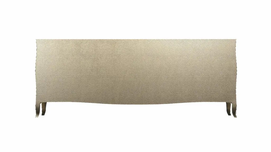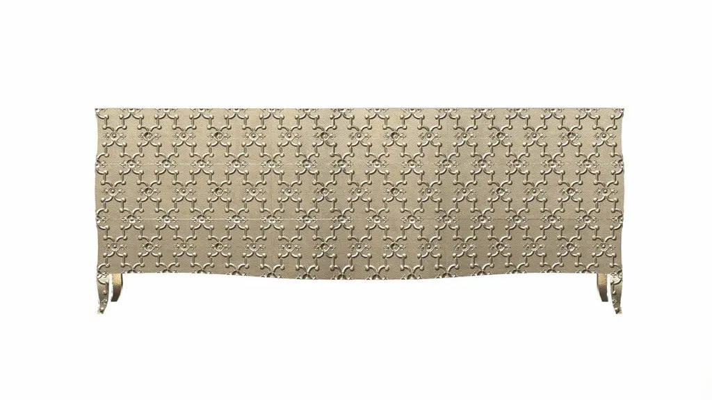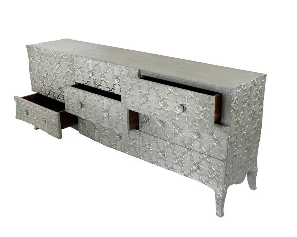 Renowned designer Paul Mathieu created this large dresser with 9 drawers with his interpretation of Fleur de Lis motif carved all over the piece just like the other two designs namely the Louise Semainier and Demi Louise Semainier which are part of the Louise Collection he created for Stephanie OdegardCrafted with utmost care and attention to detail, these Louis XVI Fleur De Lis are made to order and are available in twelve metal clad finishes, ensuring that you can choose the perfect one to match your individual style and taste. The use of high-quality materials and expert craftsmanship ensure that each Art Deco Louis XVI Fleur De Lis is not only beautiful but also a true piece of art.The curved legs and side arms of this Art Deco Louis XVI Fleur De Lis are hand carved from solid pieces of teak. Pattern makers trace and cut complex forms that will cover the chair in a skin of copper, white bronze, brass or antiqued white bronze The metal finishes will tarnish over time. Regular non-abrasive household metal polishes can be used to restore the original luster.Overall, if you're looking for a piece of furniture that combines luxury, comfort, and style, then the Art Deco Louis XVI Fleur De Lis is an excellent choice. With its distinctive curved profile and multiple finish options, this Chair set is sure to elevate the look of any room it is placed in, and be a beloved addition to your home for years to come.The images shown in this listing are shot in different lighting conditions and/or are 3D illustrations. We encourage our customers to please request a sample or a full sample set of 12 finishes so that they can experience the finish first hand. Louise Art Deco Credenza Fleur De Lis Mid. Hammered Brass by Paul MathieuSize- 84"x 18"x 33"HMaterials - Brass, Metal sheet, Teak, Wood, MetalTechniques: Hand-Crafted, Hand-Carved, Metal Work, Wood Work, Metal Wrapping, PolishedPlease note that moisture in air, sudden change in temperature and natural movement of wood over time causes the metal to wrinkle or bubble up. We use well seasoned, reclaimed teak and high quality marine grade MDF (wherever technically possible) to avoid and delay the mentioned changes. However a perfect stability of metal cannot be guaranteed. Please note that our smooth finish metal clad pieces will have some unavoidable tool marks. This is proof that everything is done by hand. The smooth finish will not come out like a machine made perfect surface and the master artisan will do their best to make it look as good/clean/stable/perfect as he possibly can.The antique white bronze finish is hand done by using an acidic chemical over the white bronze finish to recreate a natural patination. Like with the natural patination of silver, copper, or brass, the final result and color uniformity of the patina cannot be guaranteed. The goal of this finish is to achieve rainbow-like shades with dull, shiny, cloudy, and streaky patches to give an illusion of antiquing. Please note:None of our metal clad pieces are treated with a protective “finish” thus enabling the items to age naturally over time. We will of course polish them well before we pack them. a) Copper oxidizes faster than the other metals. In six to twelve months it will most likely lose its shine and will gradually turn to different shades of brown and/or green/blue. This aging process and its effect is referred to as verdigris. After a year the piece should not change much more. Copper does not rust, but does require periodic cleaning in order to retain its original shine if that the preferred option. ('BRASSO' or any known copper polish can be used to polish copper).b) Brass retains its shine for far longer than others, but will tarnish if not cleaned on occasion. ('BRASSO' is made to polish brass).c) White bronze, has the least tendency to show age or tarnish. If kept in a controlled climate, this metal will hold its shine for years. It can be cleaned with a cleanser and polished with a cloth. d) The antiqued white bronze finish will react with the natural elements the fastest in the beginning but it too will stop reacting and will settle down in a stable state like copper after 6-12 months. Since it is already antiqued and looked like it is tarnished, as described in an earlier message, this fast reaction will not change the over all look. In that way this surface is most forgiving. The images shown in this listing are shot in different lighting conditions and/or are 3D illustrations. We encourage our customers to please request a sample or a full sample set of 12 finishes so that they can experience the finish first hand.