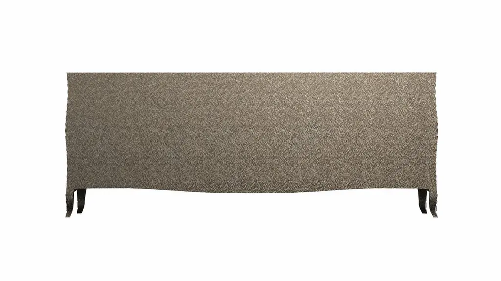 Renowned designer Paul Mathieu created this large dresser with 9 drawers with his interpretation of Fleur de Lis motif carved all over the piece just like the other two designs namely the Louise Semainier and Demi Louise Semainier which are part of the Louise Collection he created for Stephanie OdegardCrafted with utmost care and attention to detail, these Louis XVI Fleur De Lis are made to order and are available in twelve metal clad finishes, ensuring that you can choose the perfect one to match your individual style and taste. The use of high-quality materials and expert craftsmanship ensure that each Art Deco Louis XVI Fleur De Lis is not only beautiful but also a true piece of art.The curved legs and side arms of this Art Deco Louis XVI Fleur De Lis are hand carved from solid pieces of teak. Pattern makers trace and cut complex forms that will cover the chair in a skin of copper, white bronze, brass or antiqued white bronze The metal finishes will tarnish over time. Regular non-abrasive household metal polishes can be used to restore the original luster.Overall, if you're looking for a piece of furniture that combines luxury, comfort, and style, then the Art Deco Louis XVI Fleur De Lis is an excellent choice. With its distinctive curved profile and multiple finish options, this Chair set is sure to elevate the look of any room it is placed in, and be a beloved addition to your home for years to come.The images shown in this listing are shot in different lighting conditions and/or are 3D illustrations. We encourage our customers to please request a sample or a full sample set of 12 finishes so that they can experience the finish first hand. Louise Art Deco Sideboard Fleur De Lis Mid. Hammered Antique Bronze by Paul M.Size- 84"x 18"x 33"HMaterials - Antique Bronze, Metal sheet, Teak, Wood, MetalTechniques: Hand-Crafted, Hand-Carved, Metal Work, Wood Work, Metal Wrapping, PolishedPlease note that moisture in air, sudden change in temperature and natural movement of wood over time causes the metal to wrinkle or bubble up. We use well seasoned, reclaimed teak and high quality marine grade MDF (wherever technically possible) to avoid and delay the mentioned changes. However a perfect stability of metal cannot be guaranteed. Please note that our smooth finish metal clad pieces will have some unavoidable tool marks. This is proof that everything is done by hand. The smooth finish will not come out like a machine made perfect surface and the master artisan will do their best to make it look as good/clean/stable/perfect as he possibly can.The antique white bronze finish is hand done by using an acidic chemical over the white bronze finish to recreate a natural patination. Like with the natural patination of silver, copper, or brass, the final result and color uniformity of the patina cannot be guaranteed. The goal of this finish is to achieve rainbow-like shades with dull, shiny, cloudy, and streaky patches to give an illusion of antiquing. Please note:None of our metal clad pieces are treated with a protective “finish” thus enabling the items to age naturally over time. We will of course polish them well before we pack them. a) Copper oxidizes faster than the other metals. In six to twelve months it will most likely lose its shine and will gradually turn to different shades of brown and/or green/blue. This aging process and its effect is referred to as verdigris. After a year the piece should not change much more. Copper does not rust, but does require periodic cleaning in order to retain its original shine if that the preferred option. ('BRASSO' or any known copper polish can be used to polish copper).b) Brass retains its shine for far longer than others, but will tarnish if not cleaned on occasion. ('BRASSO' is made to polish brass).c) White bronze, has the least tendency to show age or tarnish. If kept in a controlled climate, this metal will hold its shine for years. It can be cleaned with a cleanser and polished with a cloth. d) The antiqued white bronze finish will react with the natural elements the fastest in the beginning but it too will stop reacting and will settle down in a stable state like copper after 6-12 months. Since it is already antiqued and looked like it is tarnished, as described in an earlier message, this fast reaction will not change the over all look. In that way this surface is most forgiving. The images shown in this listing are shot in different lighting conditions and/or are 3D illustrations. We encourage our customers to please request a sample or a full sample set of 12 finishes so that they can experience the finish first hand.