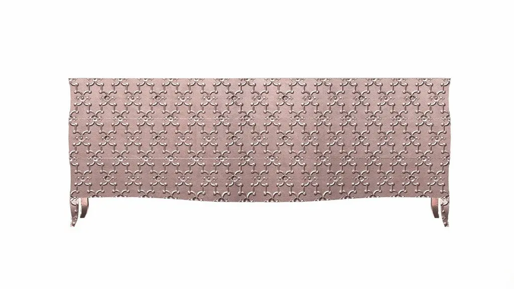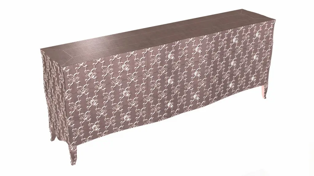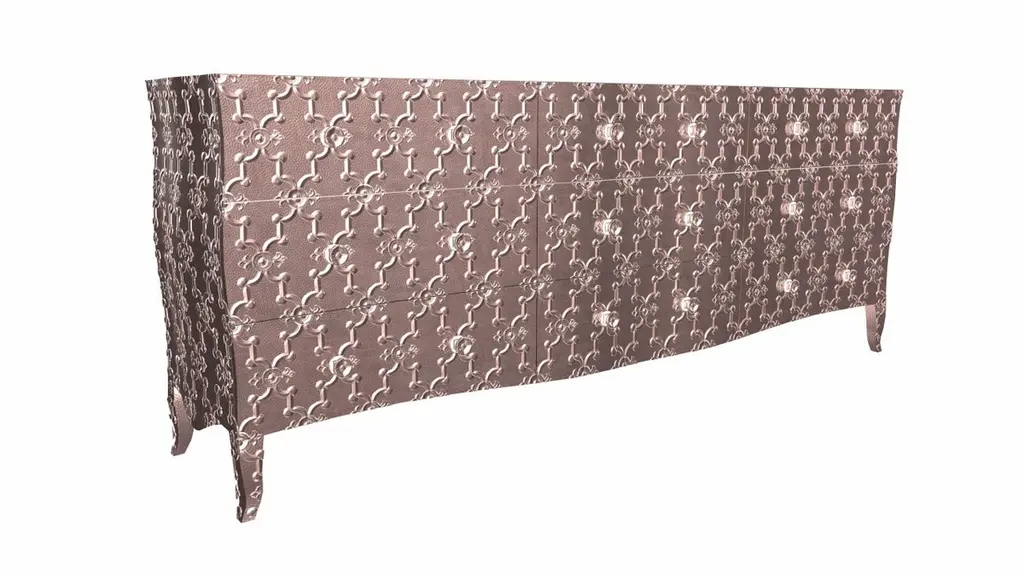 Renowned designer Paul Mathieu created this large dresser with 9 drawers with his interpretation of Fleur de Lis motif carved all over the piece just like the other two designs namely the Louise Semainier and Demi Louise Semainier which are part of the Louise Collection he created for Stephanie OdegardCrafted with utmost care and attention to detail, these Louis XVI Fleur De Lis are made to order and are available in twelve metal clad finishes, ensuring that you can choose the perfect one to match your individual style and taste. The use of high-quality materials and expert craftsmanship ensure that each Art Deco Louis XVI Fleur De Lis is not only beautiful but also a true piece of art.The curved legs and side arms of this Art Deco Louis XVI Fleur De Lis are hand carved from solid pieces of teak. Pattern makers trace and cut complex forms that will cover the chair in a skin of copper, white bronze, brass or antiqued white bronze The metal finishes will tarnish over time. Regular non-abrasive household metal polishes can be used to restore the original luster.Overall, if you're looking for a piece of furniture that combines luxury, comfort, and style, then the Art Deco Louis XVI Fleur De Lis is an excellent choice. With its distinctive curved profile and multiple finish options, this Chair set is sure to elevate the look of any room it is placed in, and be a beloved addition to your home for years to come.The images shown in this listing are shot in different lighting conditions and/or are 3D illustrations. We encourage our customers to please request a sample or a full sample set of 12 finishes so that they can experience the finish first hand. Louise Art Deco Sideboard Fleur De Lis Mid. Hammered Copper by Paul Mathieu Size- 84"x 18"x 33"HMaterials - Copper, Metal sheet, Teak, Wood, MetalTechniques: Hand-Crafted, Hand-Carved, Metal Work, Wood Work, Metal Wrapping, PolishedPlease note that moisture in air, sudden change in temperature and natural movement of wood over time causes the metal to wrinkle or bubble up. We use well seasoned, reclaimed teak and high quality marine grade MDF (wherever technically possible) to avoid and delay the mentioned changes. However a perfect stability of metal cannot be guaranteed. Please note that our smooth finish metal clad pieces will have some unavoidable tool marks. This is proof that everything is done by hand. The smooth finish will not come out like a machine made perfect surface and the master artisan will do their best to make it look as good/clean/stable/perfect as he possibly can.The antique white bronze finish is hand done by using an acidic chemical over the white bronze finish to recreate a natural patination. Like with the natural patination of silver, copper, or brass, the final result and color uniformity of the patina cannot be guaranteed. The goal of this finish is to achieve rainbow-like shades with dull, shiny, cloudy, and streaky patches to give an illusion of antiquing. Please note:None of our metal clad pieces are treated with a protective “finish” thus enabling the items to age naturally over time. We will of course polish them well before we pack them. a) Copper oxidizes faster than the other metals. In six to twelve months it will most likely lose its shine and will gradually turn to different shades of brown and/or green/blue. This aging process and its effect is referred to as verdigris. After a year the piece should not change much more. Copper does not rust, but does require periodic cleaning in order to retain its original shine if that the preferred option. ('BRASSO' or any known copper polish can be used to polish copper).b) Brass retains its shine for far longer than others, but will tarnish if not cleaned on occasion. ('BRASSO' is made to polish brass).c) White bronze, has the least tendency to show age or tarnish. If kept in a controlled climate, this metal will hold its shine for years. It can be cleaned with a cleanser and polished with a cloth. d) The antiqued white bronze finish will react with the natural elements the fastest in the beginning but it too will stop reacting and will settle down in a stable state like copper after 6-12 months. Since it is already antiqued and looked like it is tarnished, as described in an earlier message, this fast reaction will not change the over all look. In that way this surface is most forgiving. The images shown in this listing are shot in different lighting conditions and/or are 3D illustrations. We encourage our customers to please request a sample or a full sample set of 12 finishes so that they can experience the finish first hand.