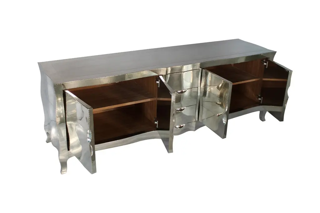 Louise Credenza from our Louise Collection. The renowned designer Paul Mathieu chose the name “Louise Credenza” when he created his more feminine version of Louis XV (1730-1760) furniture. The characteristic cabriole leg, curving outward at the knee and inward towards the foot in an "S" shape was born during this period. It is during the same era that English furniture makers produced the Queen Anne and Chippendale styles.Crafted with utmost care and attention to detail, these Louise Credenza are made to order and are available in twelve metal clad finishes, ensuring that you can choose the perfect one to match your individual style and taste. The use of high-quality materials and expert craftsmanship ensure that each Art Deco Louise Credenza is not only beautiful but also a true piece of Art.The curved legs and side arms of this Art Deco Louise Credenza are hand carved from solid pieces of teak. Pattern makers trace and cut complex forms that will cover the chair in a skin of copper, white bronze, brass or antiqued white bronze The metal finishes will tarnish over time. Regular non-abrasive household metal polishes can be used to restore the original luster.Overall, if you're looking for a piece of furniture that combines luxury, comfort, and style, then the Art Deco Louise Credenza is an excellent choice. With its distinctive curved profile and multiple finish options, this Chair set is sure to elevate the look of any room it is placed in, and be a beloved addition to your home for years to come.The images shown in this listing are shot in different lighting conditions and/or are 3D illustrations. We encourage our customers to please request a sample or a full sample set of 12 finishes so that they can experience the finish first hand. Louise Credenza Art Deco Credenzas in Smooth Copper by Paul Mathieu for Stephanie OdegardSize- 78"L x 21"W x 30"HMaterials - Copper, Metal sheet, Teak, Wood, MetalTechniques: Hand-Crafted, Hand-Carved, Metal Work, Wood Work, Metal Wrapping, PolishedPlease note that moisture in air, sudden change in temperature and natural movement of wood over time causes the metal to wrinkle or bubble up. We use well seasoned, reclaimed teak and high quality marine grade MDF (wherever technically possible) to avoid and delay the mentioned changes. However a perfect stability of metal cannot be guaranteed. Please note that our smooth finish metal clad pieces will have some unavoidable tool marks. This is proof that everything is done by hand. The smooth finish will not come out like a machine made perfect surface and the master Artisan will do their best to make it look as good/clean/stable/perfect as he possibly can.The antique white bronze finish is hand done by using an acidic chemical over the white bronze finish to recreate a natural patination. Like with the natural patination of silver, copper, or brass, the final result and color uniformity of the patina cannot be guaranteed. The goal of this finish is to achieve rainbow-like shades with dull, shiny, cloudy, and streaky patches to give an illusion of antiquing. Please note:None of our metal clad pieces are treated with a protective “finish” thus enabling the items to age naturally over time. We will of course polish them well before we pack them. a) Copper oxidizes faster than the other metals. In six to twelve months it will most likely lose its shine and will gradually turn to different shades of brown and/or green/blue. This aging process and its effect is referred to as verdigris. After a year the piece should not change much more. Copper does not rust, but does require periodic cleaning in order to retain its original shine if that the preferred option. ('BRASSO' or any known copper polish can be used to polish copper).b) Brass retains its shine for far longer than others, but will tarnish if not cleaned on occasion. ('BRASSO' is made to polish brass).c) White bronze, has the least tendency to show age or tarnish. If kept in a controlled climate, this metal will hold its shine for years. It can be cleaned with a cleanser and polished with a cloth. d) The antiqued white bronze finish will react with the natural elements the fastest in the beginning but it too will stop reacting and will settle down in a stable state like copper after 6-12 months. Since it is already antiqued and looked like it is tarnished, as described in an earlier message, this fast reaction will not change the over all look. In that way this surface is most forgiving. The images shown in this listing are shot in different lighting conditions and/or are 3D illustrations. We encourage our customers to please request a sample or a full sample set of 12 finishes so that they can experience the finish first hand.