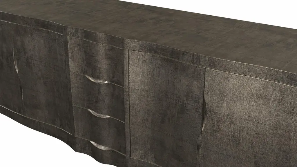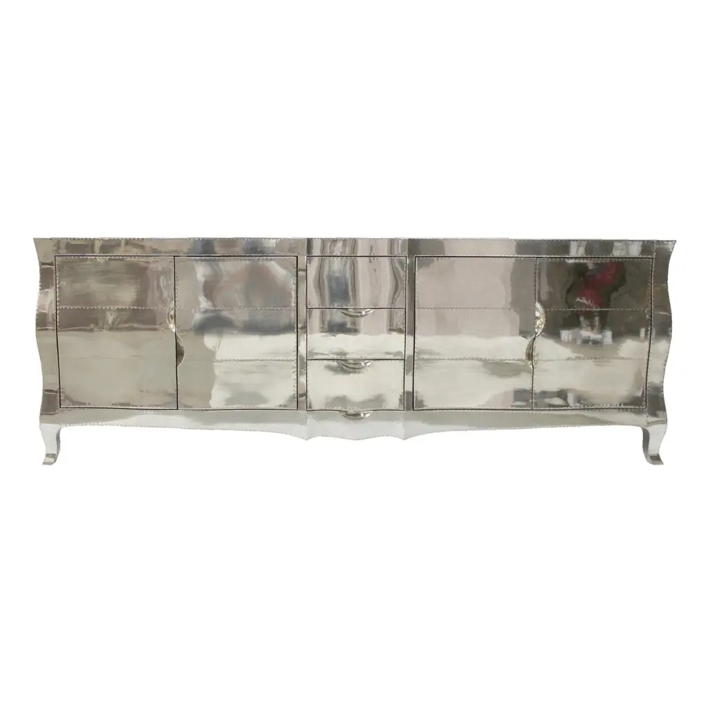 Louise Credenza from our Louise Collection. The renowned designer Paul Mathieu chose the name “Louise Credenza” when he created his more feminine version of Louis XV (1730-1760) furniture. The characteristic cabriole leg, curving outward at the knee and inward towards the foot in an "S" shape was born during this period. It is during the same era that English furniture makers produced the Queen Anne and Chippendale styles.Crafted with utmost care and attention to detail, these Louise Credenza are made to order and are available in twelve metal clad finishes, ensuring that you can choose the perfect one to match your individual style and taste. The use of high-quality materials and expert craftsmanship ensure that each Art Deco Louise Credenza is not only beautiful but also a true piece of Art.The curved legs and side arms of this Art Deco Louise Credenza are hand carved from solid pieces of teak. Pattern makers trace and cut complex forms that will cover the chair in a skin of copper, white bronze, brass or antiqued white bronze The metal finishes will tarnish over time. Regular non-abrasive household metal polishes can be used to restore the original luster.Overall, if you're looking for a piece of furniture that combines luxury, comfort, and style, then the Art Deco Louise Credenza is an excellent choice. With its distinctive curved profile and multiple finish options, this Chair set is sure to elevate the look of any room it is placed in, and be a beloved addition to your home for years to come.The images shown in this listing are shot in different lighting conditions and/or are 3D illustrations. We encourage our customers to please request a sample or a full sample set of 12 finishes so that they can experience the finish first hand. Louise Credenza Art Deco Credenzas in Fine Hammered Antique Bronze by Paul Mathieu for Stephanie OdegardSize- 78"L x 21"W x 30"HMaterials - Antique Bronze, Metal sheet, Teak, Wood, MetalTechniques: Hand-Crafted, Hand-Carved, Metal Work, Wood Work, Metal Wrapping, PolishedPlease note that moisture in air, sudden change in temperature and natural movement of wood over time causes the metal to wrinkle or bubble up. We use well seasoned, reclaimed teak and high quality marine grade MDF (wherever technically possible) to avoid and delay the mentioned changes. However a perfect stability of metal cannot be guaranteed. Please note that our smooth finish metal clad pieces will have some unavoidable tool marks. This is proof that everything is done by hand. The smooth finish will not come out like a machine made perfect surface and the master Artisan will do their best to make it look as good/clean/stable/perfect as he possibly can.The antique white bronze finish is hand done by using an acidic chemical over the white bronze finish to recreate a natural patination. Like with the natural patination of silver, copper, or brass, the final result and color uniformity of the patina cannot be guaranteed. The goal of this finish is to achieve rainbow-like shades with dull, shiny, cloudy, and streaky patches to give an illusion of antiquing. Please note:None of our metal clad pieces are treated with a protective “finish” thus enabling the items to age naturally over time. We will of course polish them well before we pack them. a) Copper oxidizes faster than the other metals. In six to twelve months it will most likely lose its shine and will gradually turn to different shades of brown and/or green/blue. This aging process and its effect is referred to as verdigris. After a year the piece should not change much more. Copper does not rust, but does require periodic cleaning in order to retain its original shine if that the preferred option. ('BRASSO' or any known copper polish can be used to polish copper).b) Brass retains its shine for far longer than others, but will tarnish if not cleaned on occasion. ('BRASSO' is made to polish brass).c) White bronze, has the least tendency to show age or tarnish. If kept in a controlled climate, this metal will hold its shine for years. It can be cleaned with a cleanser and polished with a cloth. d) The antiqued white bronze finish will react with the natural elements the fastest in the beginning but it too will stop reacting and will settle down in a stable state like copper after 6-12 months. Since it is already antiqued and looked like it is tarnished, as described in an earlier message, this fast reaction will not change the over all look. In that way this surface is most forgiving. The images shown in this listing are shot in different lighting conditions and/or are 3D illustrations. We encourage our customers to please request a sample or a full sample set of 12 finishes so that they can experience the finish first hand.
