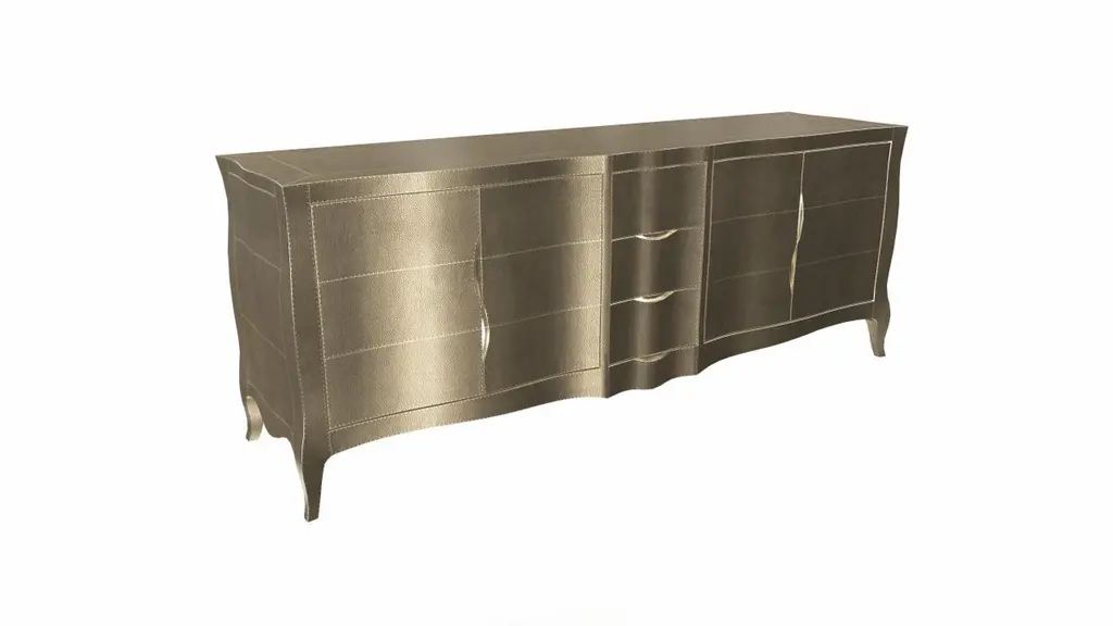 Louise Credenza from our Louise Collection. The renowned designer Paul Mathieu chose the name “Louise Credenza” when he created his more feminine version of Louis XV (1730-1760) furniture. The characteristic cabriole leg, curving outward at the knee and inward towards the foot in an "S" shape was born during this period. It is during the same era that English furniture makers produced the Queen Anne and Chippendale styles.Crafted with utmost care and attention to detail, these Louise Credenza are made to order and are available in twelve metal clad finishes, ensuring that you can choose the perfect one to match your individual style and taste. The use of high-quality materials and expert craftsmanship ensure that each Art Deco Louise Credenza is not only beautiful but also a true piece of Art.The curved legs and side arms of this Art Deco Louise Credenza are hand carved from solid pieces of teak. Pattern makers trace and cut complex forms that will cover the chair in a skin of copper, white bronze, brass or antiqued white bronze The metal finishes will tarnish over time. Regular non-abrasive household metal polishes can be used to restore the original luster.Overall, if you're looking for a piece of furniture that combines luxury, comfort, and style, then the Art Deco Louise Credenza is an excellent choice. With its distinctive curved profile and multiple finish options, this Chair set is sure to elevate the look of any room it is placed in, and be a beloved addition to your home for years to come.The images shown in this listing are shot in different lighting conditions and/or are 3D illustrations. We encourage our customers to please request a sample or a full sample set of 12 finishes so that they can experience the finish first hand. Louise Credenza Art Deco Sideboards in Mid. Hammered Brass by Paul Mathieu for Stephanie OdegardSize- 78"L x 21"W x 30"HMaterials - Brass, Metal sheet, Teak, Wood, MetalTechniques: Hand-Crafted, Hand-Carved, Metal Work, Wood Work, Metal Wrapping, PolishedPlease note that moisture in air, sudden change in temperature and natural movement of wood over time causes the metal to wrinkle or bubble up. We use well seasoned, reclaimed teak and high quality marine grade MDF (wherever technically possible) to avoid and delay the mentioned changes. However a perfect stability of metal cannot be guaranteed. Please note that our smooth finish metal clad pieces will have some unavoidable tool marks. This is proof that everything is done by hand. The smooth finish will not come out like a machine made perfect surface and the master Artisan will do their best to make it look as good/clean/stable/perfect as he possibly can.The antique white bronze finish is hand done by using an acidic chemical over the white bronze finish to recreate a natural patination. Like with the natural patination of silver, copper, or brass, the final result and color uniformity of the patina cannot be guaranteed. The goal of this finish is to achieve rainbow-like shades with dull, shiny, cloudy, and streaky patches to give an illusion of antiquing. Please note:None of our metal clad pieces are treated with a protective “finish” thus enabling the items to age naturally over time. We will of course polish them well before we pack them. a) Copper oxidizes faster than the other metals. In six to twelve months it will most likely lose its shine and will gradually turn to different shades of brown and/or green/blue. This aging process and its effect is referred to as verdigris. After a year the piece should not change much more. Copper does not rust, but does require periodic cleaning in order to retain its original shine if that the preferred option. ('BRASSO' or any known copper polish can be used to polish copper).b) Brass retains its shine for far longer than others, but will tarnish if not cleaned on occasion. ('BRASSO' is made to polish brass).c) White bronze, has the least tendency to show age or tarnish. If kept in a controlled climate, this metal will hold its shine for years. It can be cleaned with a cleanser and polished with a cloth. d) The antiqued white bronze finish will react with the natural elements the fastest in the beginning but it too will stop reacting and will settle down in a stable state like copper after 6-12 months. Since it is already antiqued and looked like it is tarnished, as described in an earlier message, this fast reaction will not change the over all look. In that way this surface is most forgiving. The images shown in this listing are shot in different lighting conditions and/or are 3D illustrations. We encourage our customers to please request a sample or a full sample set of 12 finishes so that they can experience the finish first hand.