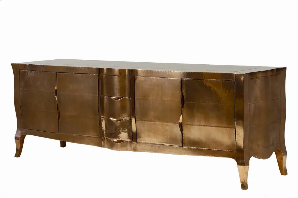 The renowned designer Paul Mathieu chose the name “Louise” when he created his more feminine version of Louis XV (1730-1760) furniture. The characteristic cabriole leg, curving outward at the knee and inward towards the foot in an "S" shape was born during this period. It is during the same era that English furniture makers produced the Queen Anne and Chippendale styles. The curved legs and side rails of this exceptionally elegant table are hand carved from solid pieces of teak. Pattern makers trace and cut complex forms that will cover the table from thick sheets of copper or silver. Once the table is joined together, it is meticulously encased in a tight-fitting skin of copper or purest silver. The silver used was assayed at 96% purity, which exceeds the minimum standard for sterling of 92.5%. Brass, White Bronze, Antiqued bronze, Silver and Copper are the available options for the metal skin. Both silver and copper will tarnish over time. Regular non-abrasive household metal polishes can be used to restore the original finish. Customization is our specialty. Please get in touch with us for any custom inquiries.Louise Credenza in BrassSize- 78" x 21" x 30"HMaterials - Brass, Teak, Hammered, Hand-CarvedPlease note that moisture in air, sudden change in temperature and natural movement of wood over time causes the metal to wrinkle or bubble up. We use well seasoned, reclaimed teak and high quality marine grade MDF (wherever technically possible) to avoid and delay the above mentioned changes. However a perfect stability of metal cannot be guaranteed.Please note that our smooth finish metal clad pieces will have some unavoidable tool marks. This is proof that everything is done by hand. The smooth finish will not come out like a machine made perfect surface and the master artisan will do their best to make it look as good/clean/stable/perfect as he possibly can. Our hammered finishes are a much safer option if the tool mark scratches are unacceptable. The hammered finishes are also safer against eventual bubbling/wrinkles due to natural forces as mentioned above. We would love to send you some samples before order confirmation so that the finish can be judged and experienced first hand.Buyer Cancellation-The cancellation charge is 25% which increases to 50% if the production is started.Prices do not include shipping from India (for custom orders) or our MN warehouse (items from stock). That will be additional.