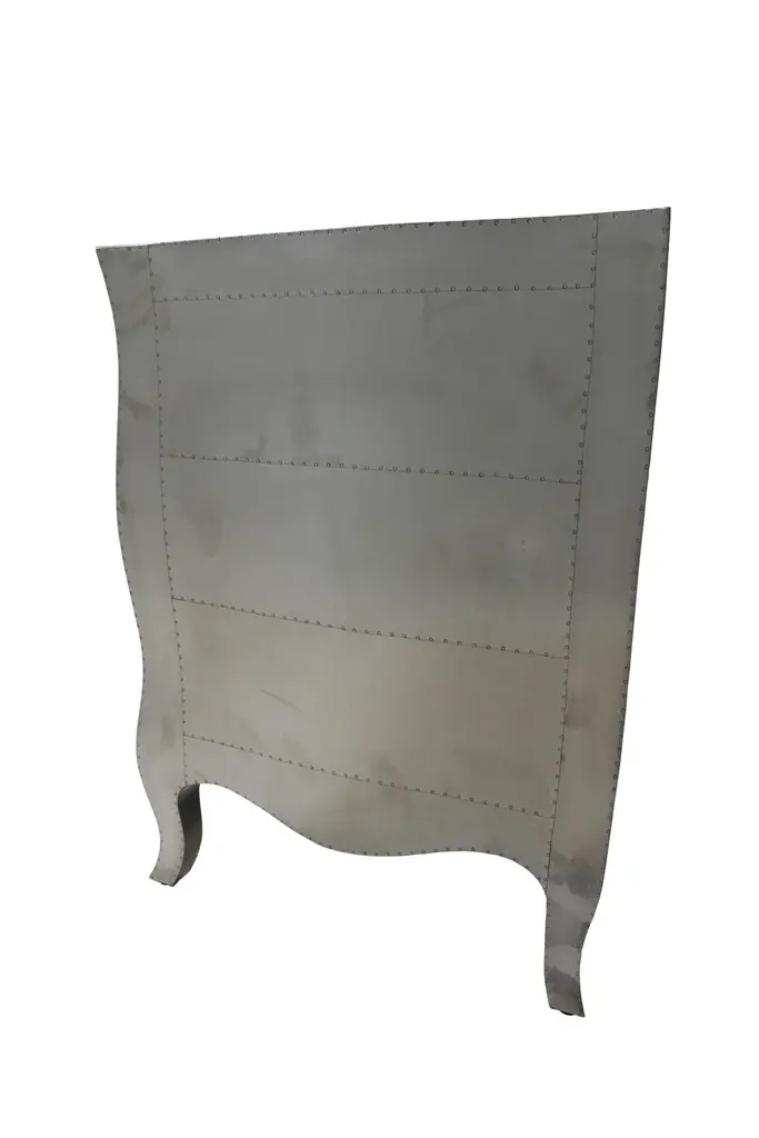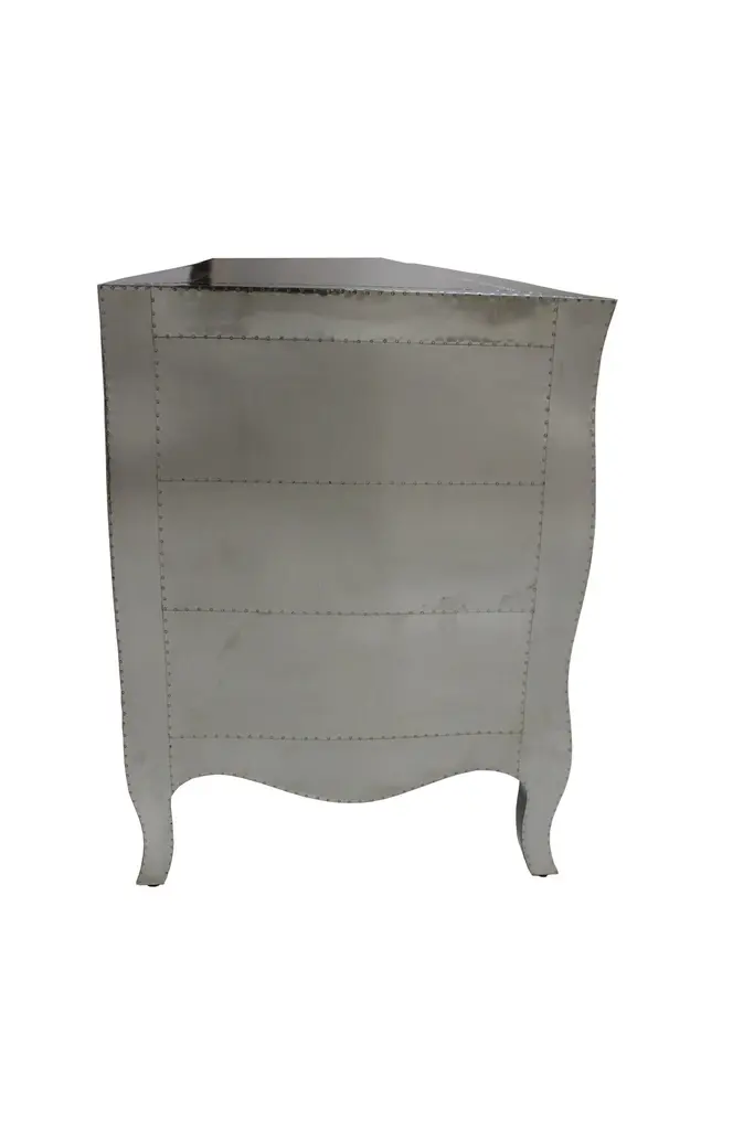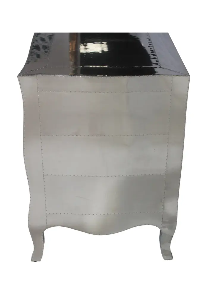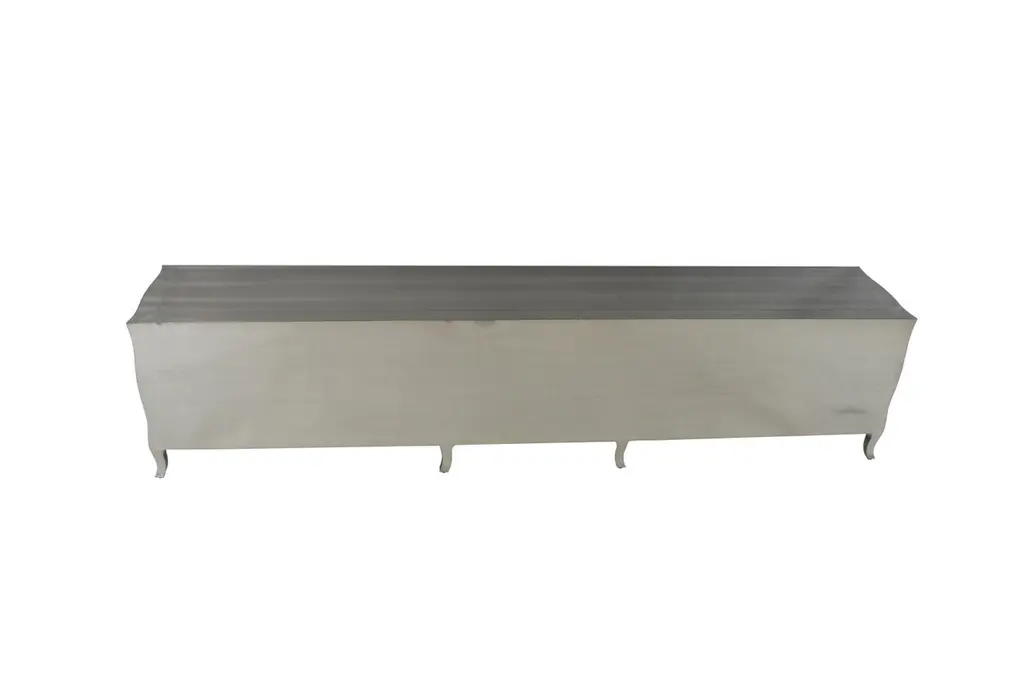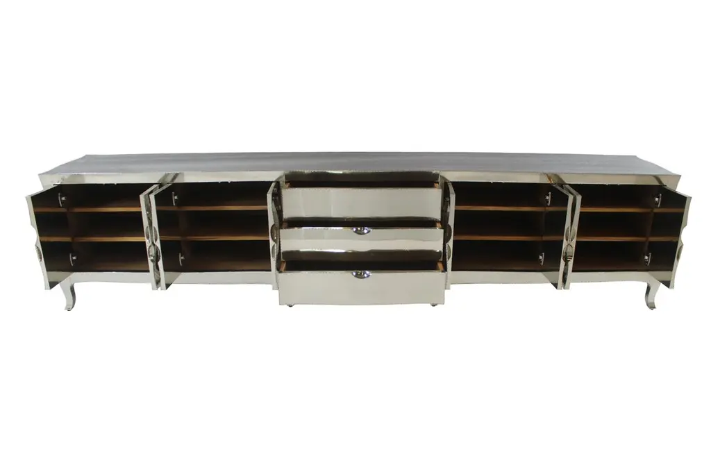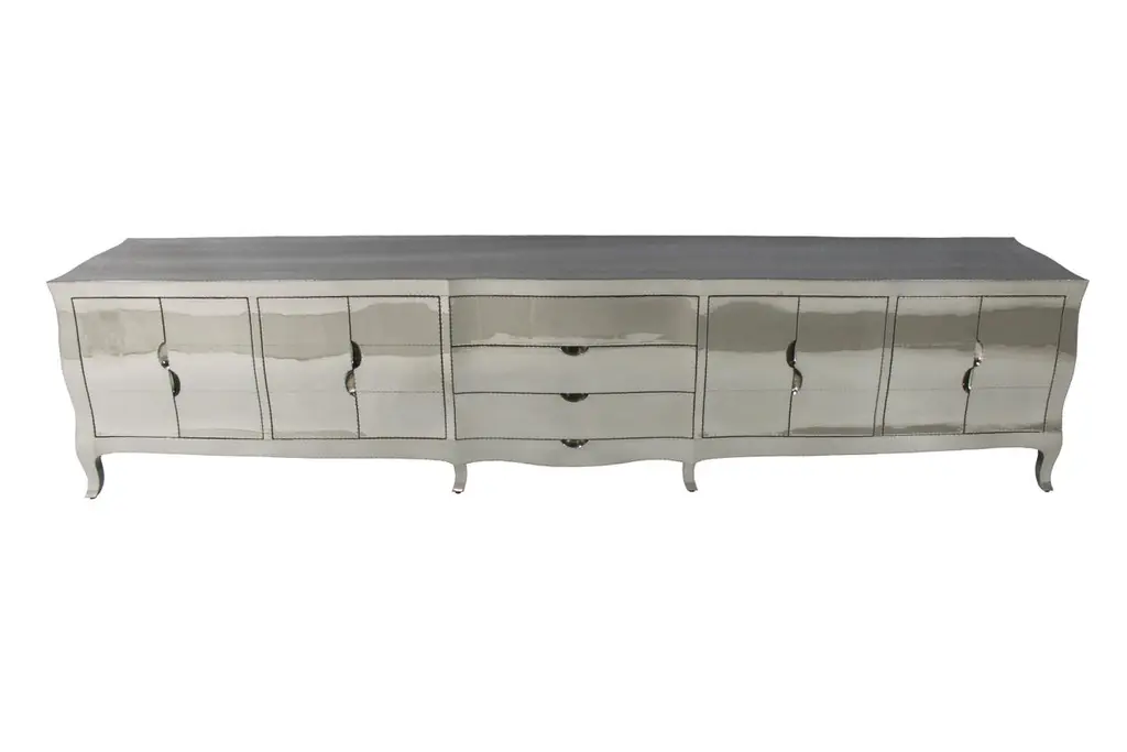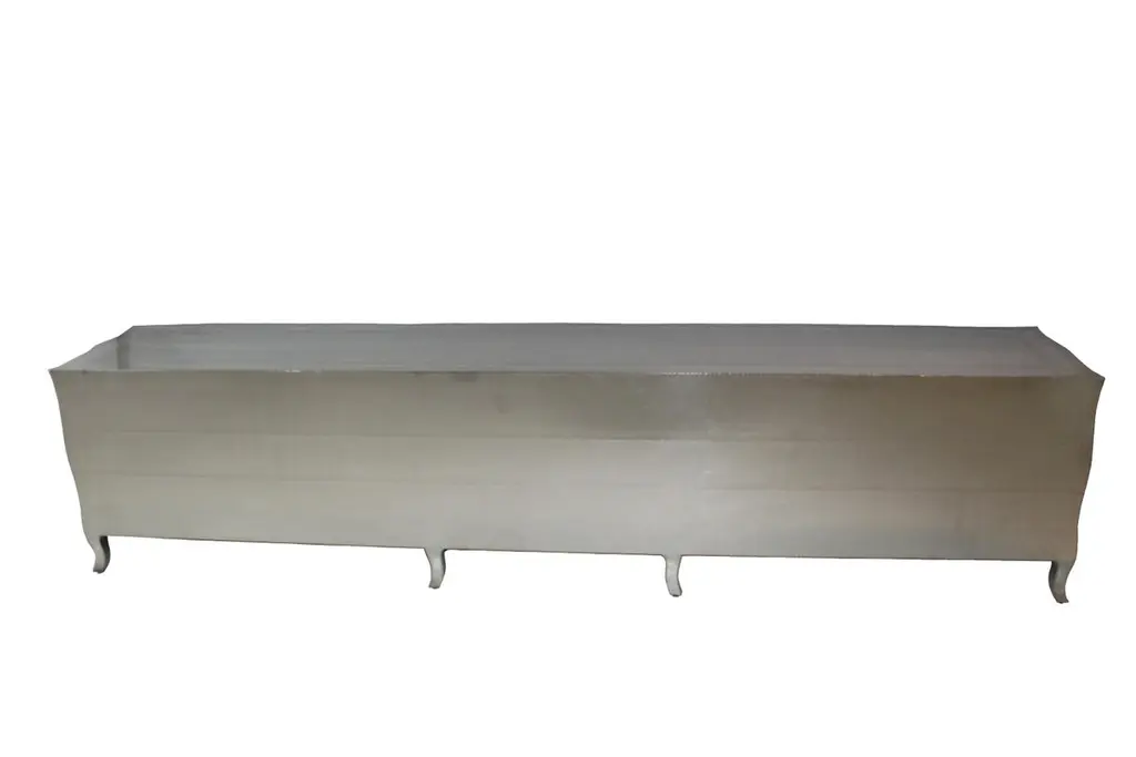 The renowned designer Paul Mathieu chose the name “Louise” when he created his more feminine version of Louis XV (1730-1760) furniture. The characteristic cabriole leg, curving outward at the knee and inward towards the foot in an "S" shape was born during this period. It is during the same era that English furniture makers produced the Queen Anne and Chippendale styles. The curved legs and side rails of this exceptionally elegant table are hand carved from solid pieces of teak. Pattern makers trace and cut complex forms that will cover the table from thick sheets of copper or silver. Once the table is joined together, it is meticulously encased in a tight-fitting skin of copper or purest silver. The silver used was assayed at 96% purity, which exceeds the minimum standard for sterling of 92.5%. Brass, White Bronze, Antiqued bronze, Silver and Copper are the available options for the metal skin. Both silver and copper will tarnish over time. Regular non-abrasive household metal polishes can be used to restore the original finish. Customization is our specialty. Please get in touch with us for any custom inquiries.Louise Credenza in White BronzeSize- 120" x 20.5" x 27.5"HMaterials - White Bronze, Teak, Hammered, Hand-CarvedPlease note that moisture in air, sudden change in temperature and natural movement of wood over time causes the metal to wrinkle or bubble up. We use well seasoned, reclaimed teak and high quality marine grade MDF (wherever technically possible) to avoid and delay the above mentioned changes. However a perfect stability of metal cannot be guaranteed.Please note that our smooth finish metal clad pieces will have some unavoidable tool marks. This is proof that everything is done by hand. The smooth finish will not come out like a machine made perfect surface and the master artisan will do their best to make it look as good/clean/stable/perfect as he possibly can. Our hammered finishes are a much safer option if the tool mark scratches are unacceptable. The hammered finishes are also safer against eventual bubbling/wrinkles due to natural forces as mentioned above. We would love to send you some samples before order confirmation so that the finish can be judged and experienced first hand.Buyer Cancellation-The cancellation charge is 25% which increases to 50% if the production is started.Prices do not include shipping from India (for custom orders) or our MN warehouse (items from stock). That will be additional.