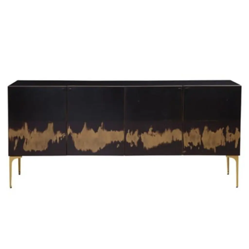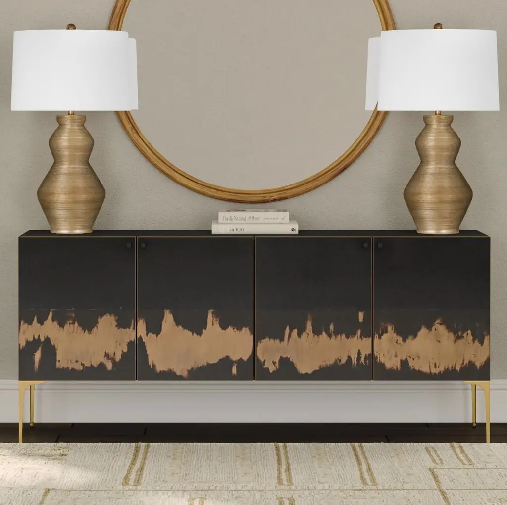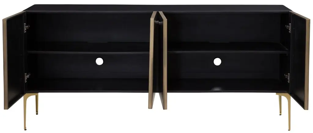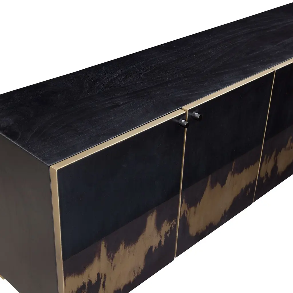 The Lucy Iron Sideboard, where modern luxe meets timeless craftsmanship. Crafted from solid iron, each of its four doors undergoes a unique acid-wash process, resulting in a one-of-a-kind piece. Inside, discover functionality with four shelves and media cord management. Resting on slim tapered legs finished in brushed gold, Lucy adds character and sophistication to any space.