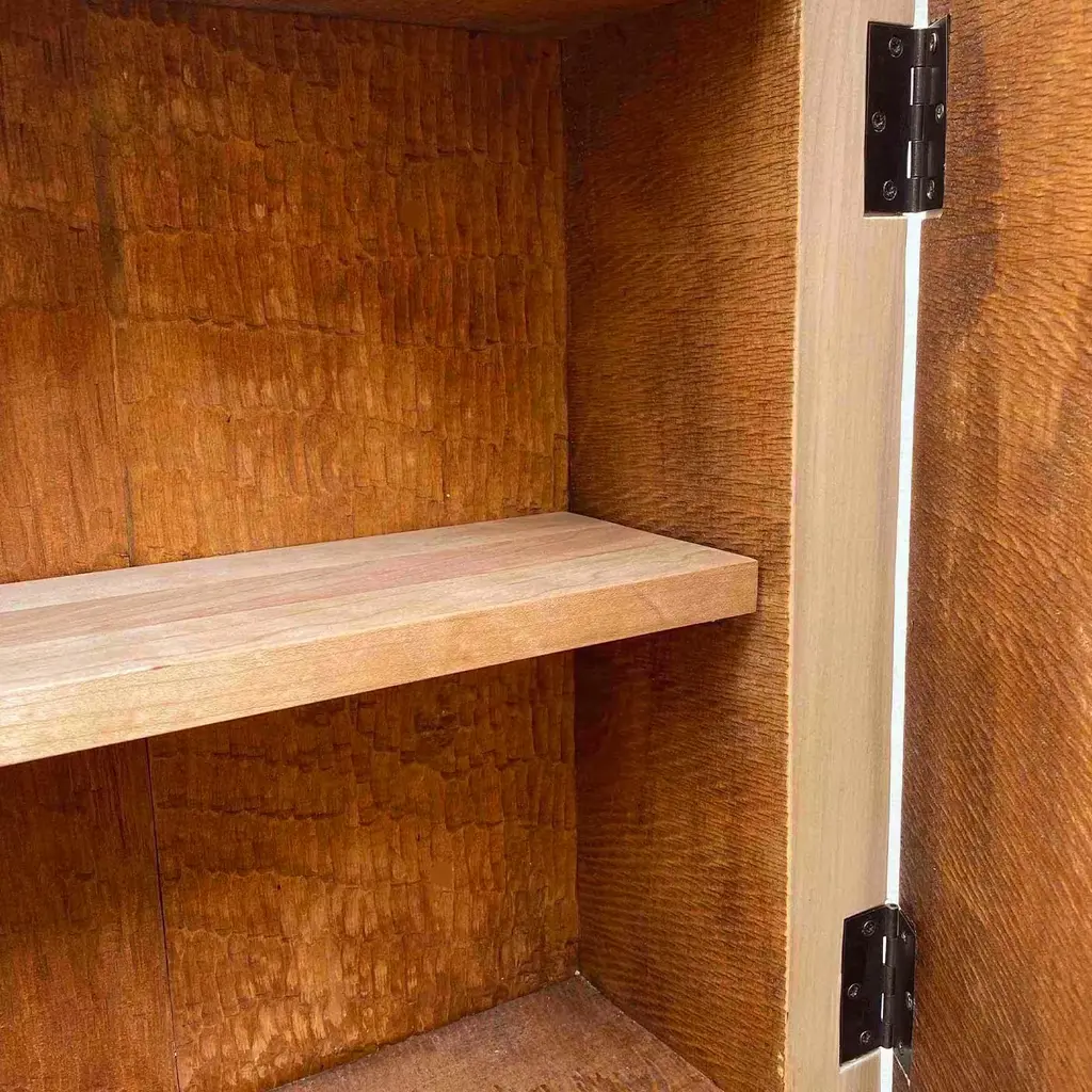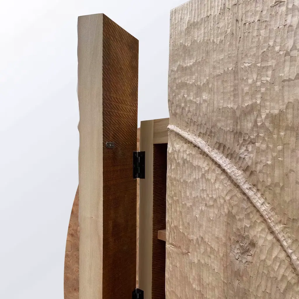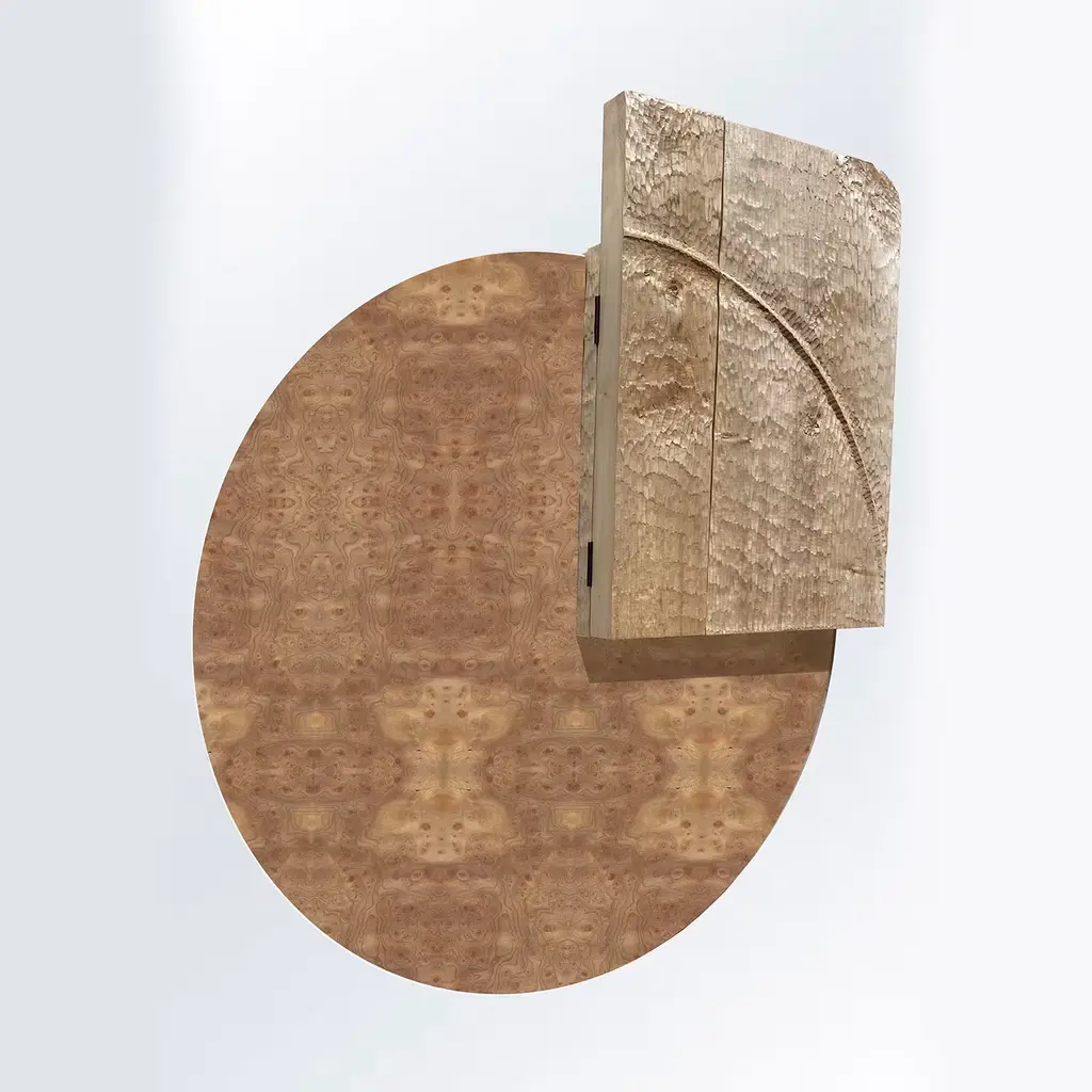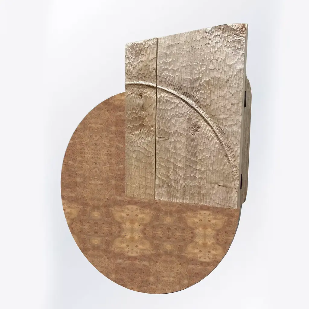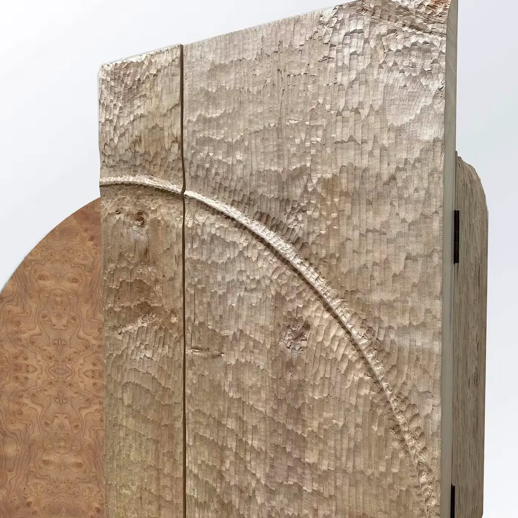 Natural grain that seduces at every glance with its hypnotizing, unique traceries is the one demanding attention in this asymmetrical sideboard of geometric inspiration. A disk in prized elm briar wood is decorated with the setting of a carved maple element, coexisting with cherry components. Two doors and an inner shelf offer discreet storage space.