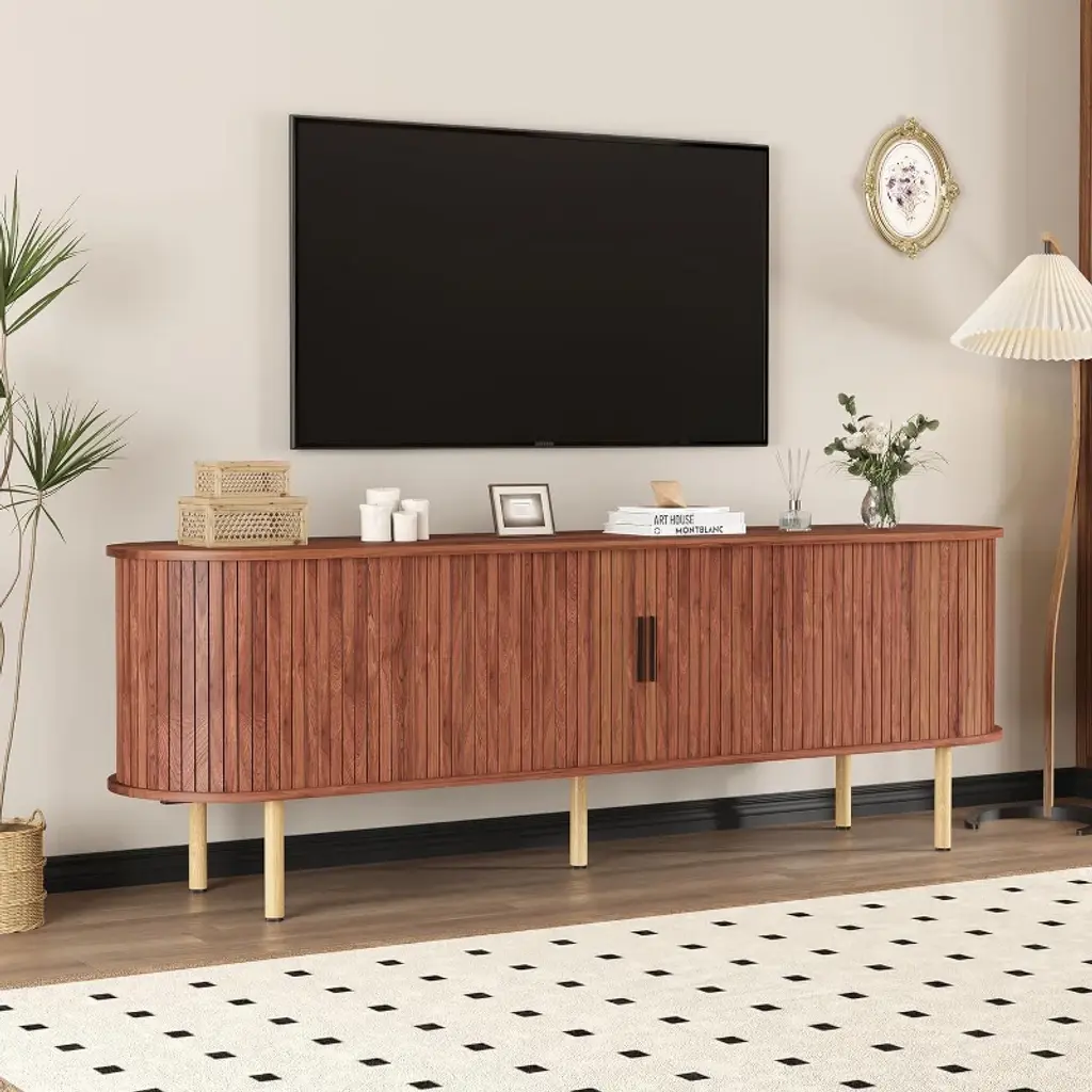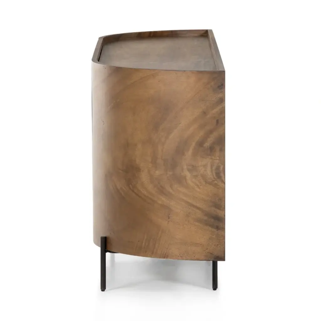 We love the gracefully curved silhouette and prominent and varied natural wood grain that makes this elegant 77” sideboard a standout in any home. The body is made from solid Guanacaste wood, so no two are exactly alike, and it is supported by a metal base and legs. The absence of cabinet hardware lends a streamlined, minimalist look. Inside are two roomy shelves that are suitable for the storage of everything from platters to media. And the top, with its raised edge, is ideal for displaying decor or for using as a coffee station when you’re entertaining. This piece has a finished back so can be floated in a room.