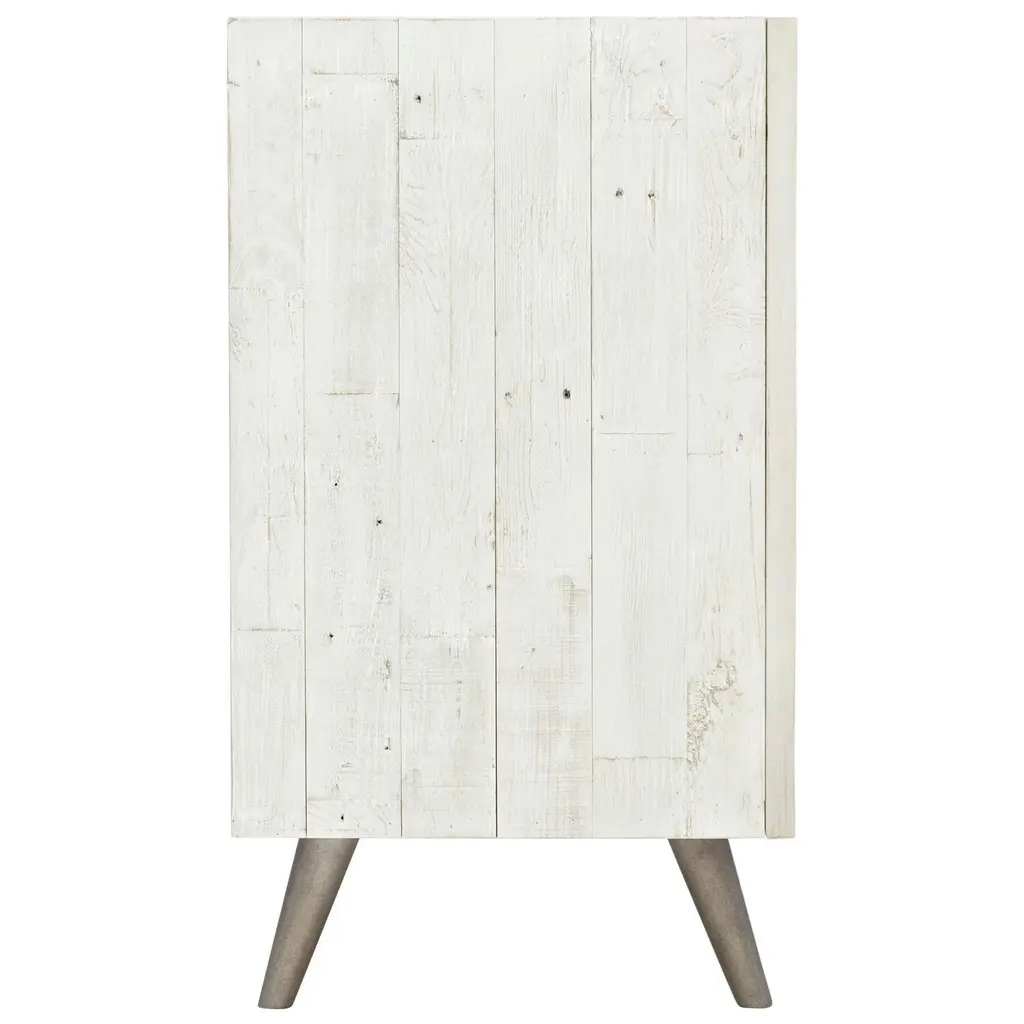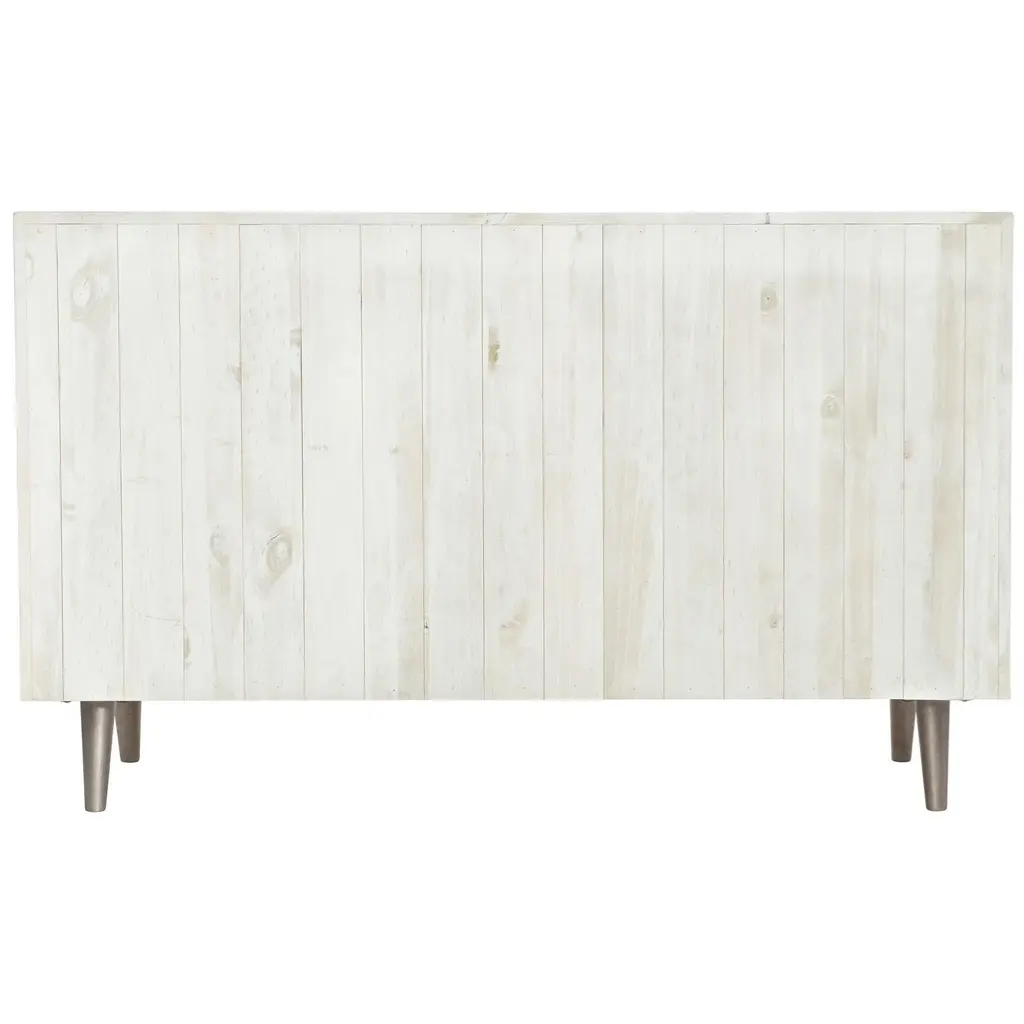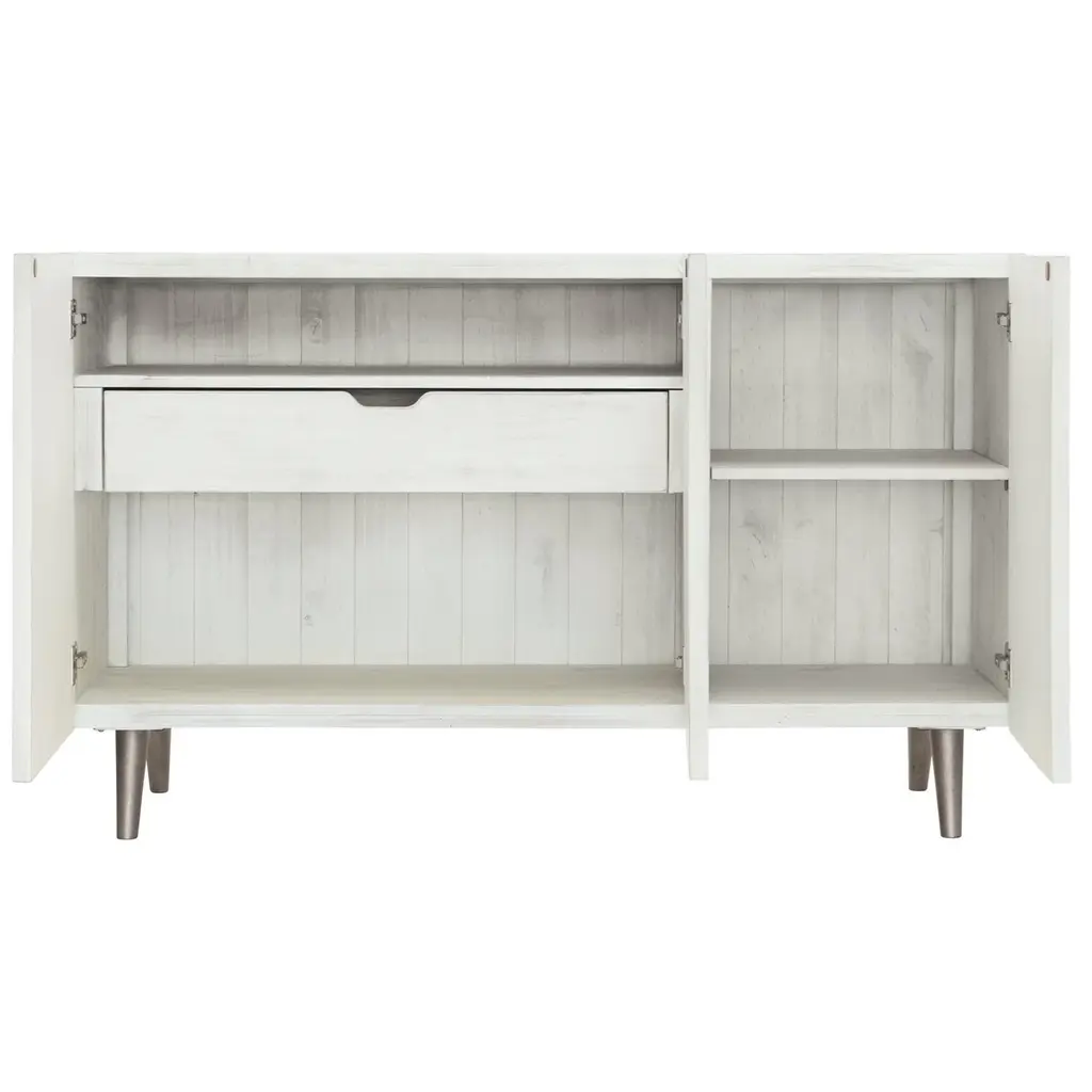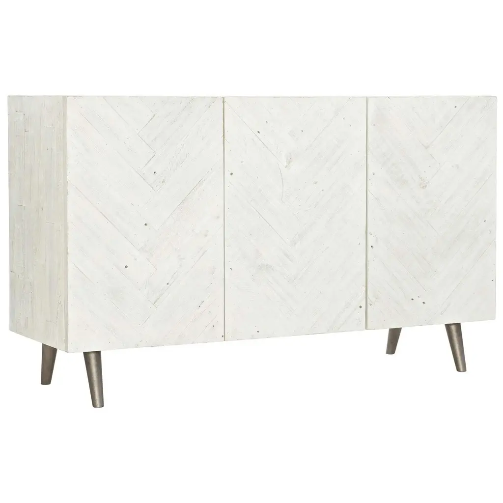 The rustic but modern look is completed by the light finished planks of distressed pine. Having three doors with storage behind, you will not have to worry about storage space with the four shelves and one drawer inside. From the Manufacturer Brushed White finish Three fancy face self/soft-closing doors with herringbone patterned overlays Behind paired left and center doors is one drawer with hand cut-out and one fixed shelf surface Behind right door is one adjustable/removeable shelf and fixed bottom shelf surface Planked top, end panels and back Wood legs in faux metal finish Adjustable glides Anti-tip kit