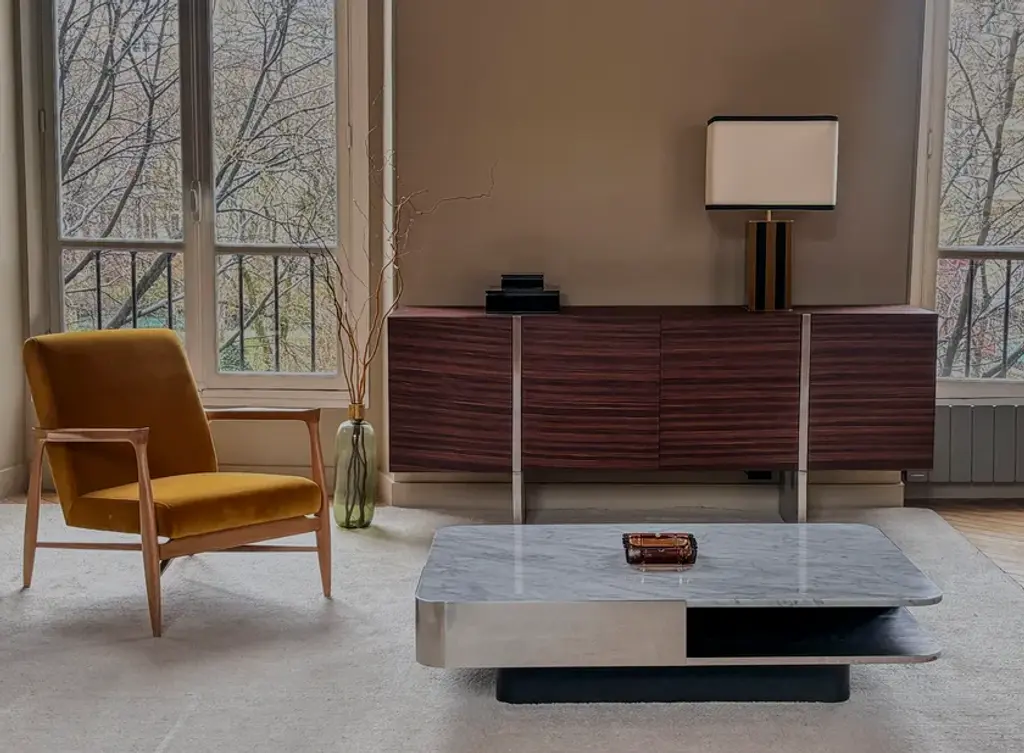 The Maestra sideboard is a real showpiece in our collection, with its generous volume. The suspended body of the sideboard is raised by a graphic pedestal base. The Maestra sideboard is finished in rosewood on the front and a beautiful stainless steel finish on the sides, giving it a daring look. This piece has everything it takes to play a major role in your home.