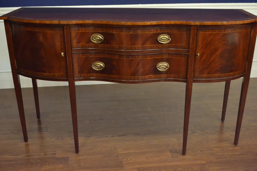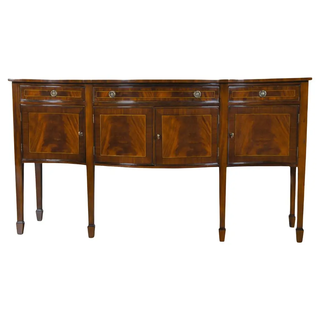This is a new traditional mahogany sideboard. It’s design was inspired by the Hepplewhite sideboards from the Regency period and features a Classic serpentine shaped front. It features doors, drawers and a top with swirly crotch mahogany fields and straight grain mahogany borders. The drawers are masterfully dovetailed and the drawer boxes are made of oak. The solid brass hardware includes mortised locks on the top drawer. It has a hand steel wool rubbed and polished satin finish. Dimensions: Width 68 in., depth 24 1/4 in., height 38 1/2 in.Optional features include optional finishes and hardware.