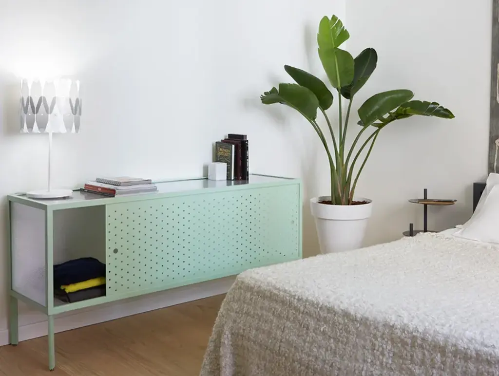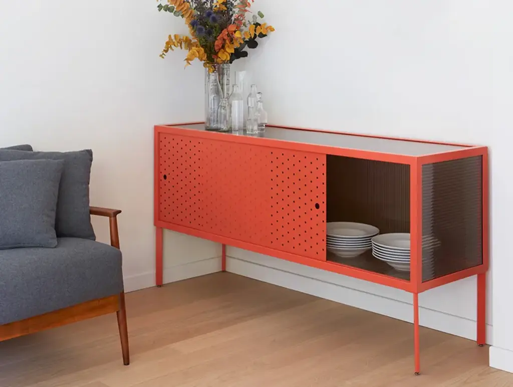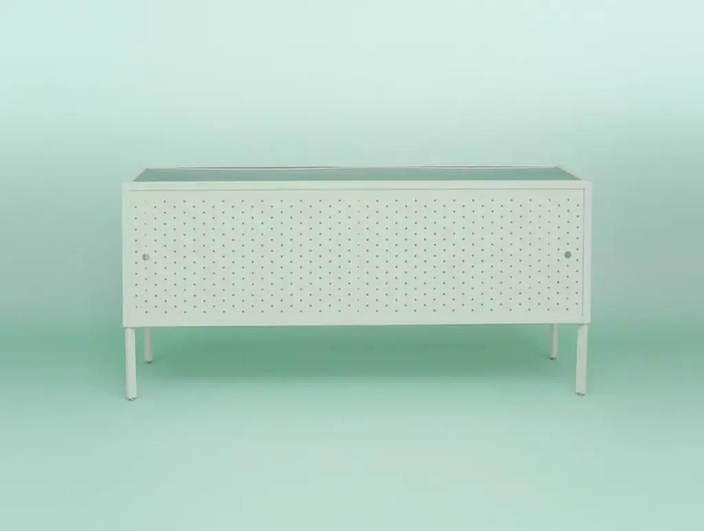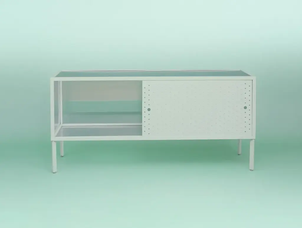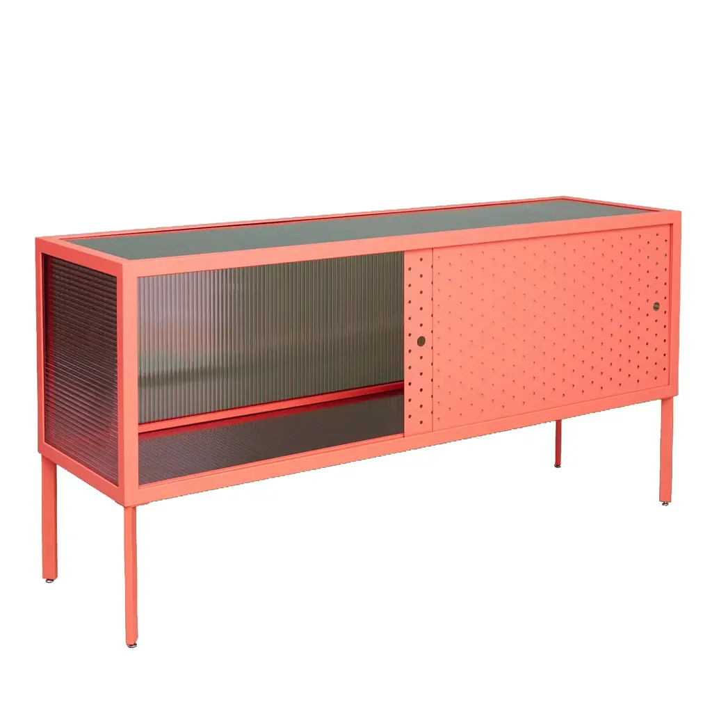 Maia is a sideboard with an essential design, perfect for contemporary interiors. The structure, with a rationalist aesthetic, is made of metal, covered in transparent or smoked polycarbonate.