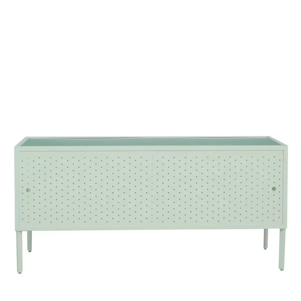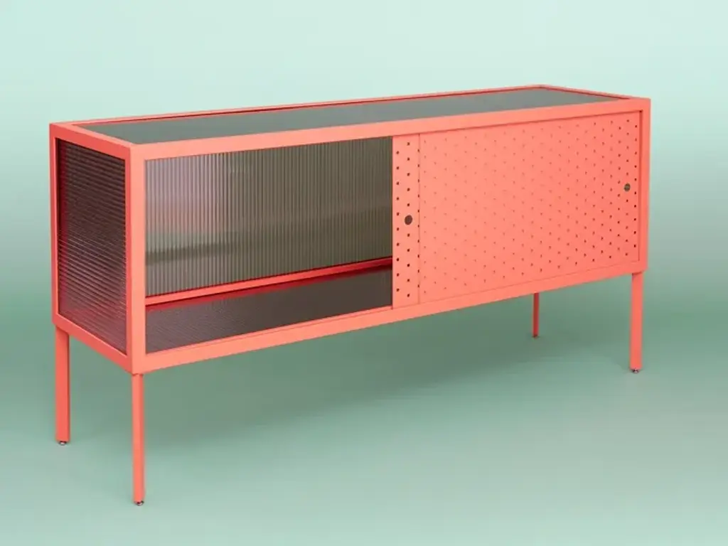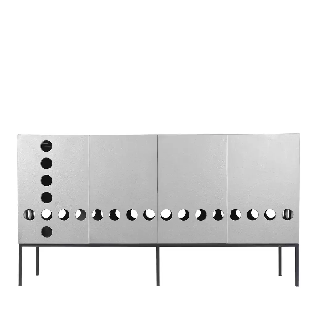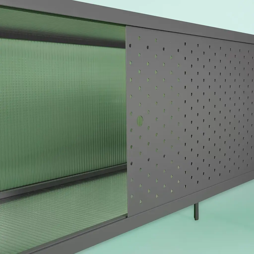 The Maia Sideboard features a minimalist design with a rationalist aesthetic, ideal for contemporary interiors. Its metal structure, presented in a gray finish, is defined by perforated doors that provide both ventilation and visual depth. The top panel is made of transparent polycarbonate, also available in a smoked version, offering durability while maintaining a refined appearance. Designed by Michele Giacopini & MM Company. A sand version is available in the Artemest catalog, with additional color options upon request. Please contact the Concierge for further information.