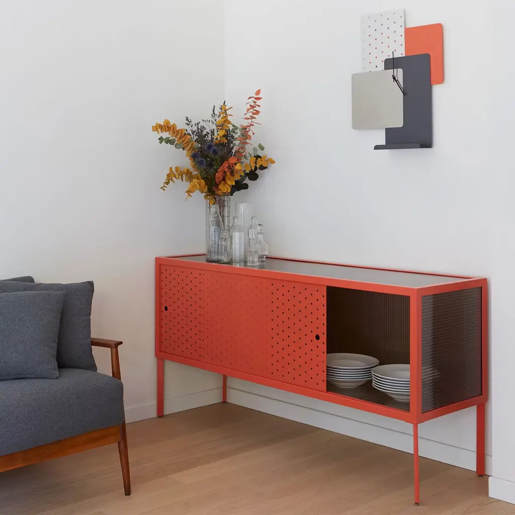 Sideboard Maia is a sideboard with an essential design, perfect for contemporary interiors. The structure, with a rationalist aesthetic, is made of metal, covered in transparent or smoked polycarbonate.