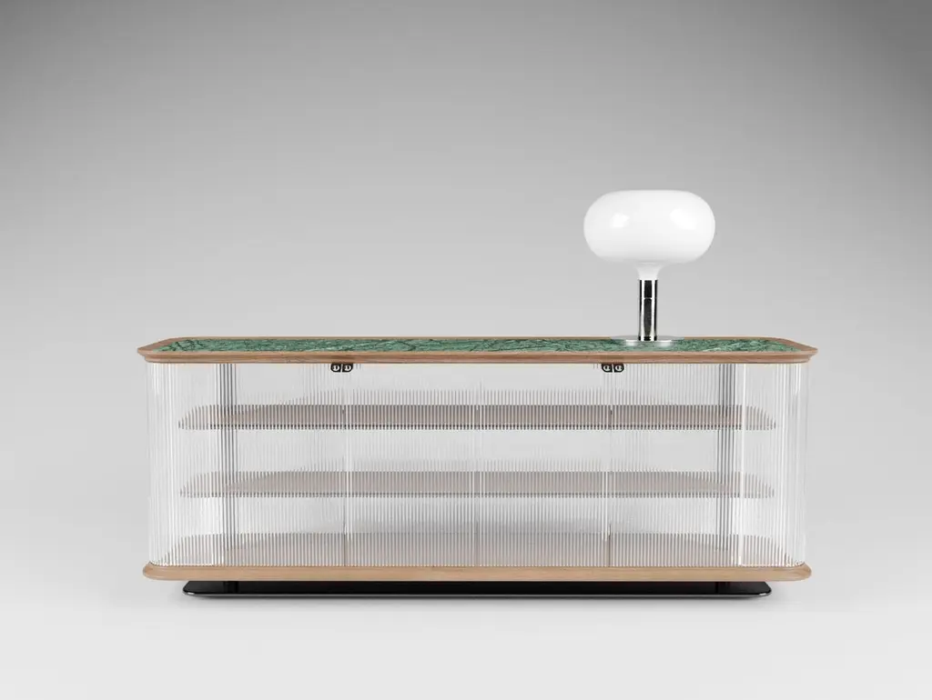 Sideboard Maia is a sideboard with an essential design, perfect for contemporary interiors. The structure, with a rationalist aesthetic, is made of metal, covered in transparent or smoked polycarbonate.