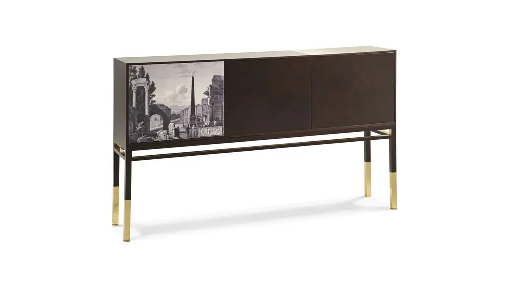 Storage unit in Louro Preto veneer on MDF, slab in polished brass on the right hand side of the top. 3 doors with push-to-open mechanism, exterior facade of left door with "Arles" printing, interior facade with CABANON printing. 2 shelves with pegs in wood, central and right doors in Louro Preto veneer. Base in Louro Preto veneer on Acacia with polished stainless steel applications with brass finish, leg base in polished stainless steel with brass finish. Also available in other dimensions. Manufactured in Europe.