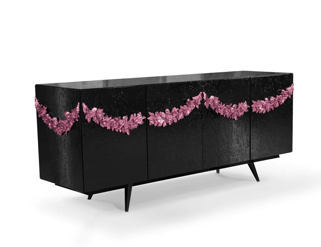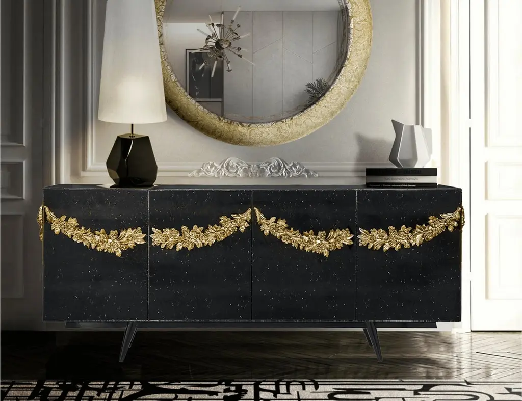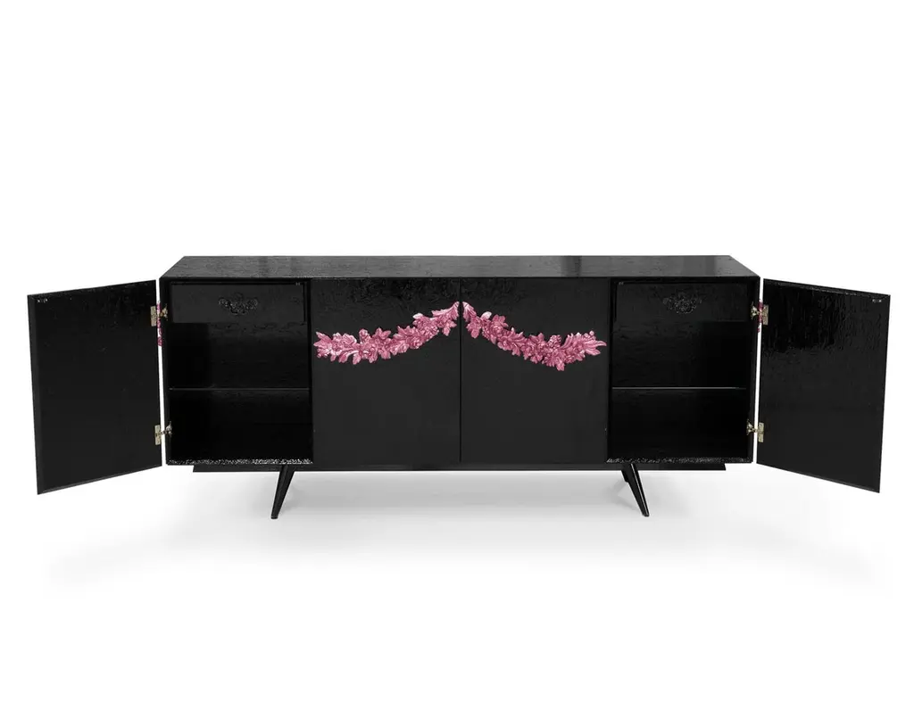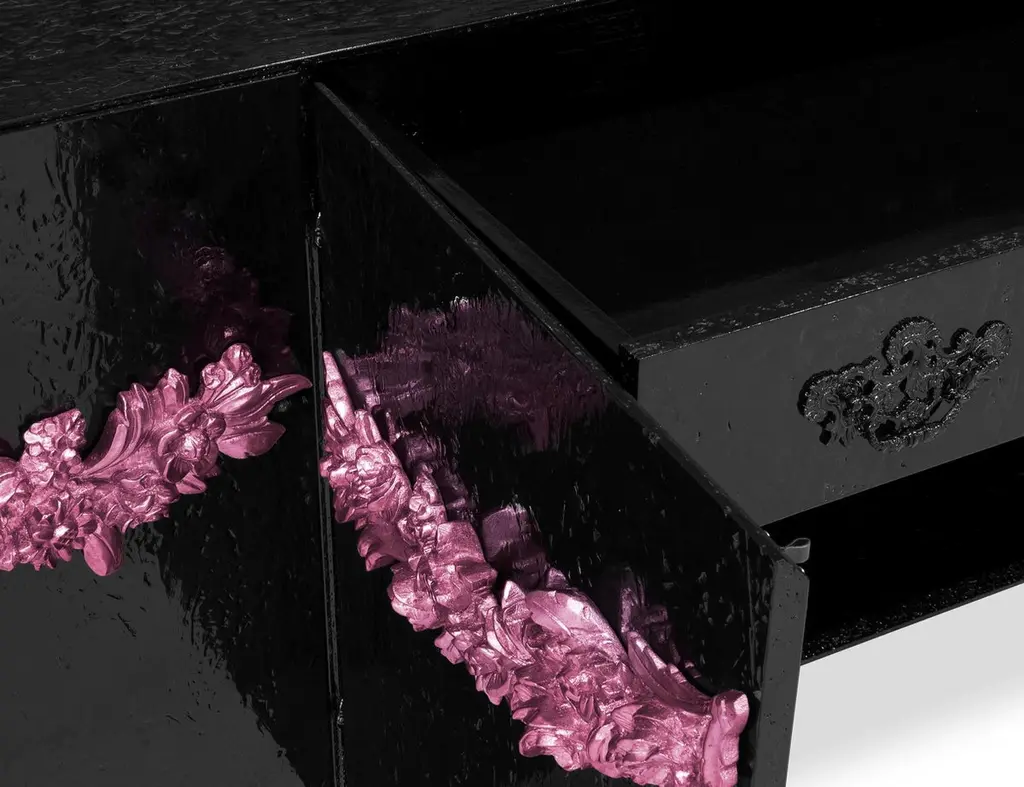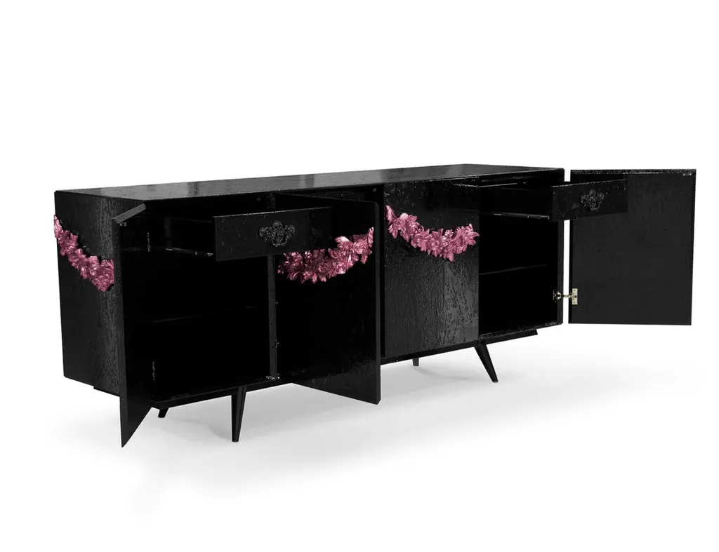 More than just a Café, the Majestic tells the history of Oporto. The Oporto of the twenties, of political gatherings and discuss of new ideas. It was also the Belle Epoch period, a time of writers and artists. To honor this period and this emblematic Café, Boca do Lobo designed Majestic, a modern black sideboard, highly stylish, that provides a generous amount of storage space without being too imposing. It is a unique piece of furniture that lends an attractive presence to any room. Four flush doors open discreetly to the interior of the piece where you will find elegant drawers and functional shelving. Hand carved wood garland drapes the sideboard and functions as the doors pulls. The piece is framed in particleboard, which gives the black high gloss lacquer finish its textured appearance.