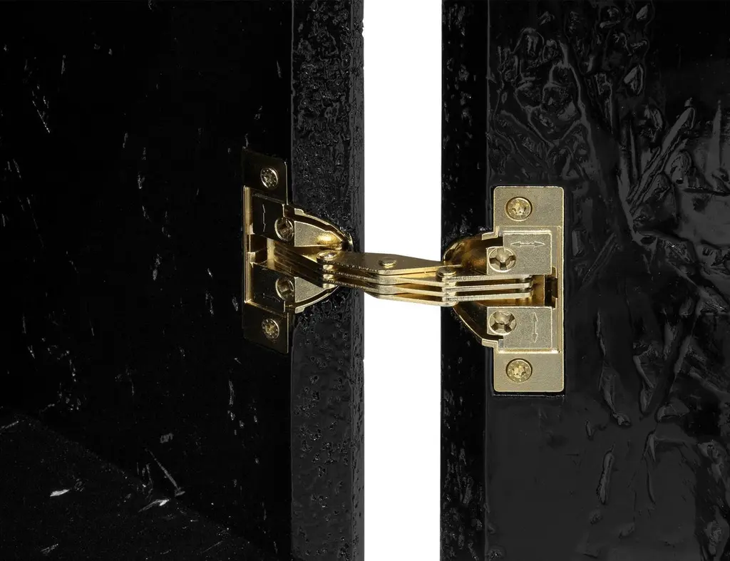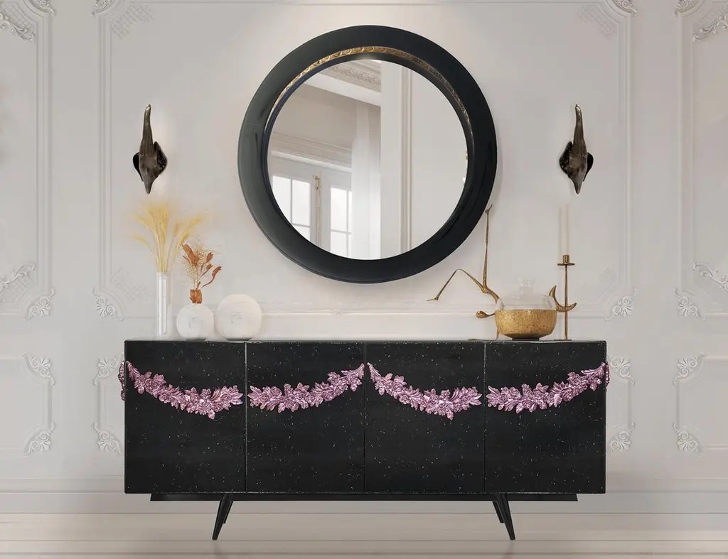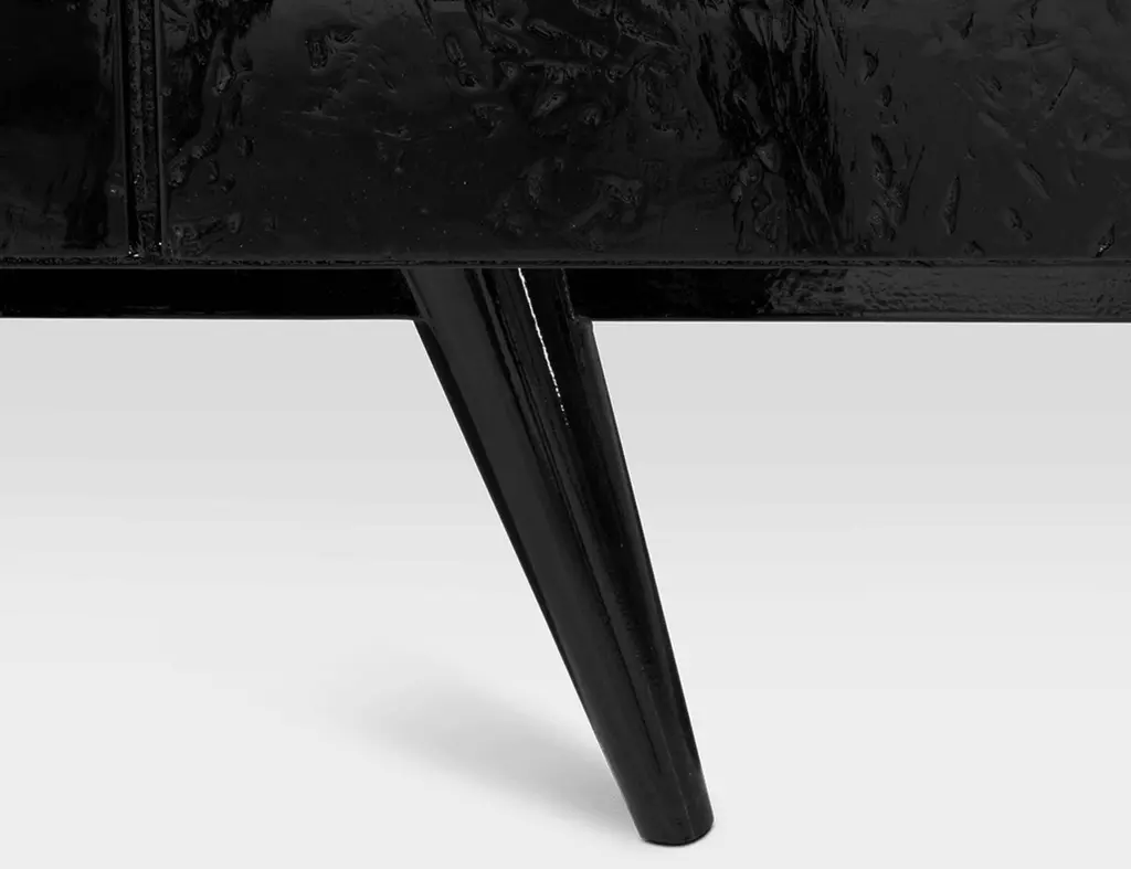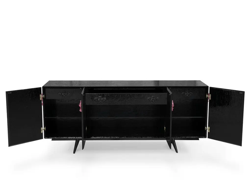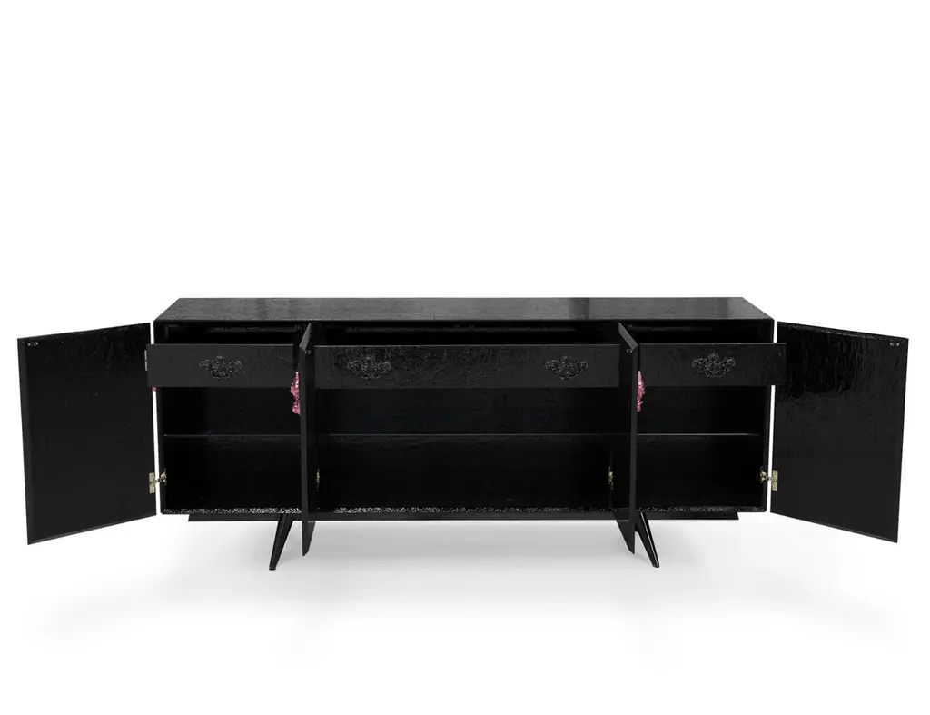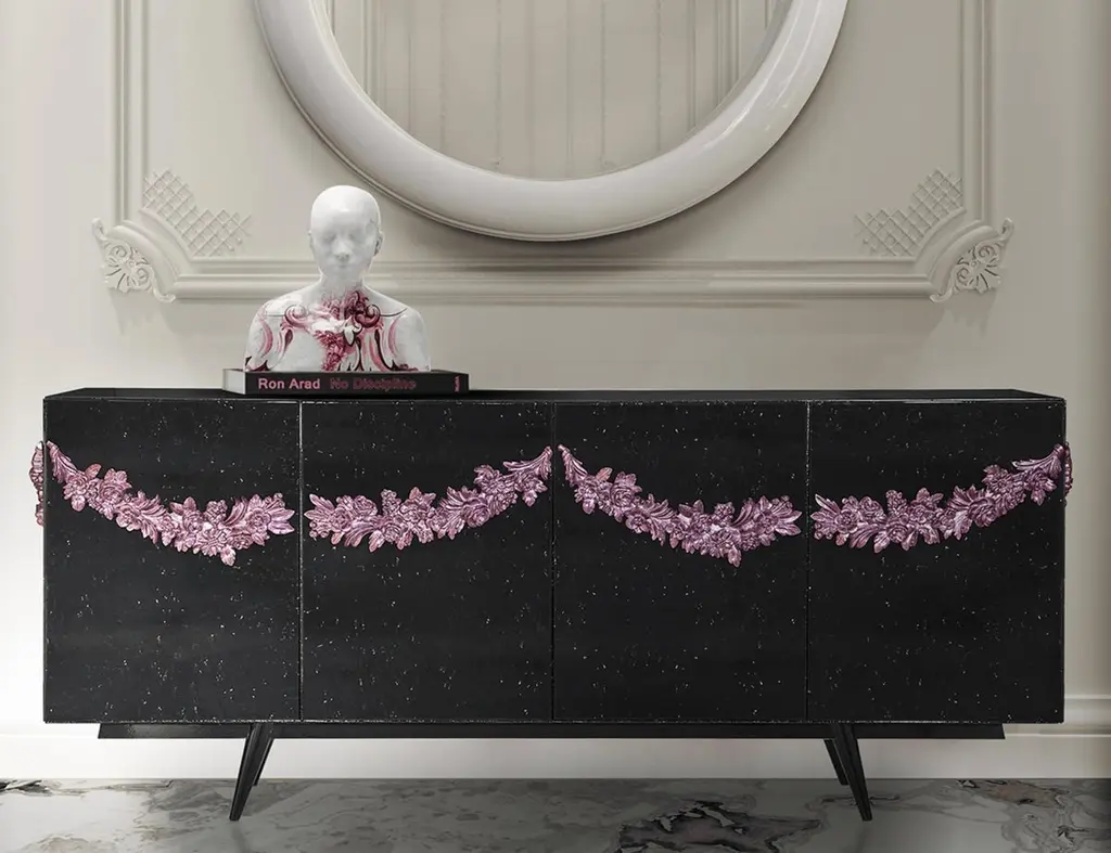 More than just a Café, the Majestic tells the history of Oporto. The Oporto of the twenties, of political gatherings and discuss of new ideas. It was also the Belle Epoch period, a time of writers and artists. To honor this period and this emblematic Café, Boca do Lobo designed Majestic, a modern black sideboard, highly stylish, that provides a generous amount of storage space without being too imposing. It is a unique piece of furniture that lends an attractive presence to any room. Four flush doors open discreetly to the interior of the piece where you will find elegant drawers and functional shelving. Hand carved wood garland drapes the sideboard and functions as the doors pulls. The piece is framed in particleboard, which gives the black high gloss lacquer finish its textured appearance.
