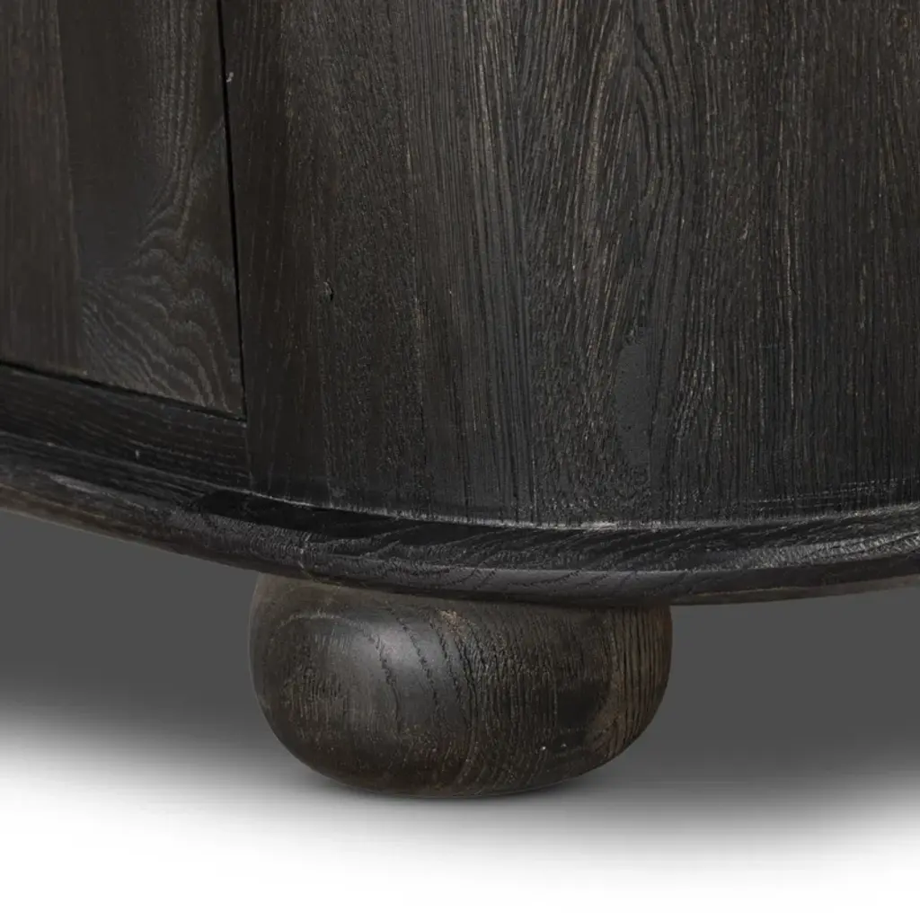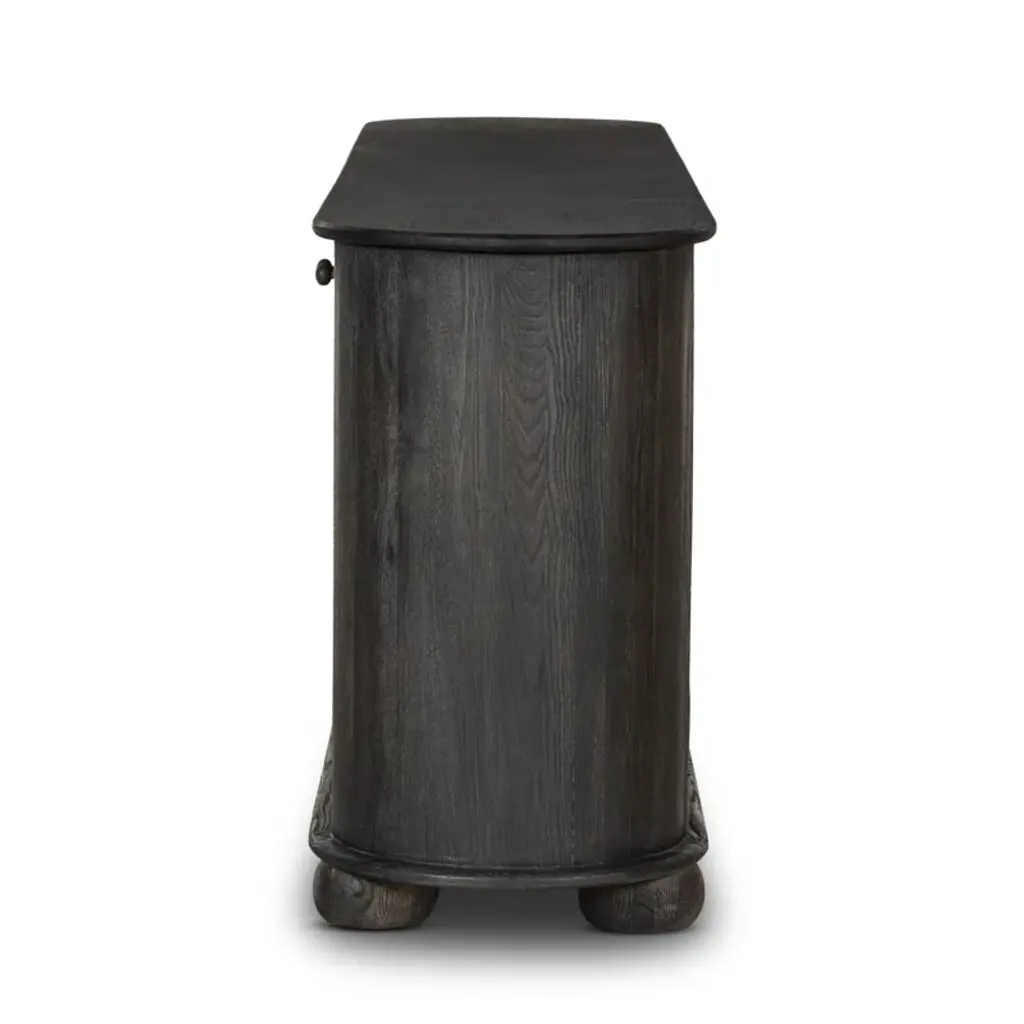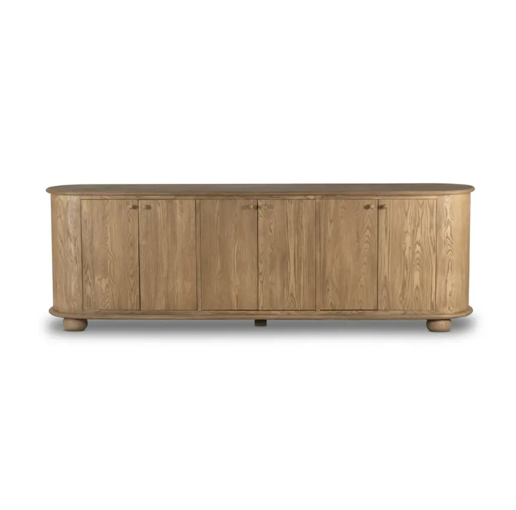A design collaboration by Amber Lewis and Four Hands. An antique-inspired shape in a simple oval format gives this sideboard a classic polished look. A slight overhang of the top and bottom slabs adds visual interest, while simple ball-shaped hardware mimics this sideboard's unique bun feet. Made from solid oak with a finish displays mixed straight and cathedral grain to showcase the wood's natural characteristics. Ample storage abounds in this substantial, six-door sideboard.