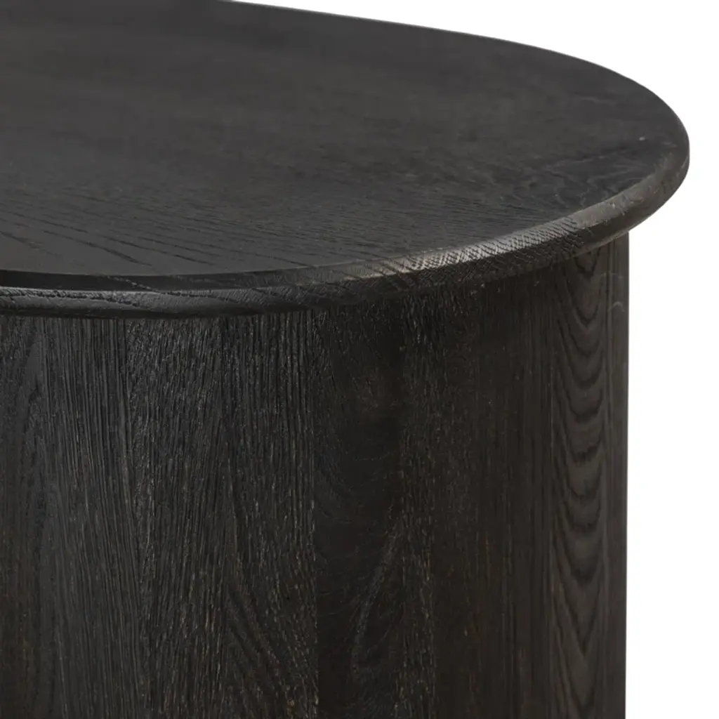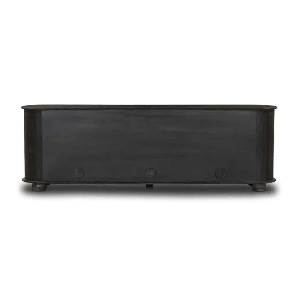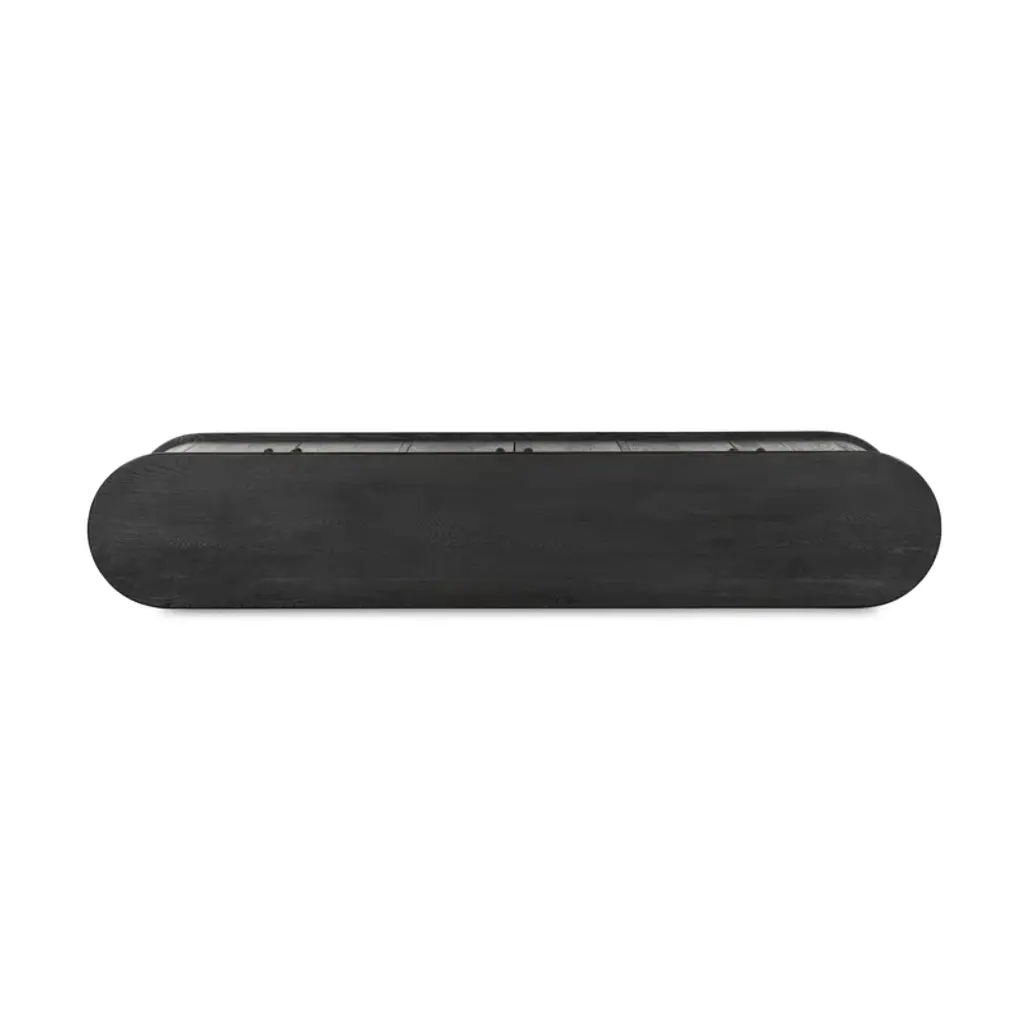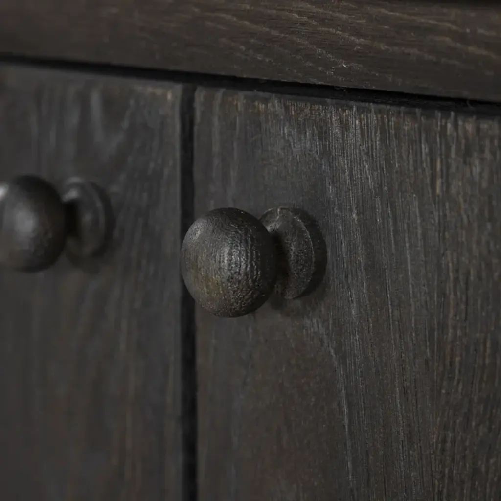 A design collaboration by Amber Lewis and Four Hands. An antique-inspired shape in a simple oval format gives this sideboard a classic polished look. A slight overhang of the top and bottom slabs adds visual interest, while simple ball-shaped hardware mimics this sideboard's unique bun feet. Made from solid oak with a finish displays mixed straight and cathedral grain to showcase the wood's natural characteristics. Ample storage abounds in this substantial, six-door sideboard.
