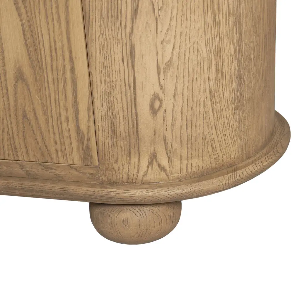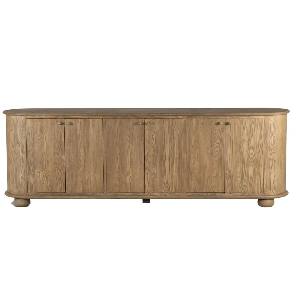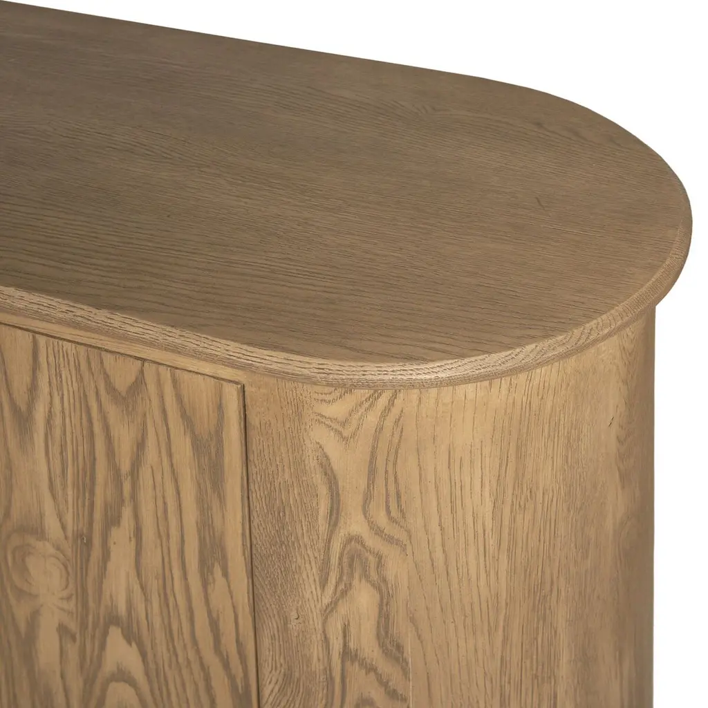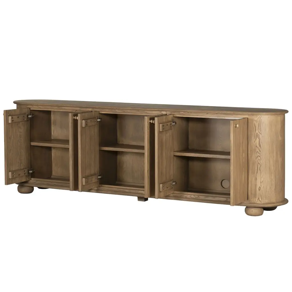 An antique-inspired shape in a simple oval format gives this sideboard a classic polished look. A slight overhang of the top and bottom slabs adds visual interest, while simple ball-shaped hardware mimics the sideboard's unique bun feet. Made from solid oak, it displays mixed straight and cathedral grain to showcase the wood's natural characteristics. Ample storage abounds in this substantial, six-door sideboard.