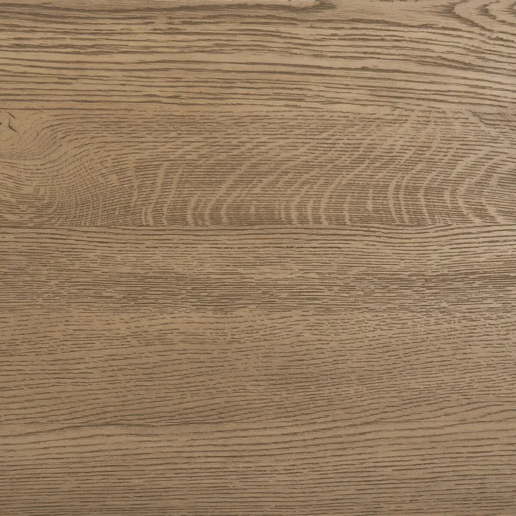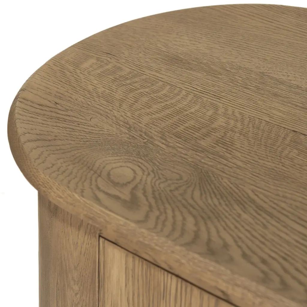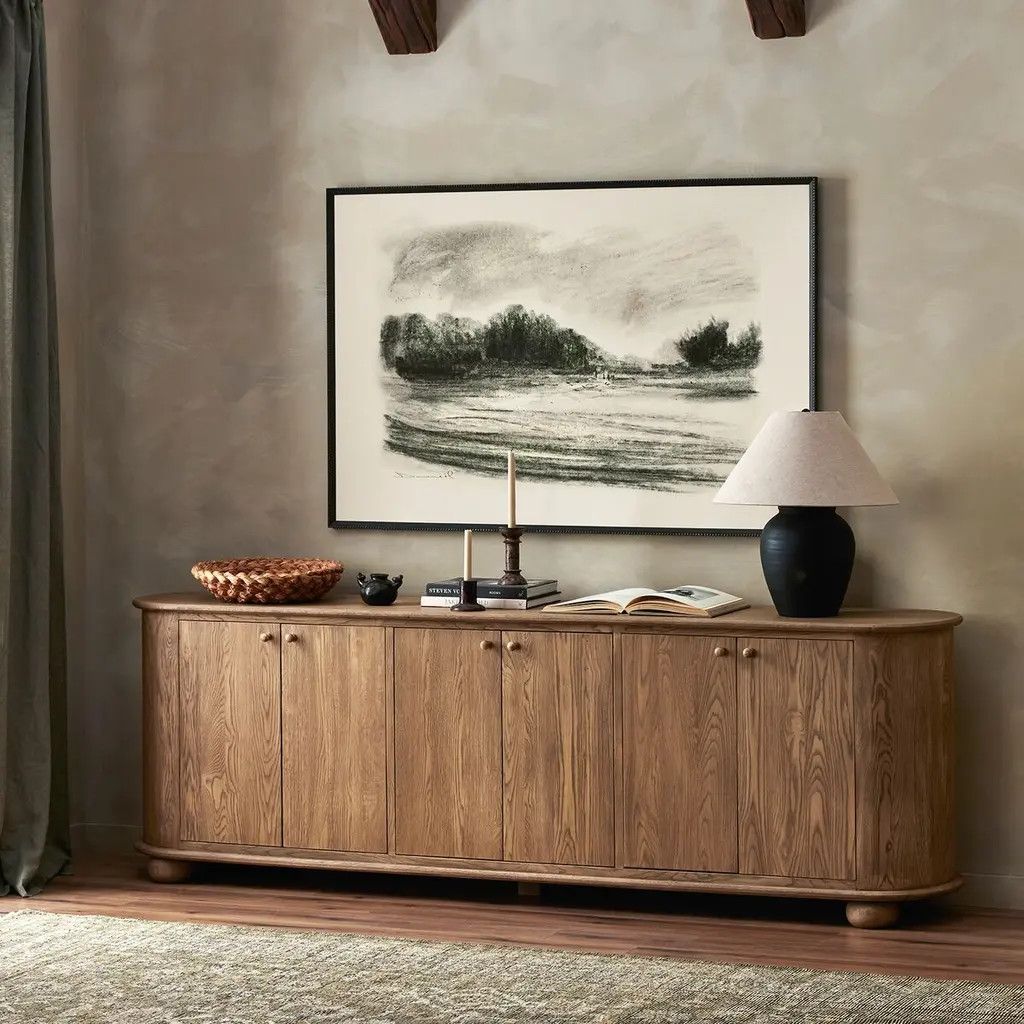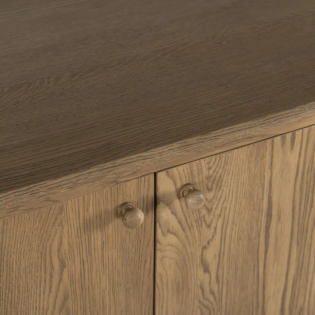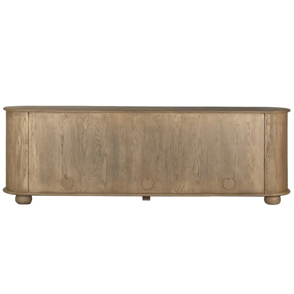 An antique-inspired shape in a simple oval format gives this sideboard a classic polished look. A slight overhang of the top and bottom slabs adds visual interest, while simple ball-shaped hardware mimics the sideboard's unique bun feet. Made from solid oak, it displays mixed straight and cathedral grain to showcase the wood's natural characteristics. Ample storage abounds in this substantial, six-door sideboard.