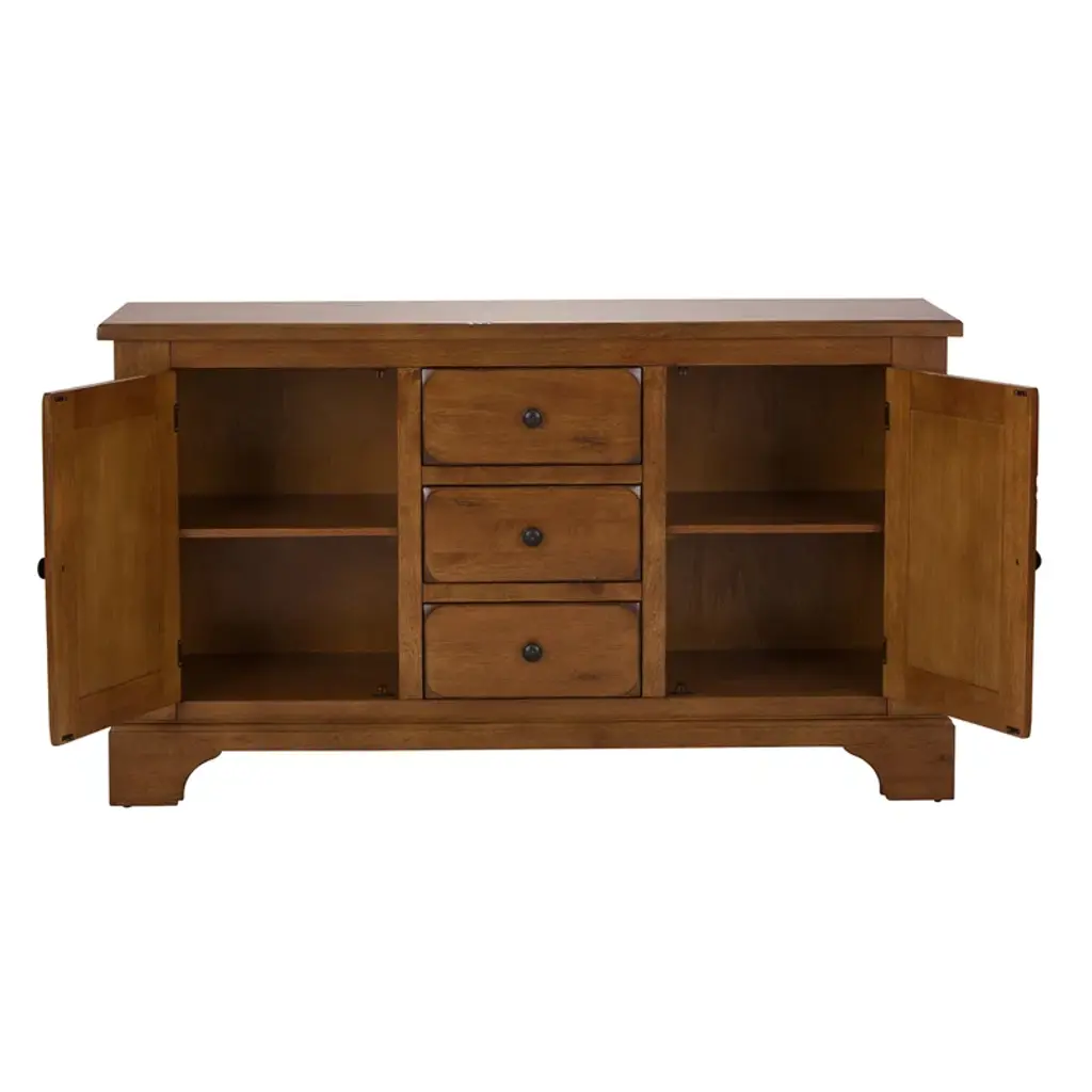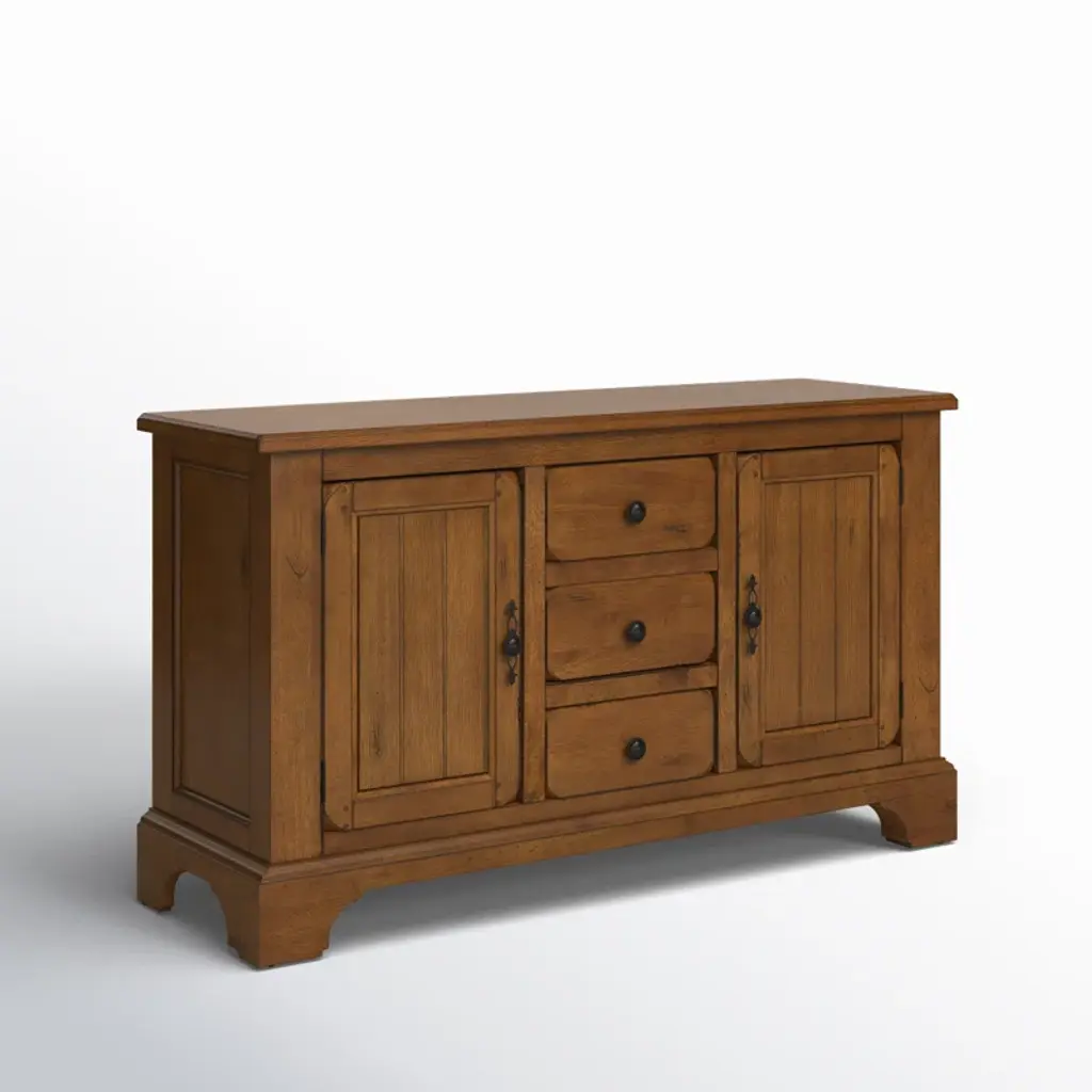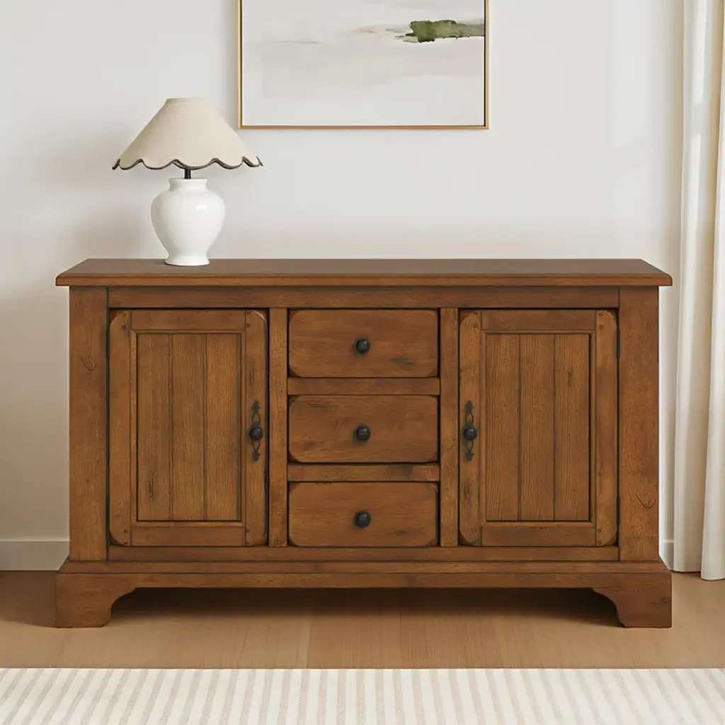 This 61" wide sideboard has a rustic oak finish that's accented with man-made wormholes and distressed details. We love that it looks like an antique, but it gets delivered right to your door. It's made from solid and engineered wood, and has a clean-lined silhouette that's paired with classic details like bracket feet and rounded drawer and cabinet edges. This server has three drawers and a total of four shelves where you can store everything from extra serving platters to seasonal tablecloths.