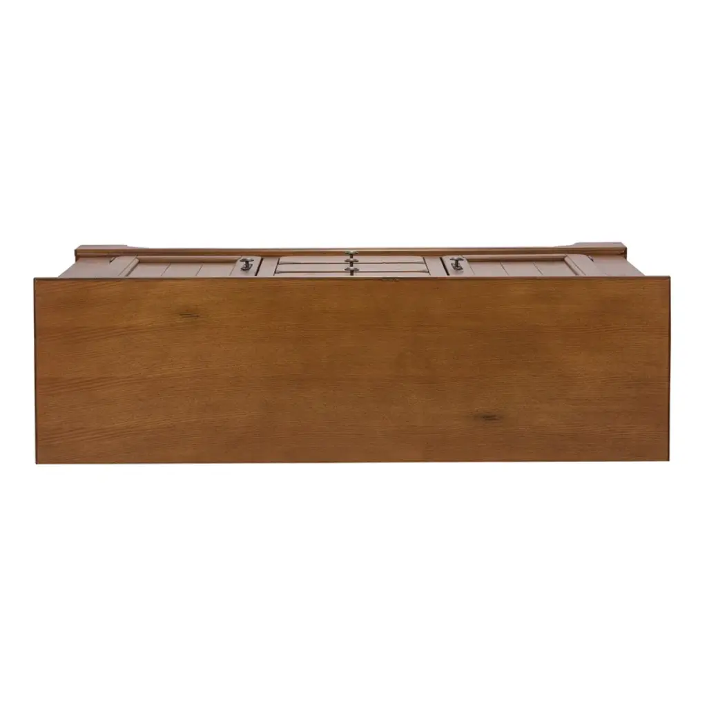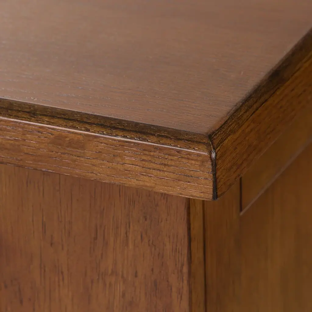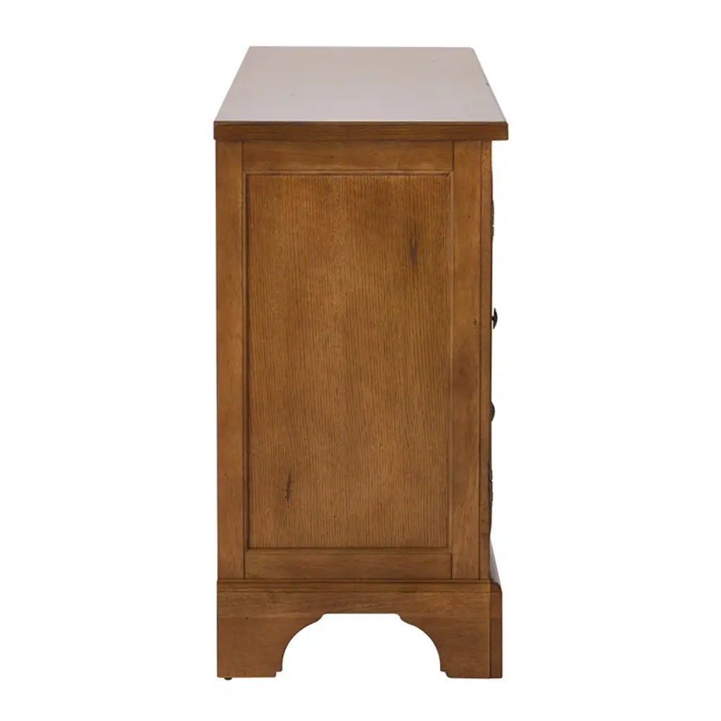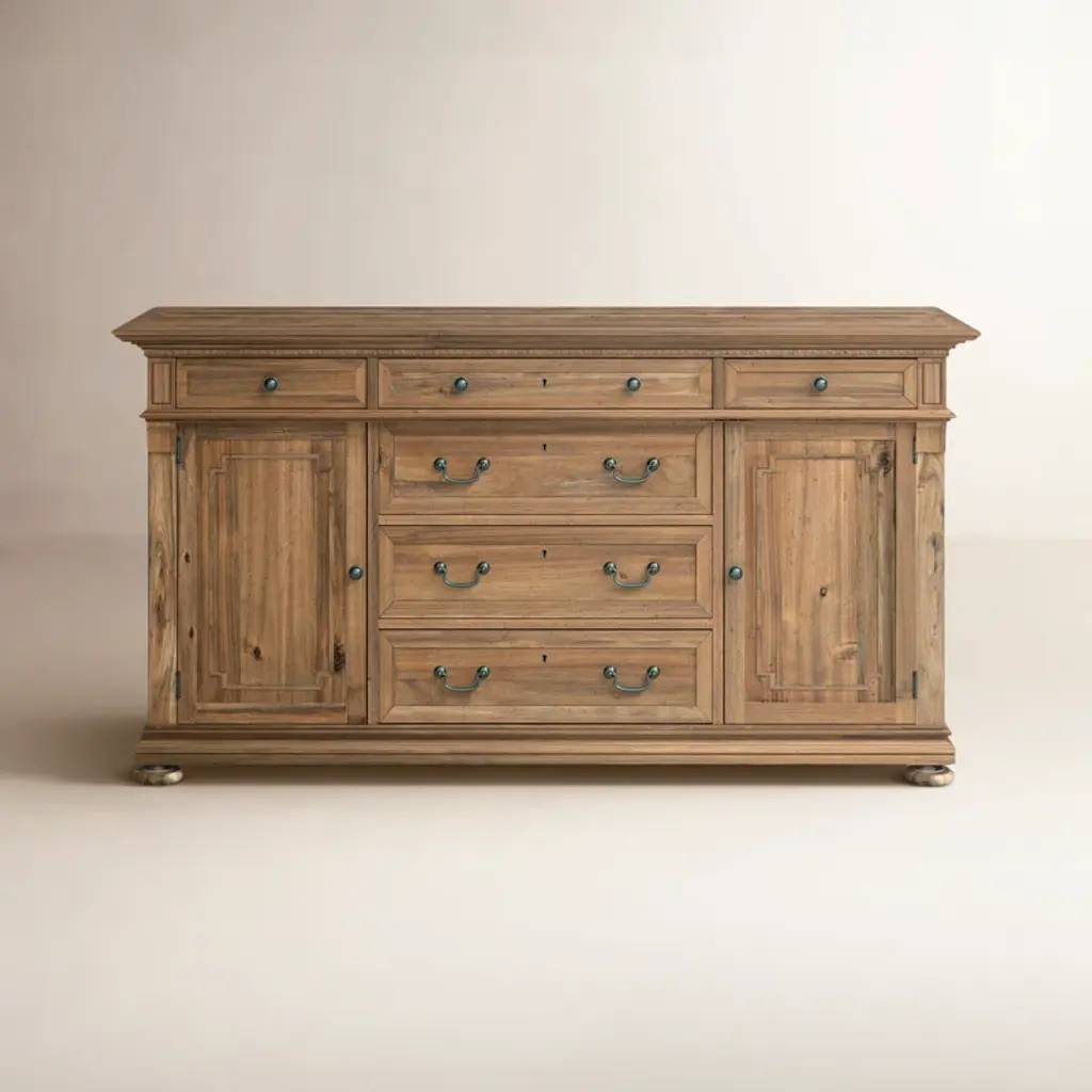 This 61" wide sideboard has a rustic oak finish that's accented with man-made wormholes and distressed details. We love that it looks like an antique, but it gets delivered right to your door. It's made from solid and engineered wood, and has a clean-lined silhouette that's paired with classic details like bracket feet and rounded drawer and cabinet edges. This server has three drawers and a total of four shelves where you can store everything from extra serving platters to seasonal tablecloths.